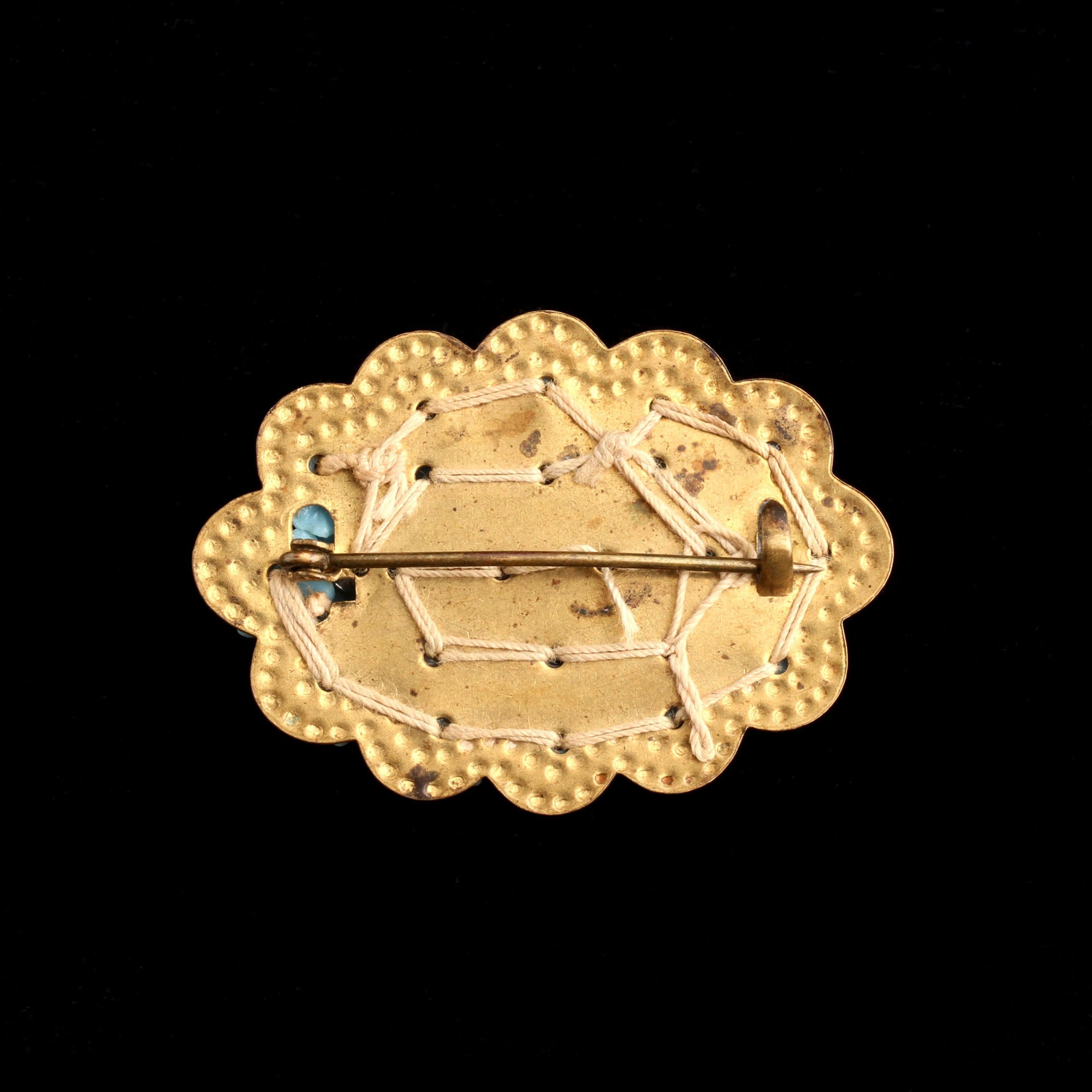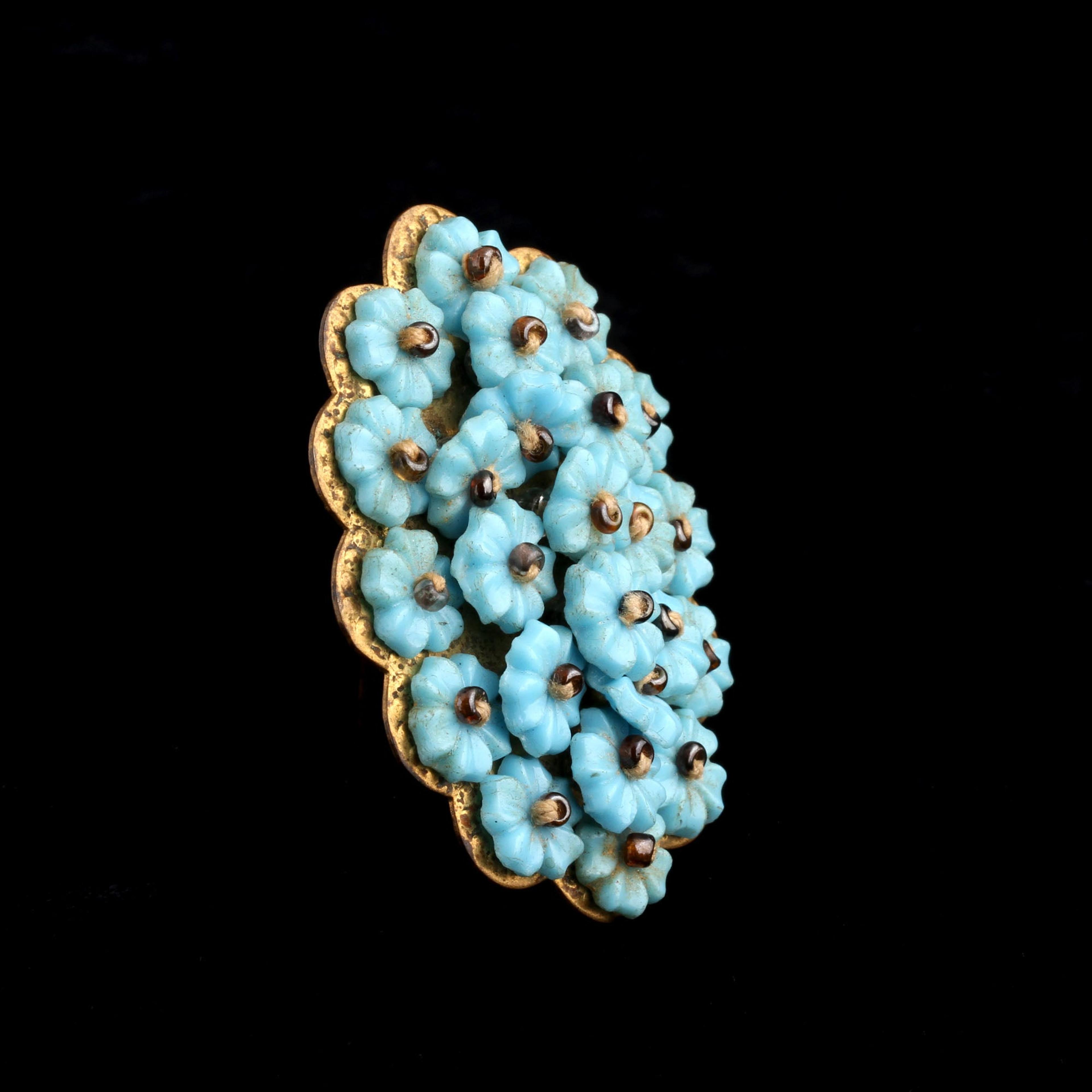 A Victorian brooch featuring a die-stamped brass base with blue glass forget me not beads sewn across the face.