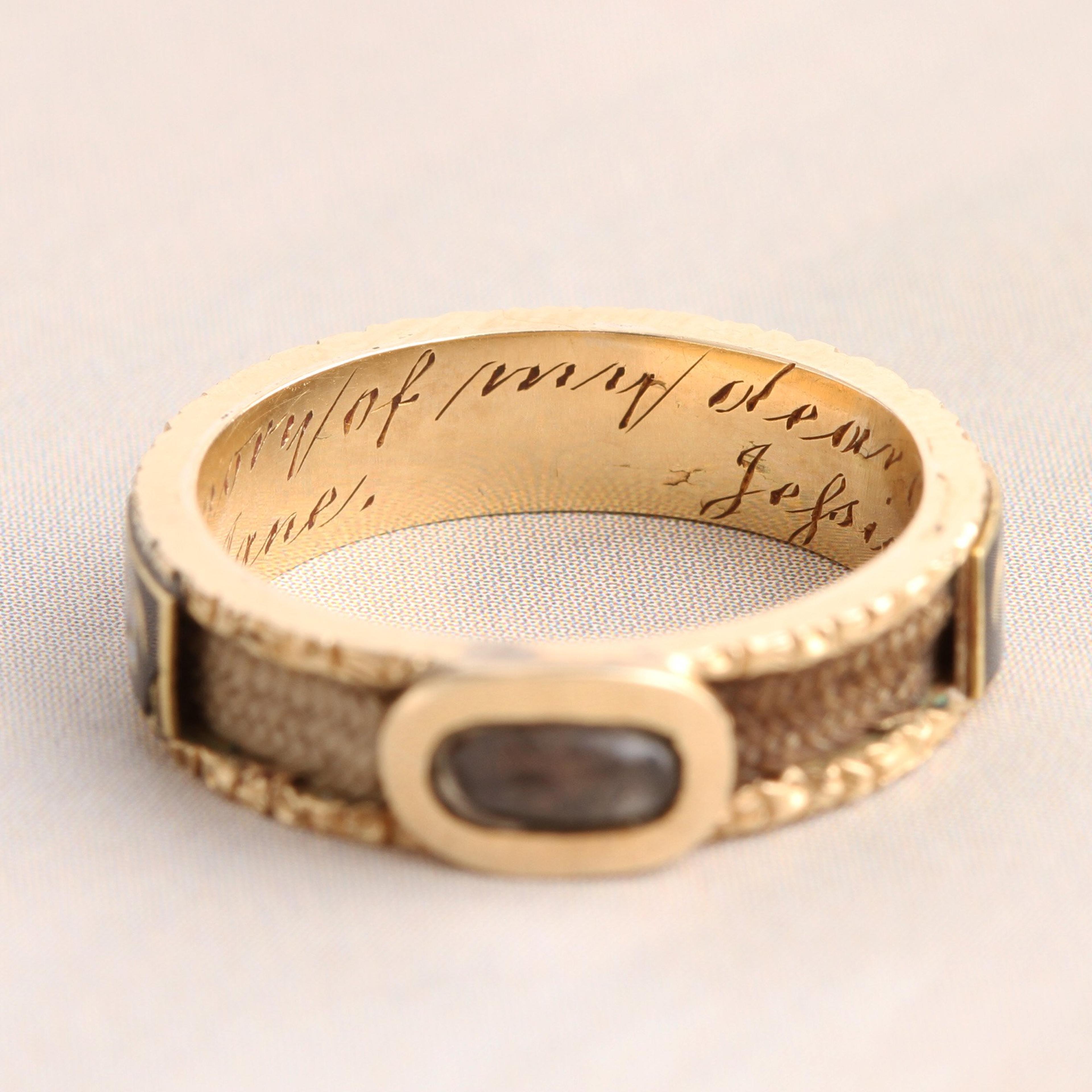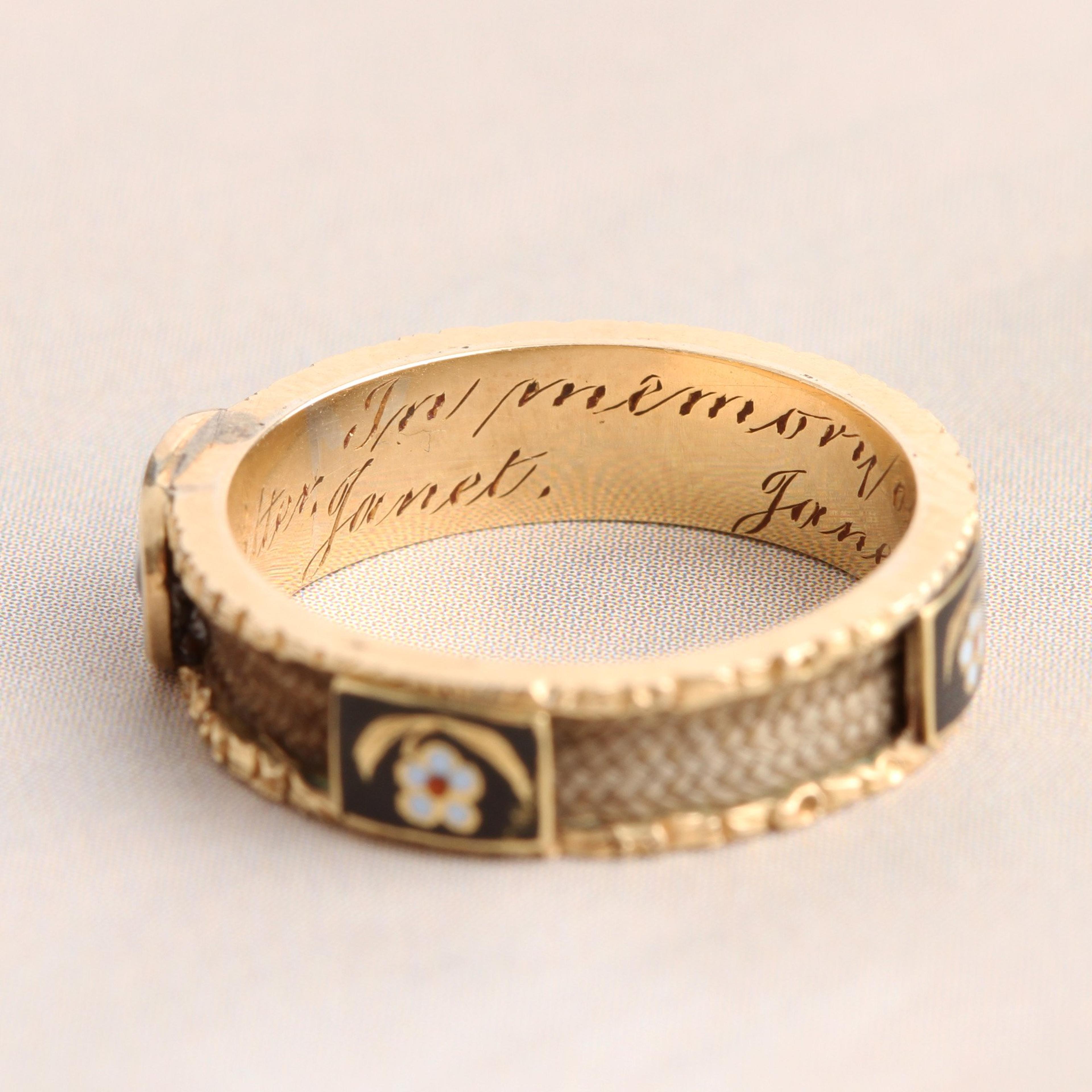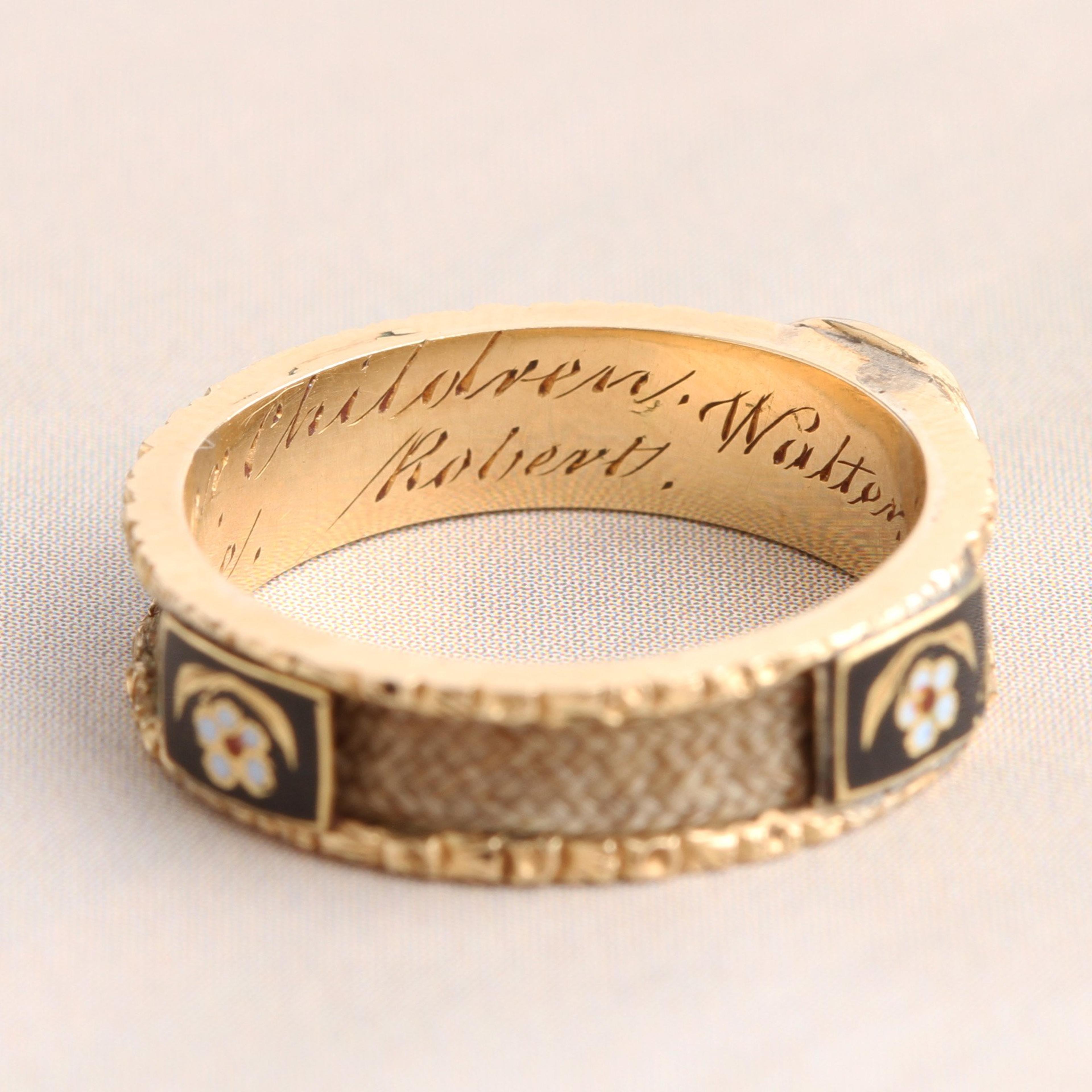 This very special, utterly heartbreaking Victorian mourning ring was commissioned by a mother who outlived her five children. Fashioned in 18k gold, the ring features a hair locket at the face and three interstitial enamel forget me not panels that divide the channel of the hoop into four sections, each of which is inlaid with the hair of a unique individual. The interior is engraved: "In memory of my dear children Walter Janet Jane Jessie Robert."