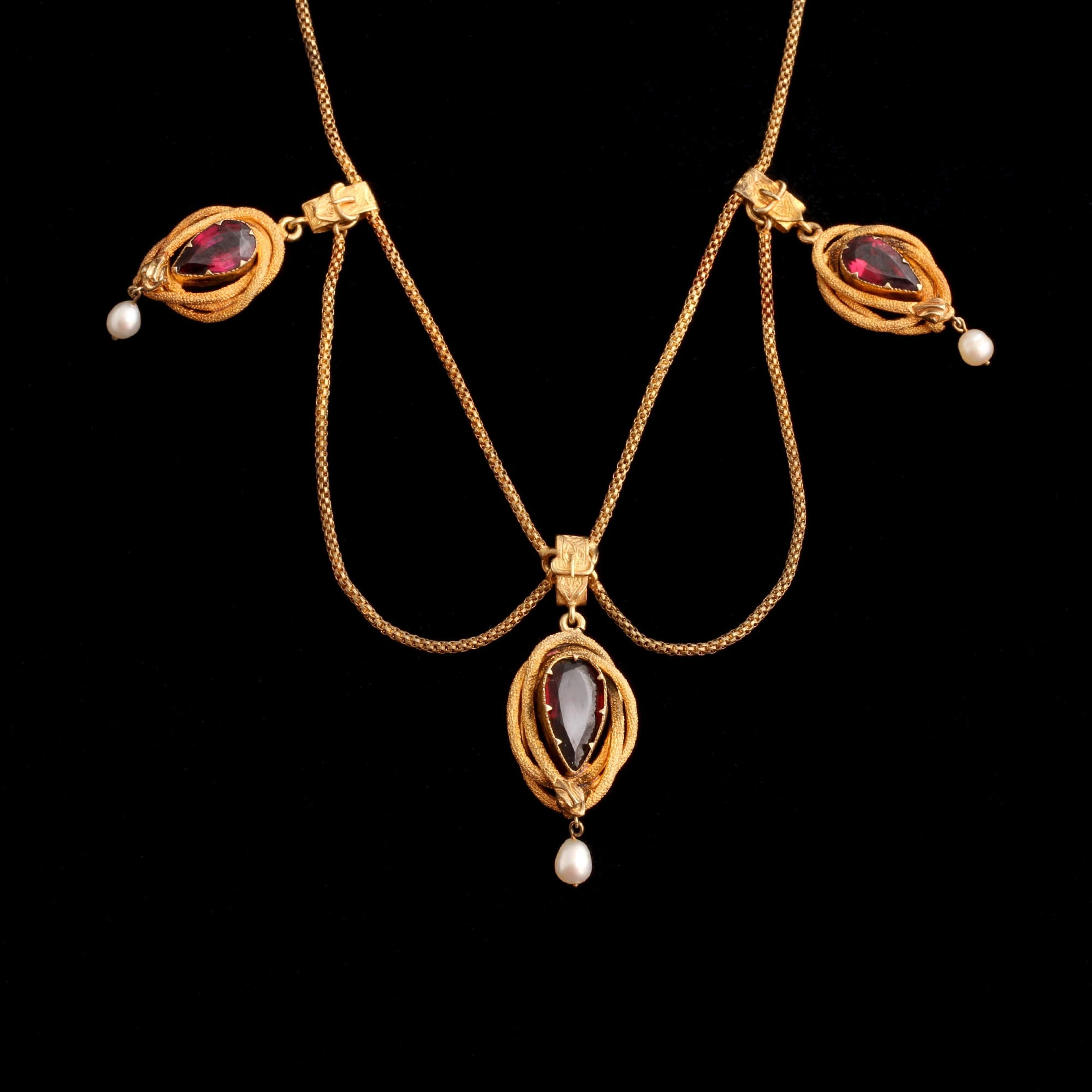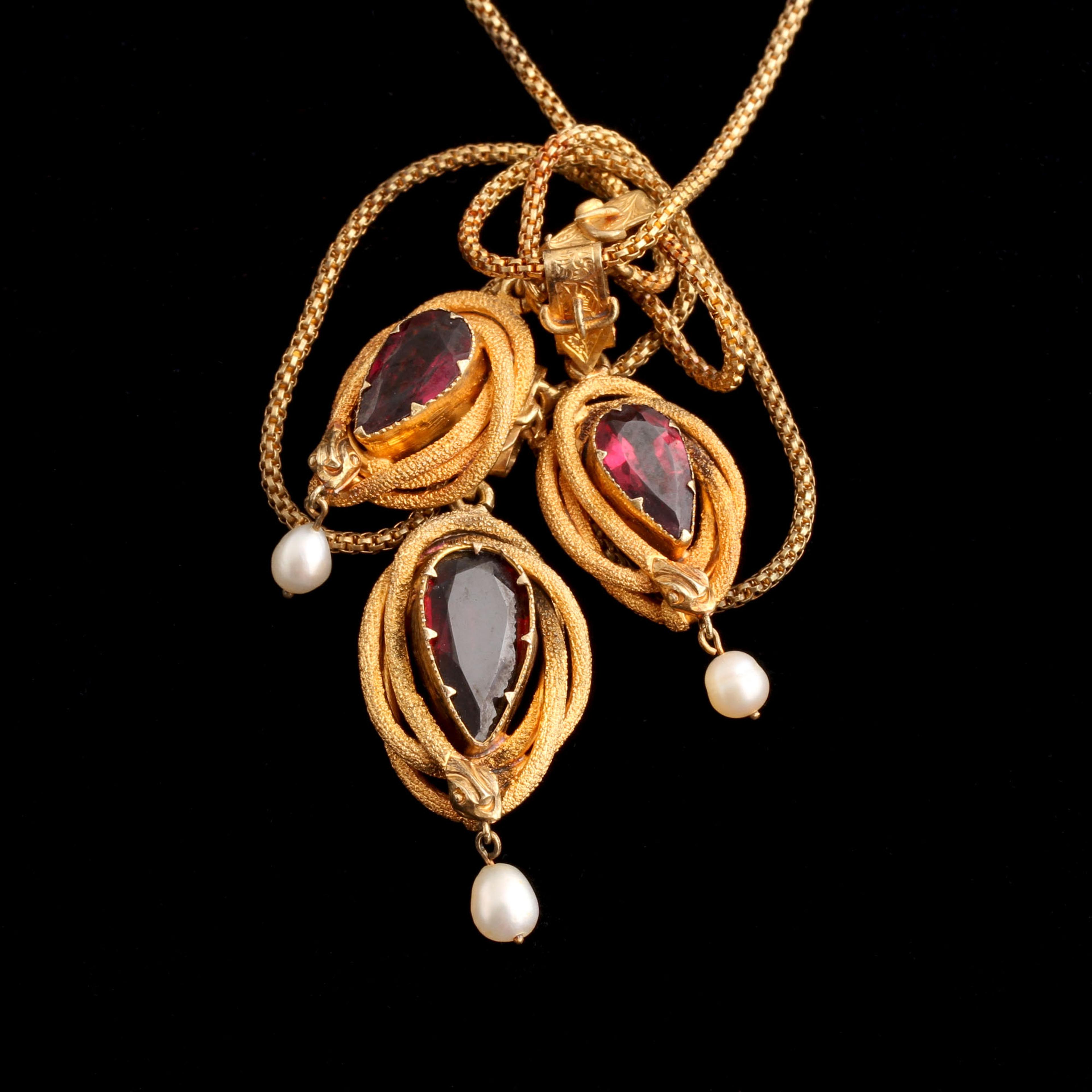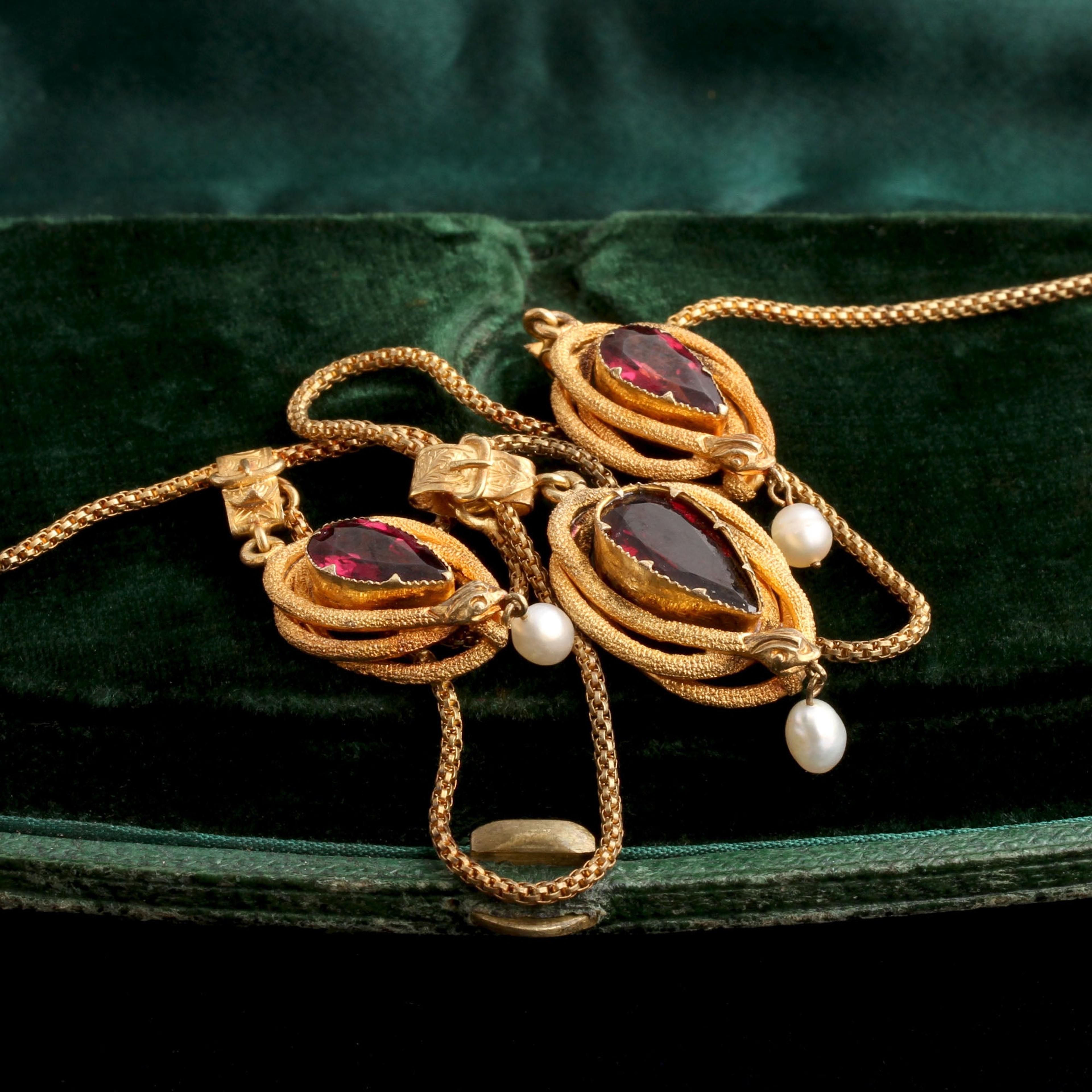 Serpents coil protectively around pear cut almandine garnets, each one holding a freshwater pearl in her mouth. The "everlasting love" theme continues with belt buckle bails holding the snakes to the chain, and a second chain swag adds....swag. This necklace would already have been a remarkable find, but it's still in its original green leather and velvet fitted box.