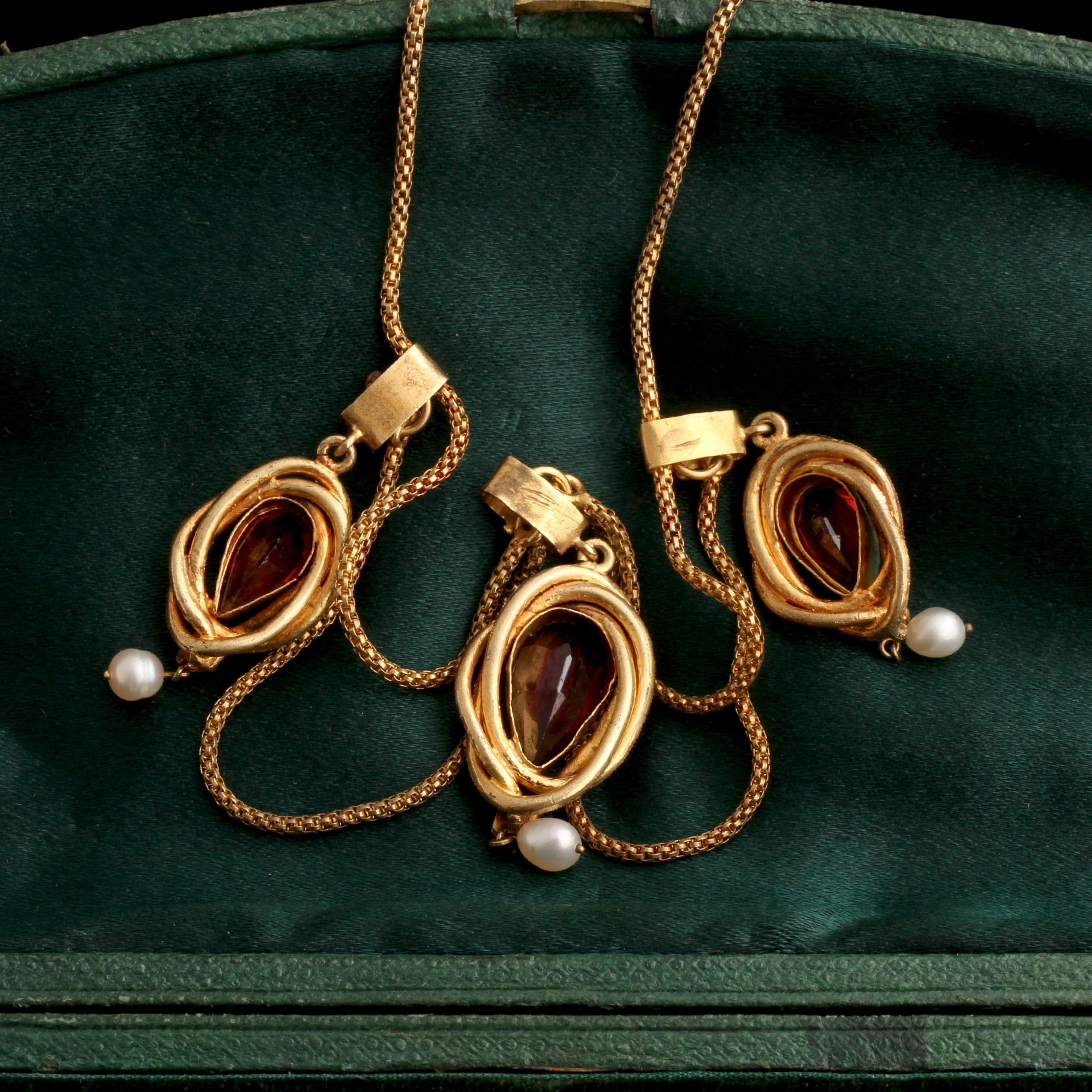 14k gold (tests), 3 pear cut almandine garnets, 3 freshwater pearls, original fitted box
