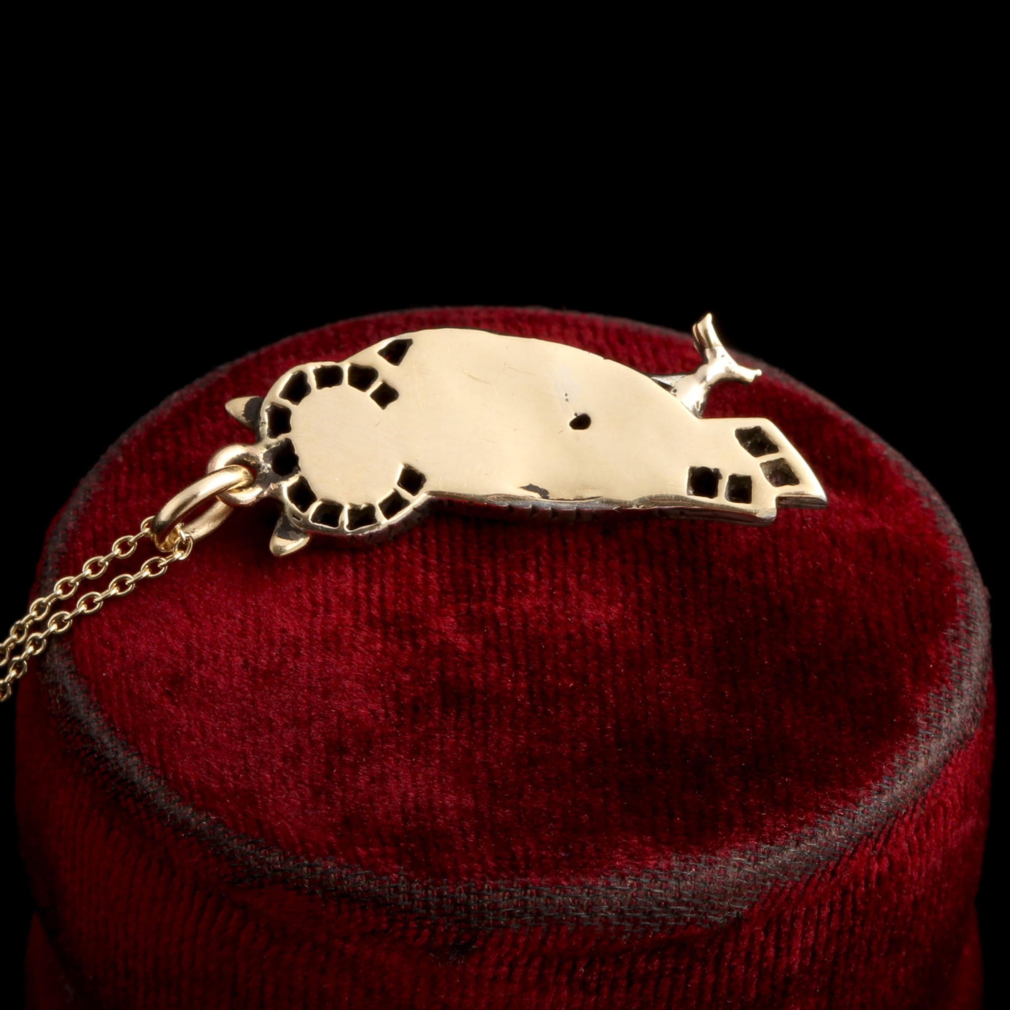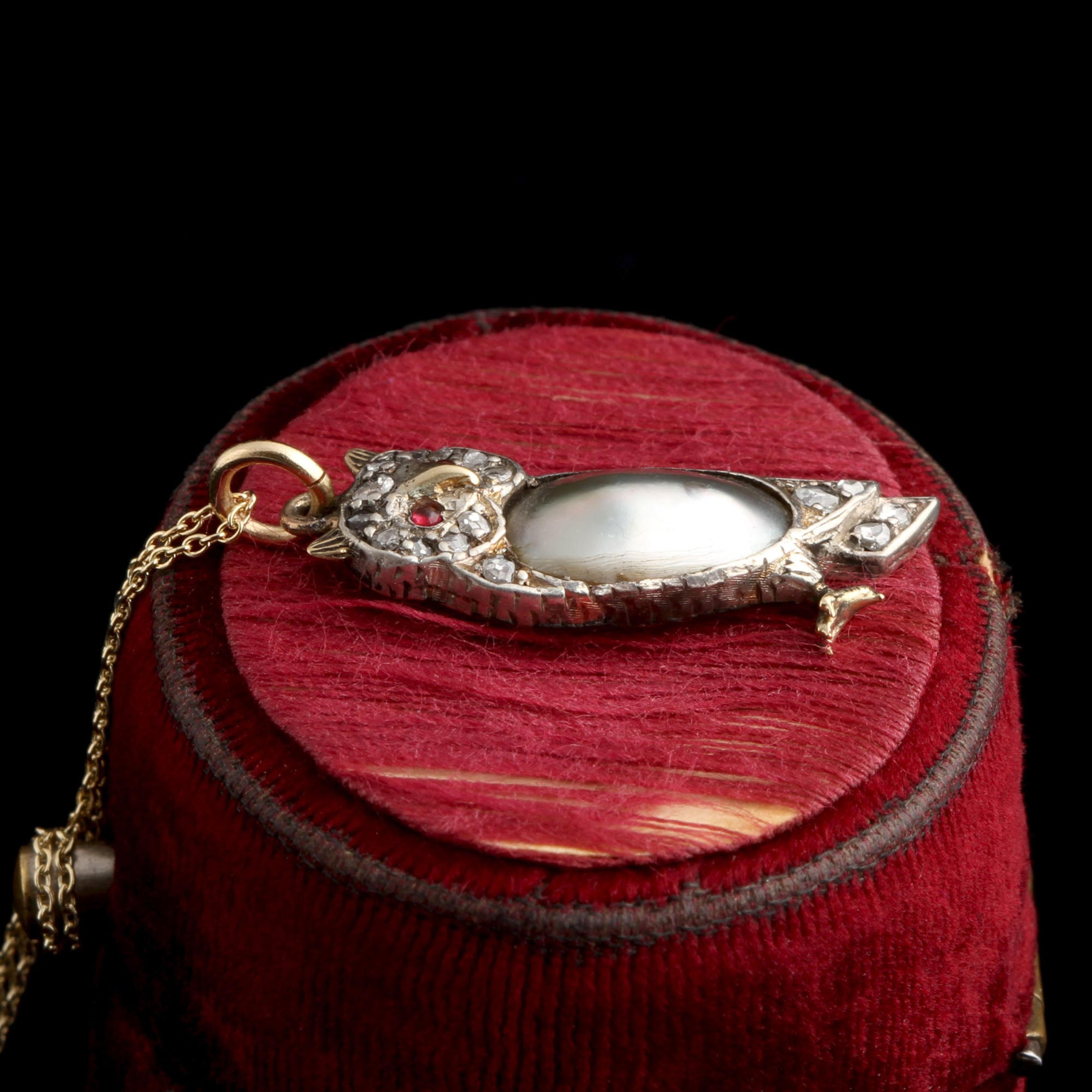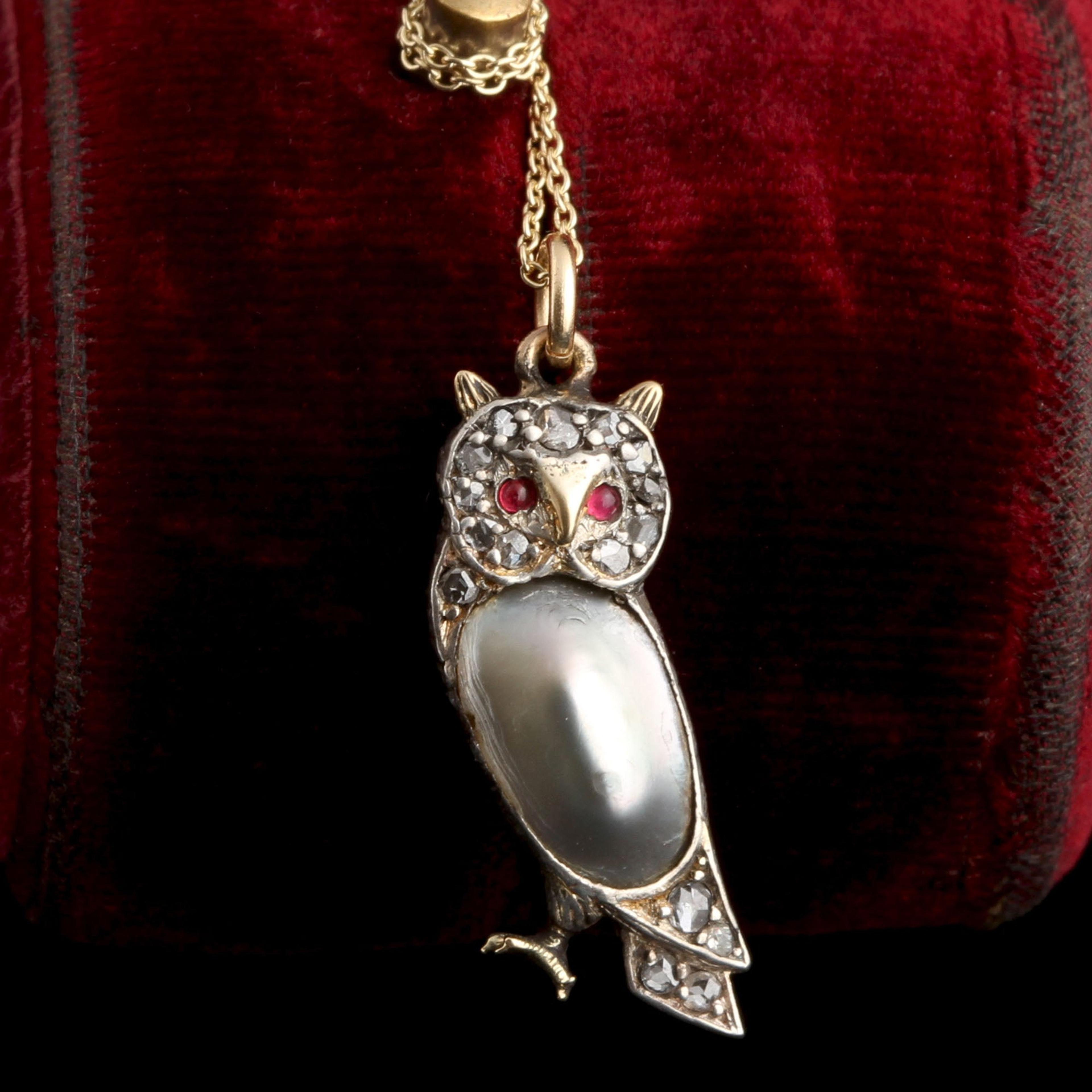 In ancient times, the owl was a symbol for Athena, goddess of wisdom and strategy, before the Greeks gave their divine pantheon human forms. According to myth, an owl sat on Athena's blind side so that she could see the whole truth. This Victorian pendant (formerly a stickpin) features a garnet-eyed owl with rose cut diamonds and a blister pearl.