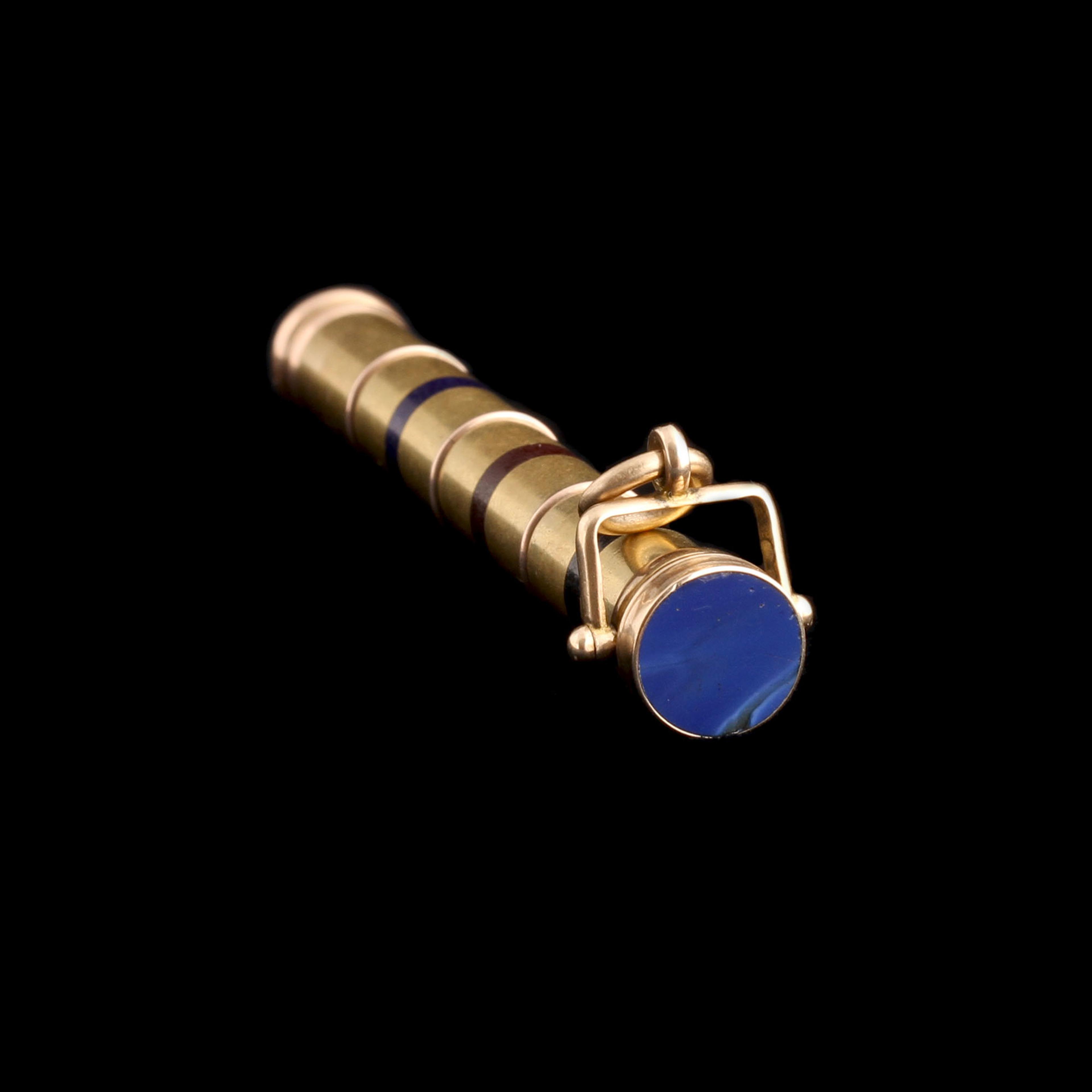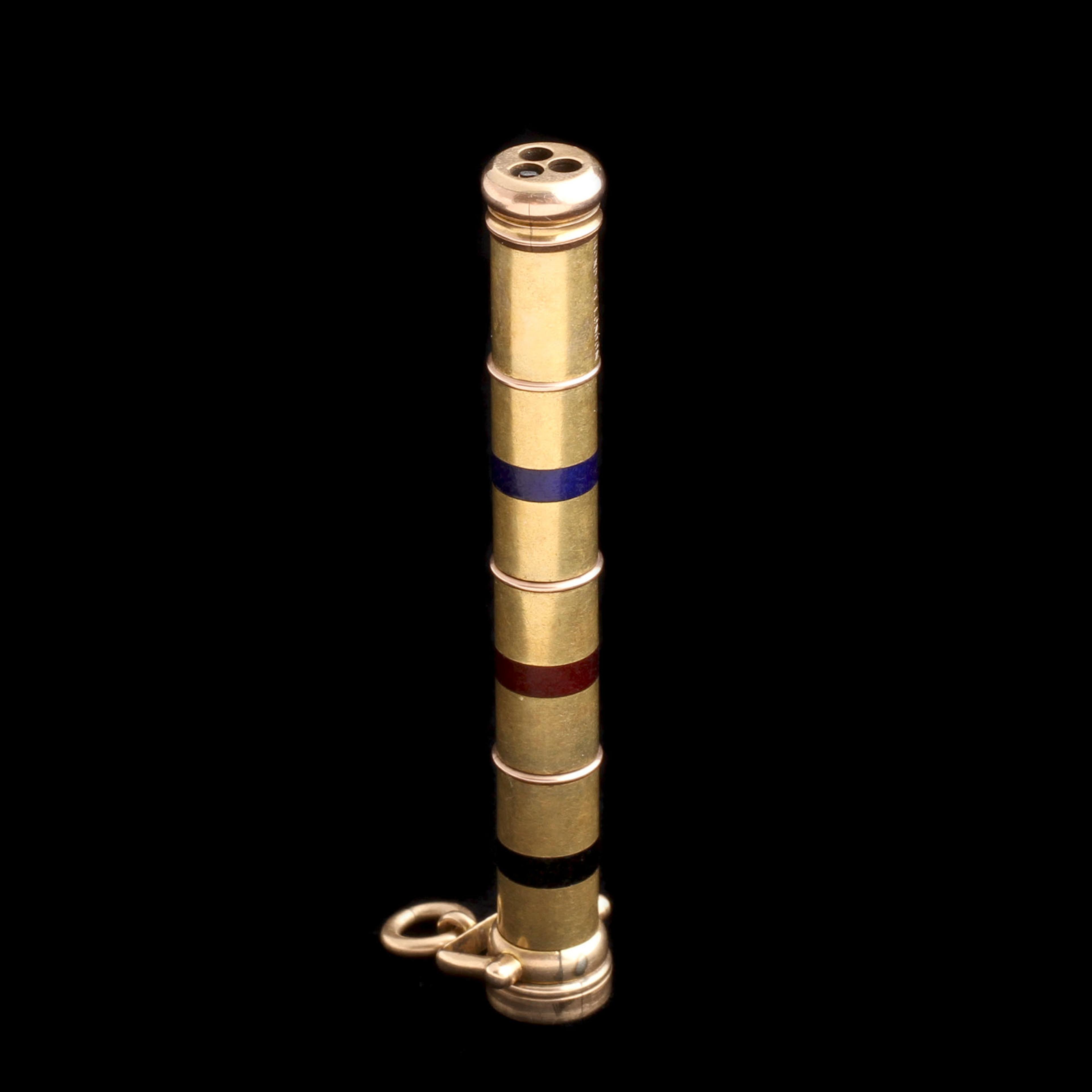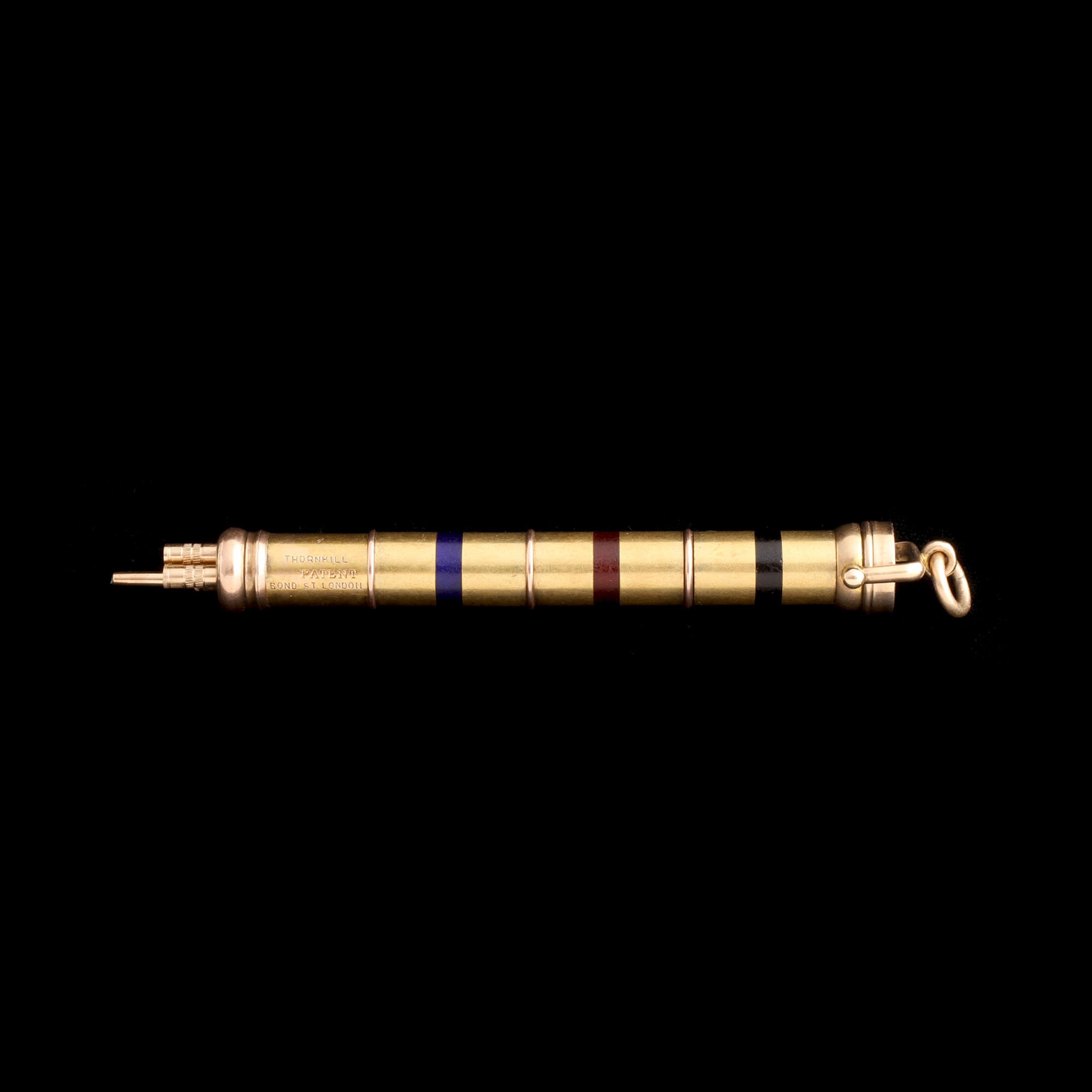 A precision instrument made for a gentleman’s watch chain, this telescoping fob conceals three separate pencil compartments within its gold barrel. The design is attributed to the prestigious London firm Thornhill, known for their innovative writing instruments and fine craftsmanship. These multi-pencil fobs were practical yet luxurious—used to hold colored leads for sketching, drafting, or annotating correspondence. They were often given as gifts to scholars or travelers, embodying the Victorian fascination with ingenuity in miniature form.