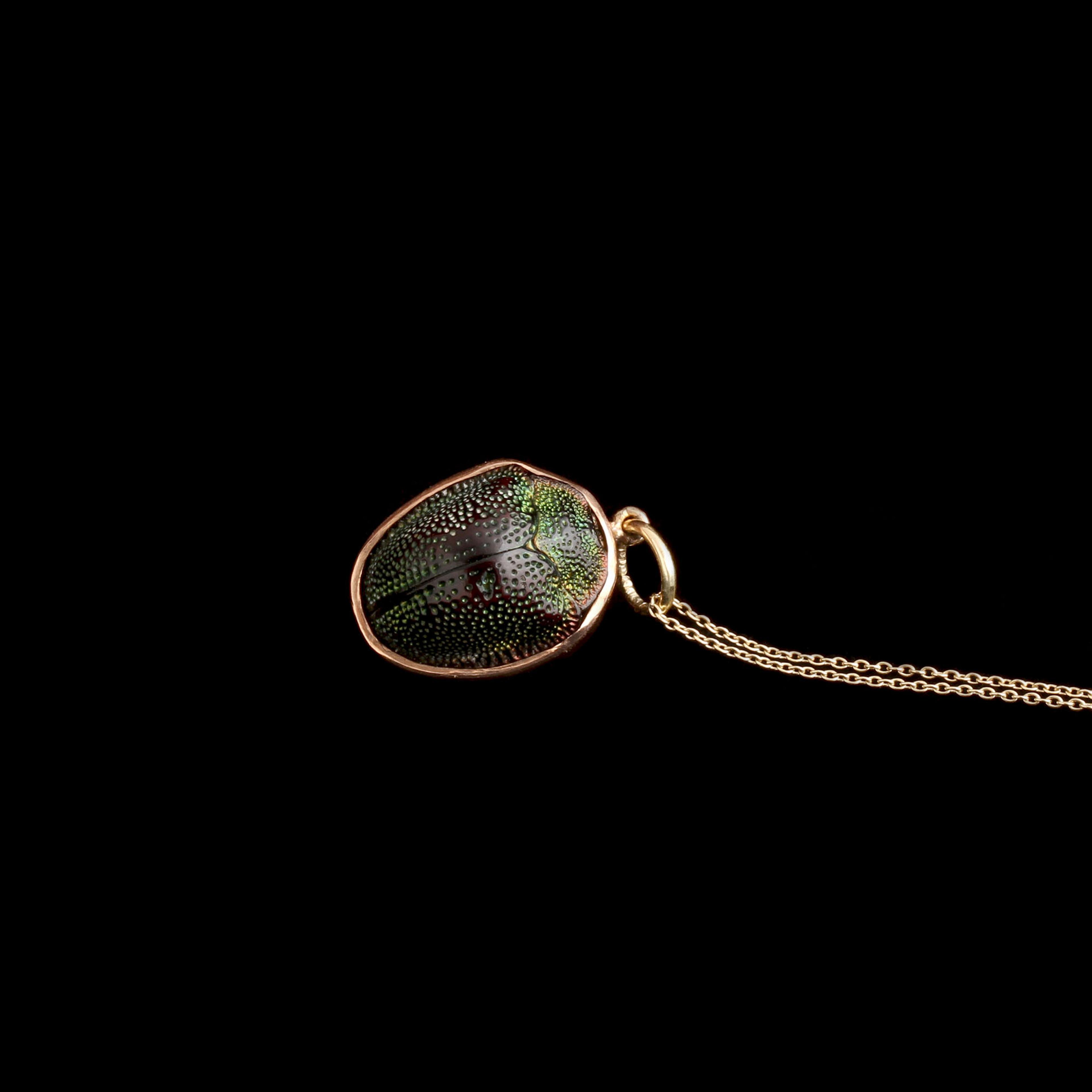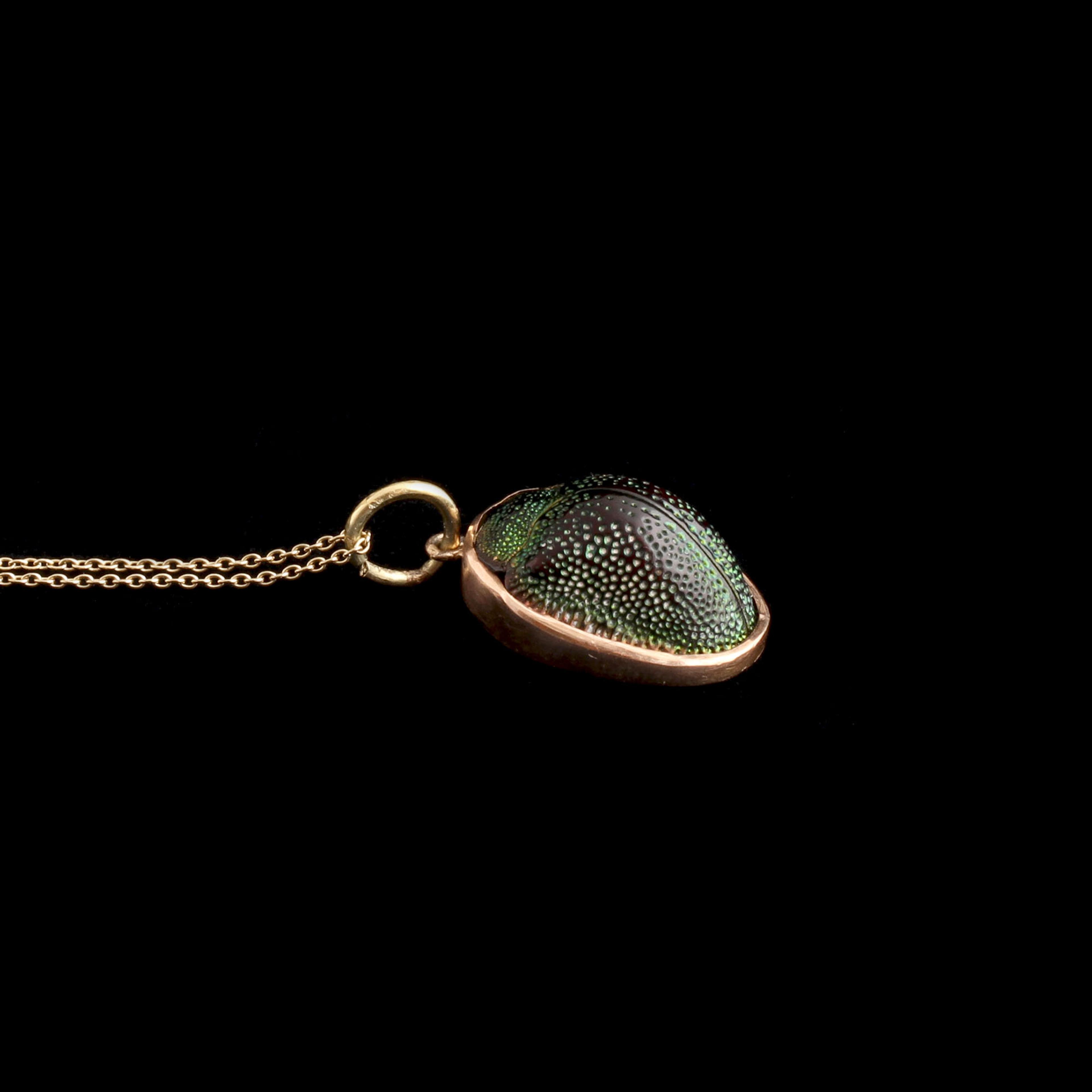 By the late 19th century, archaeological discoveries—sarcophagi, mummies, hieroglyphics—were making headlines across Europe, and Egyptian motifs flooded Western art, fashion, and architecture. And jewelry. This piece draws on the long tradition of carved scarab beetles, ancient symbols of rebirth and renewal, though these examples would have been entirely unfamiliar to ancient Egyptians themselves. The iridescent green beetles used in Victorian jewelry like this were imported from South America. (If you’ve ever seen a true scarab beetle, you’ll know they’re far less cute.) The insect's underside is visible, but it doesn't actually touch your skin - the mounting is built with a little buffer underneath.