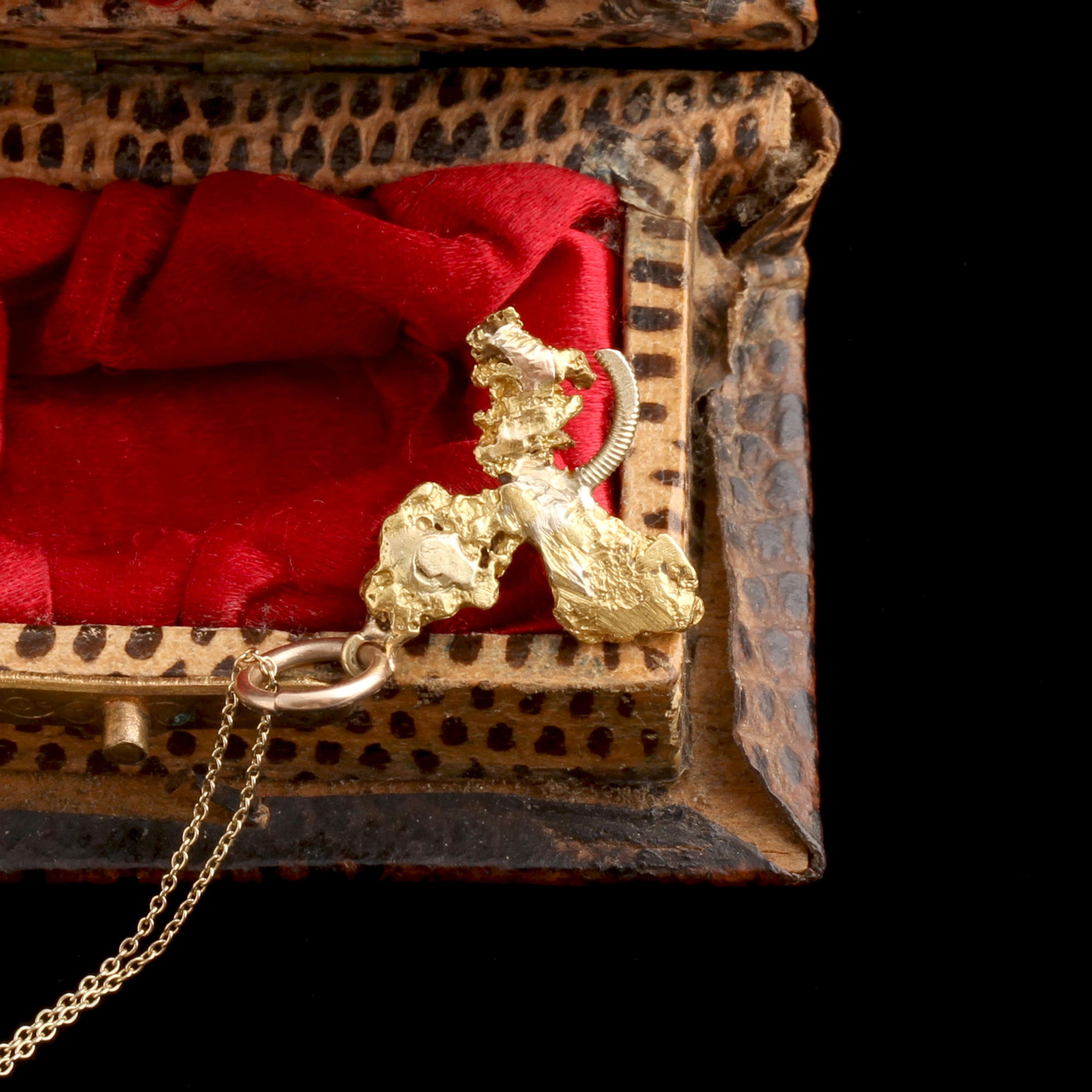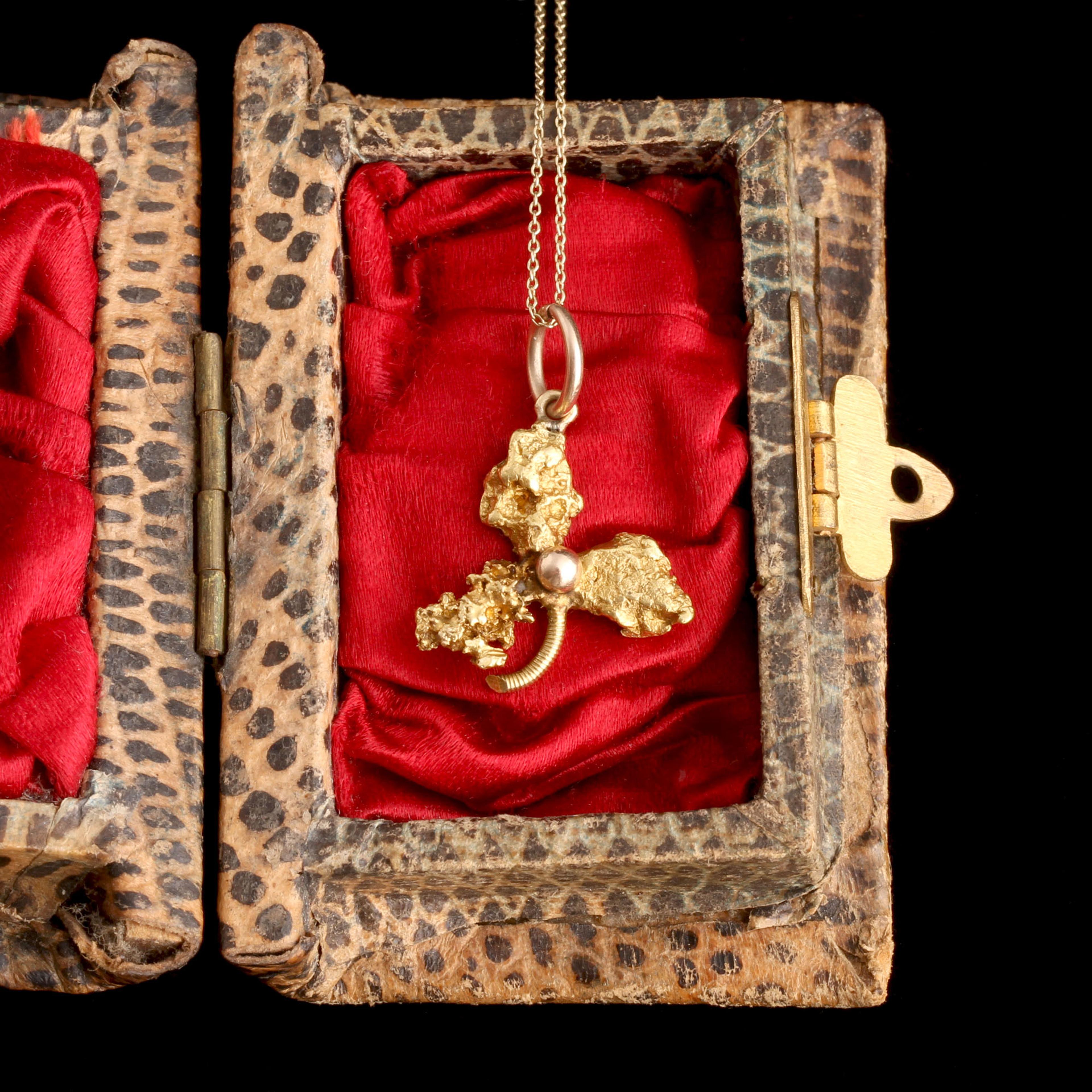 This necklace is a frontier keepsake. It uses three natural gold nuggets to form a shamrock, a motif Victorians loved for its good-luck associations. Unlike polished gold-in-quartz, nugget jewelry keeps the metal exactly as it emerged from the earth. Each lumpy surface and irregular contour is original to the mine, which made these pieces prized souvenirs in mining towns across the American West.