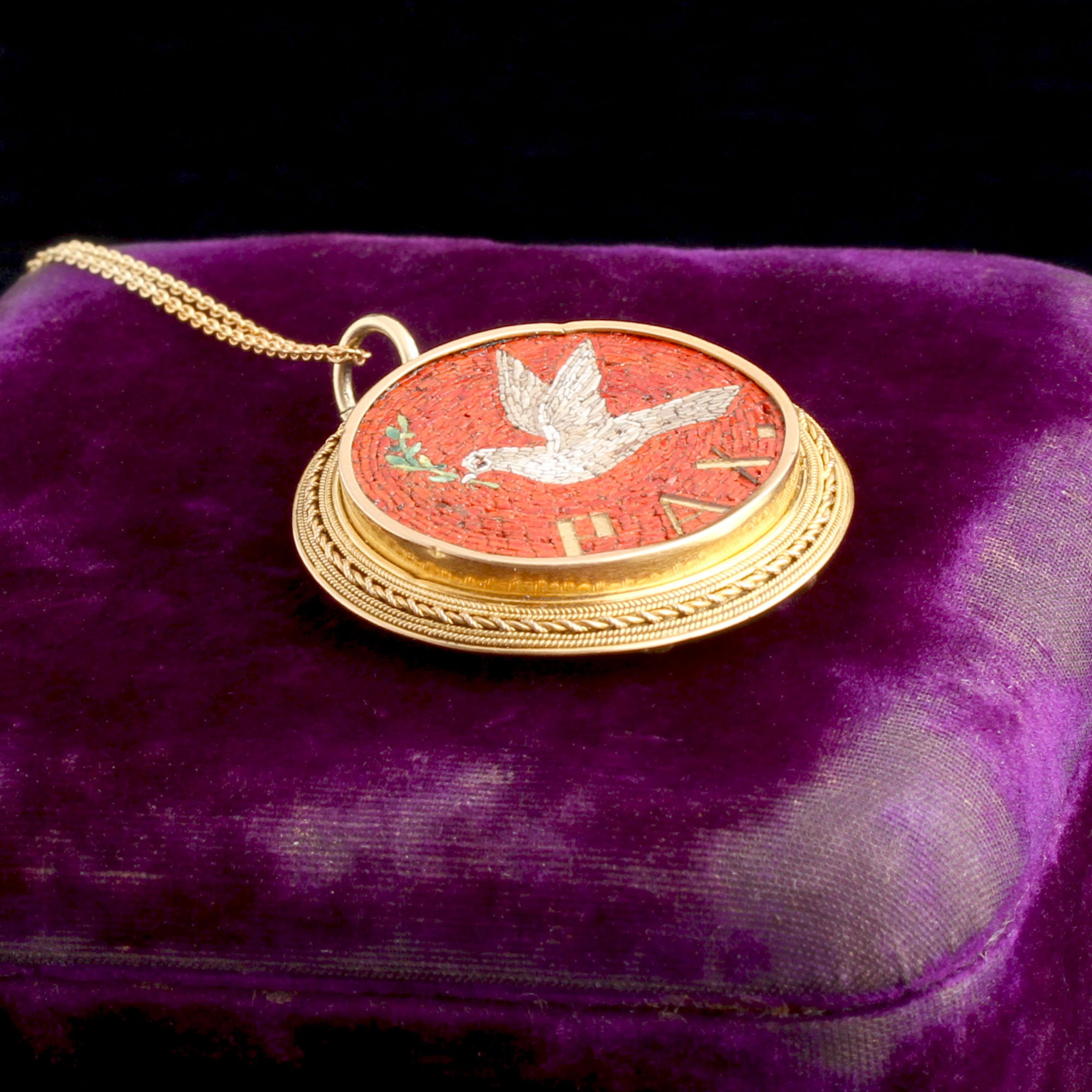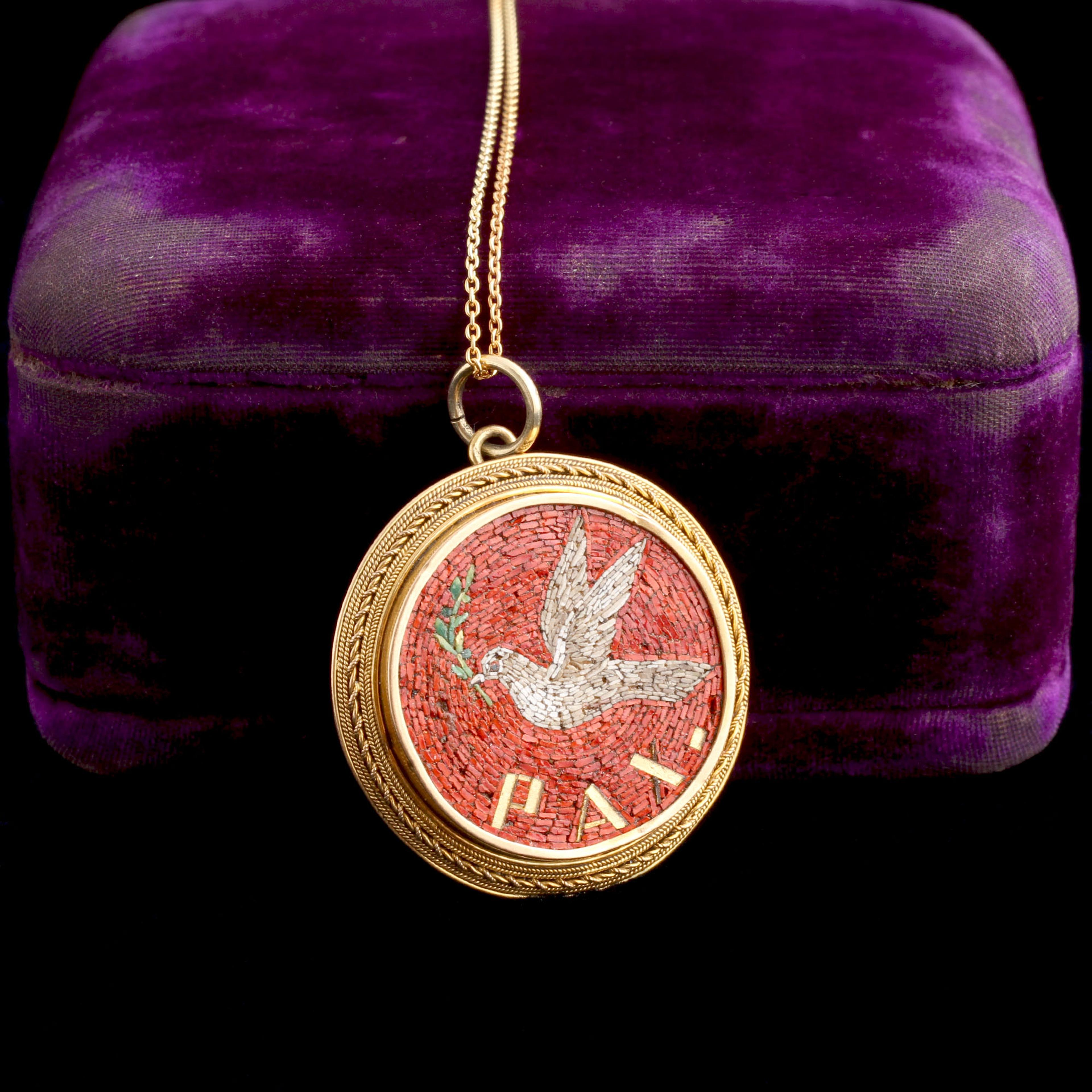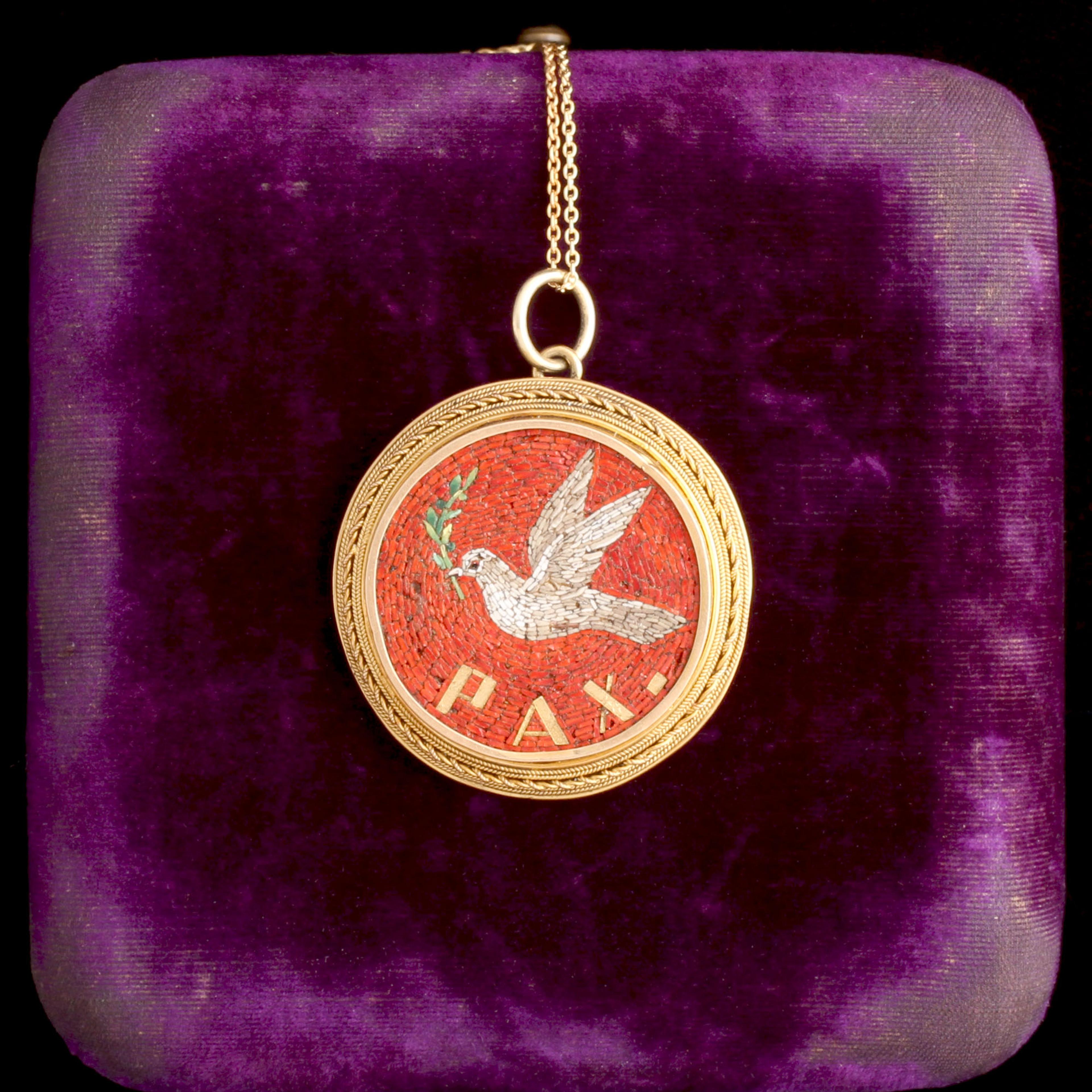 PAX is the Latin word for peace, and the pairing of white dove and olive branch are a timeless symbol. The image of the dove as a peace-bringer has ancient roots and resonated with 19th century travelers steeped in Classical ideas and post-Napoleonic nostalgia. A well-educated traveler would have picked up a souvenir like this at one of the micromosaic workshops near the Vatican. Did the original owner love the vibrant red-orange tesserae as much as I do?
