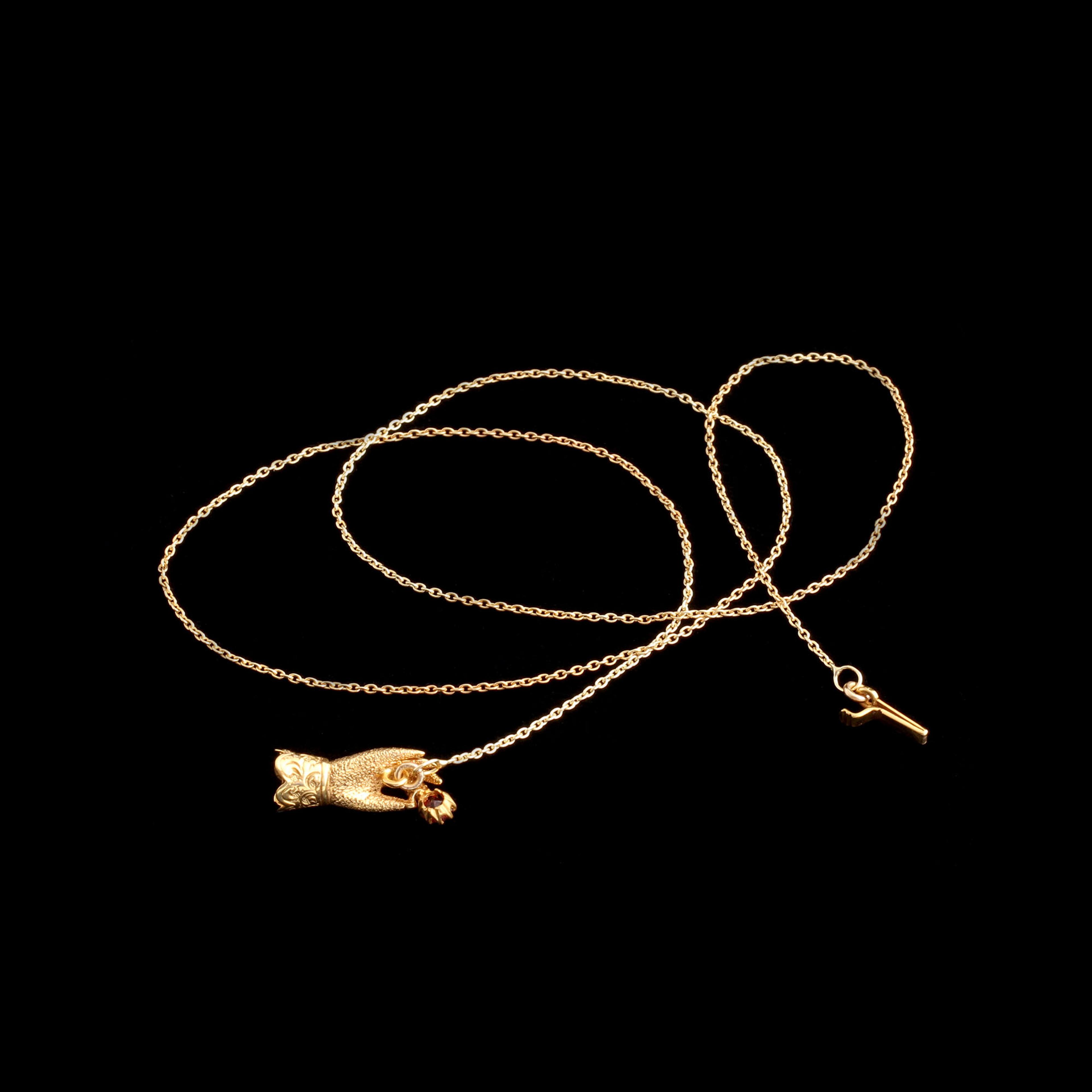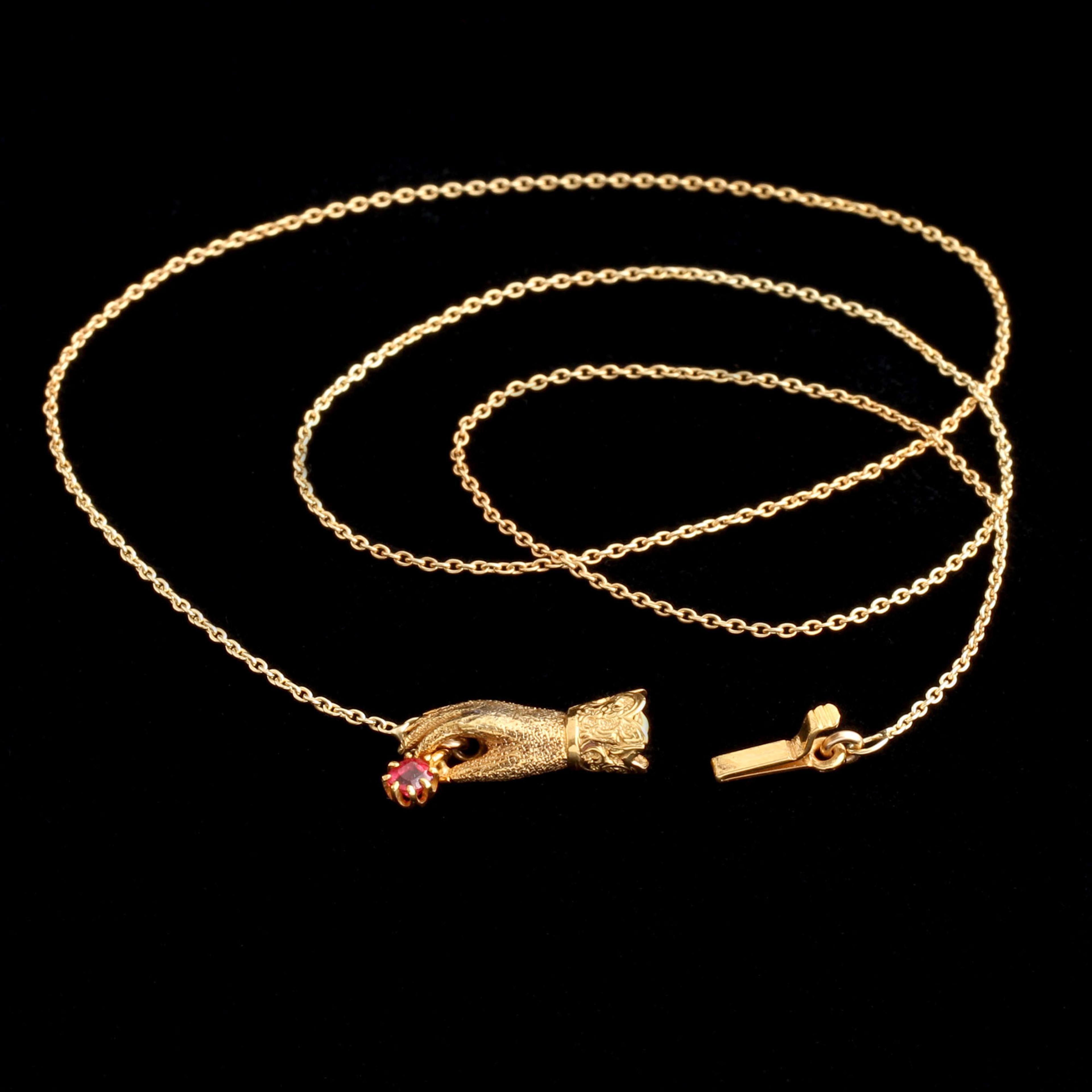 Give yourself a hand. The clasp, itself clasping a ruby, was pilfered from a Georgian necklace. We found it sadly alone, but gave it new life with a slim gold chain.