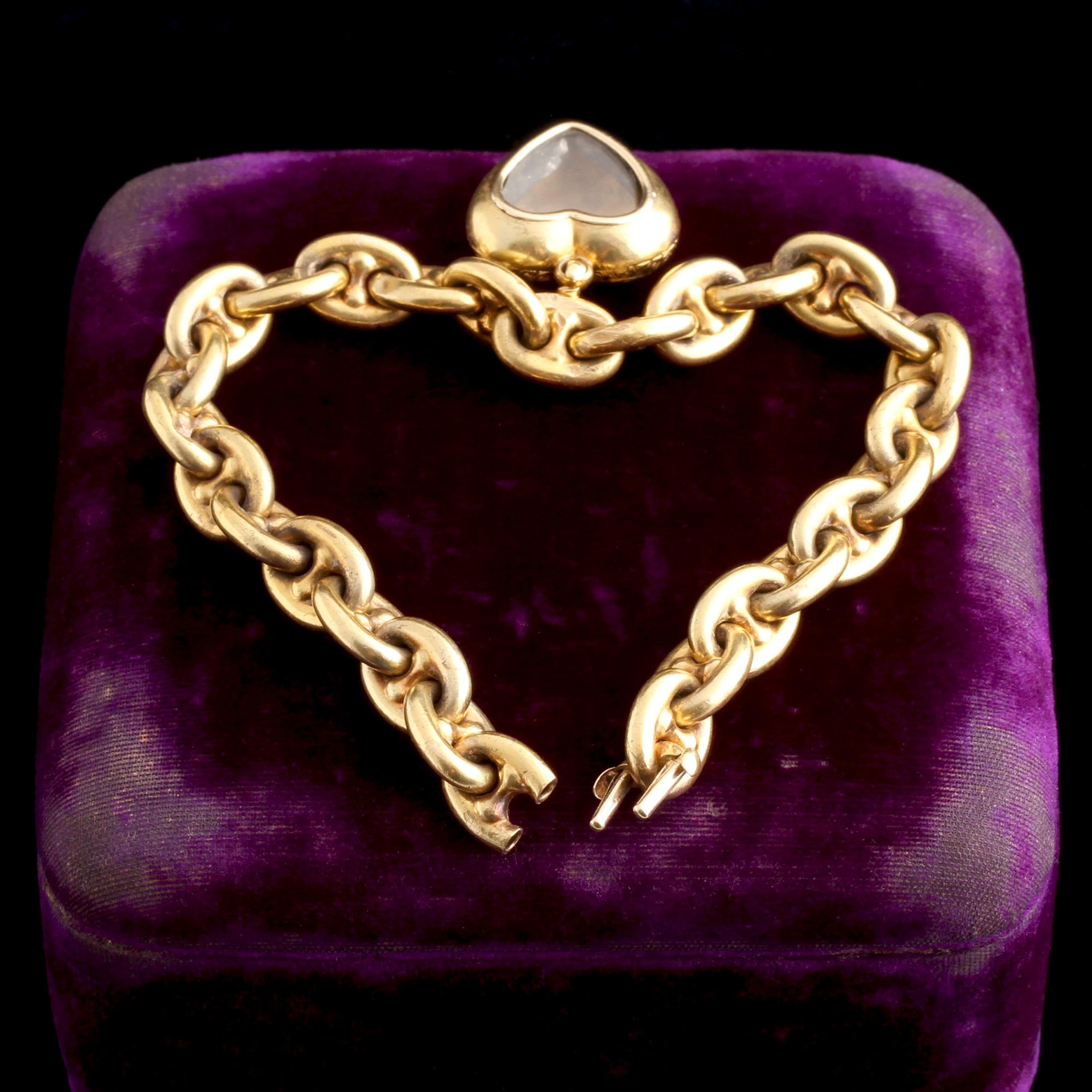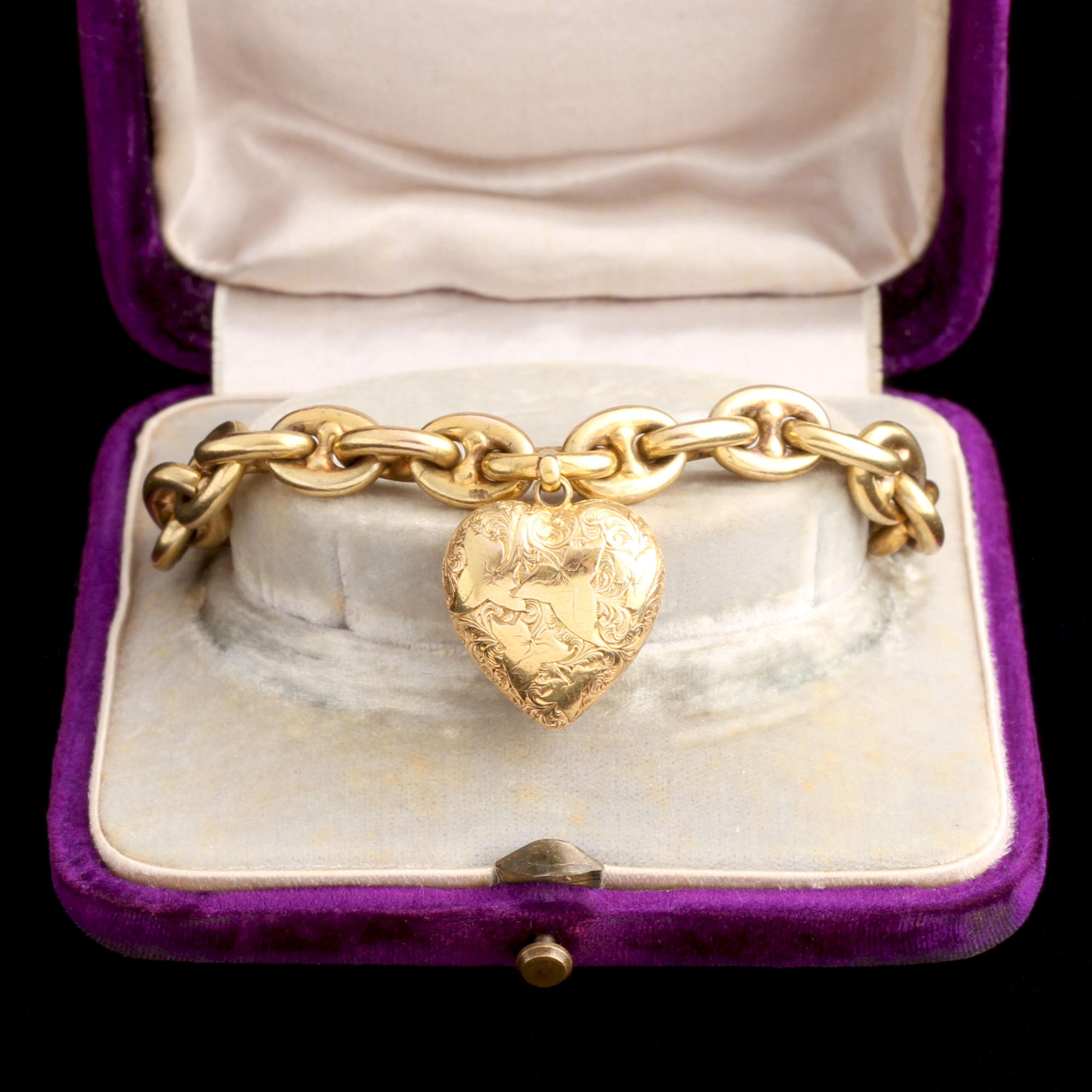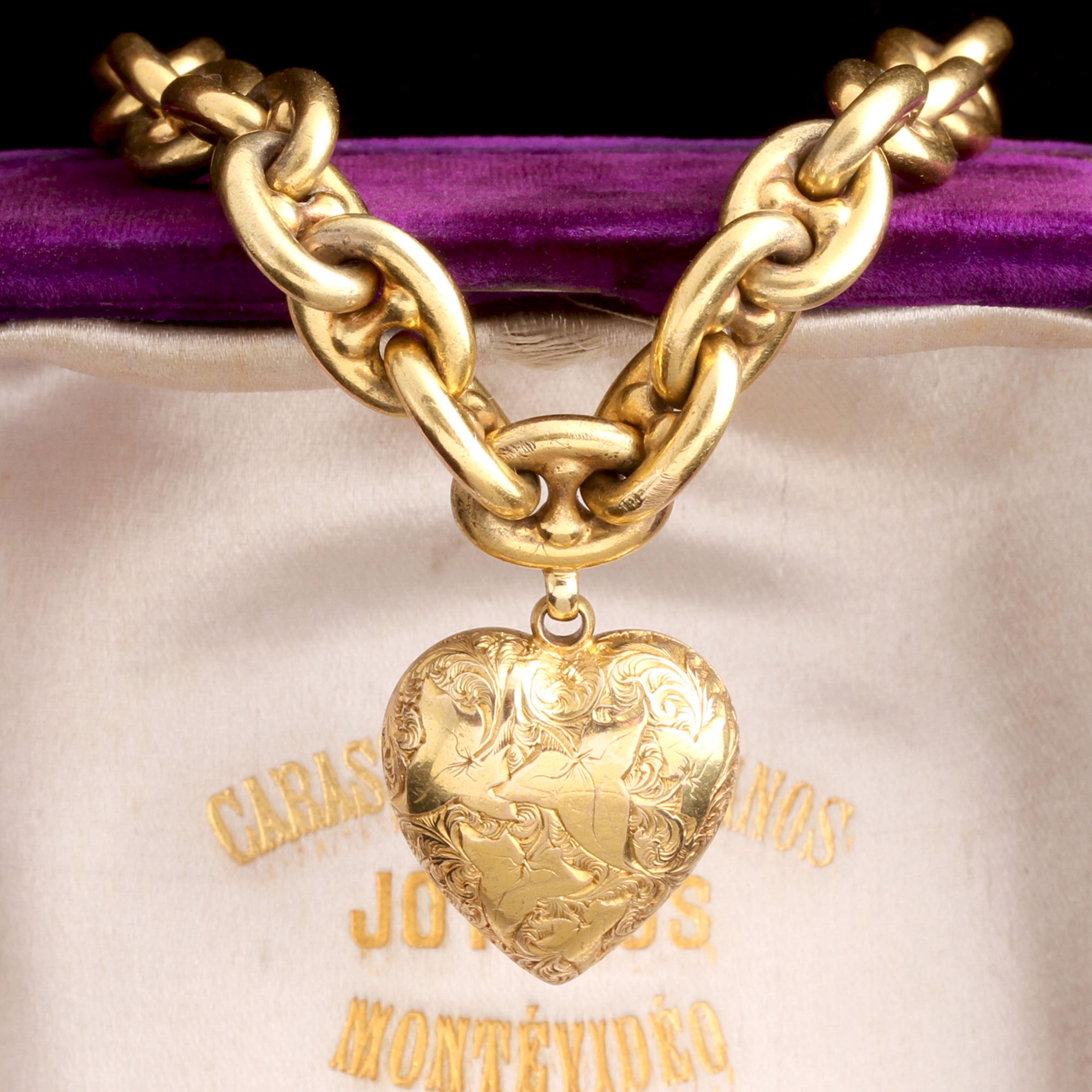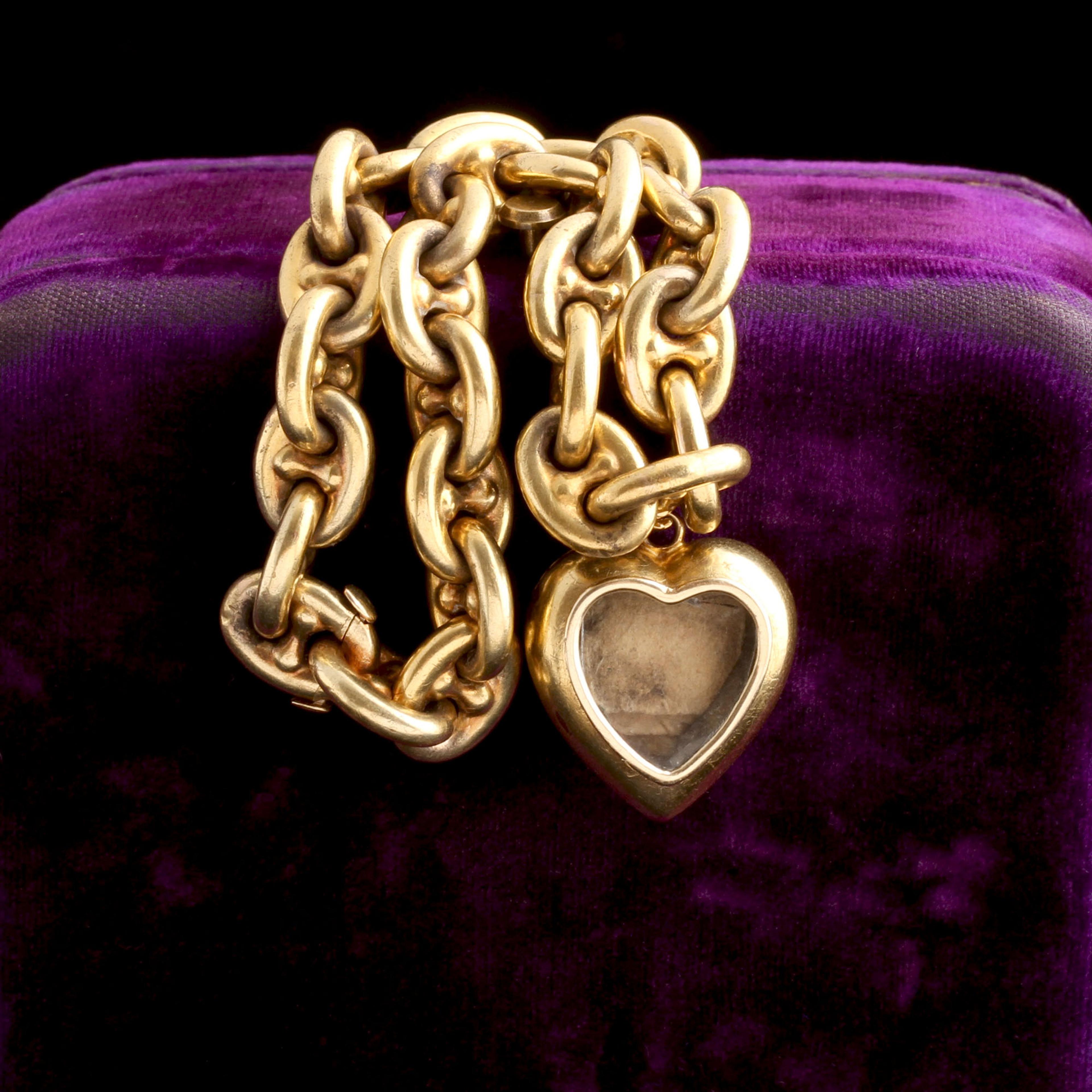 A heavy 18k gold mariner chain holds a dangling heart locket. You can put whatever you like inside, but it was likely made to hold a twist of hair. We were surprised to find not hair, but a poem behind the glass, cut from a book: There must be stones in our path you know/they test our strength and 'tis better so/ Only I wish you may find/ a friend to help you both strong and kind.
