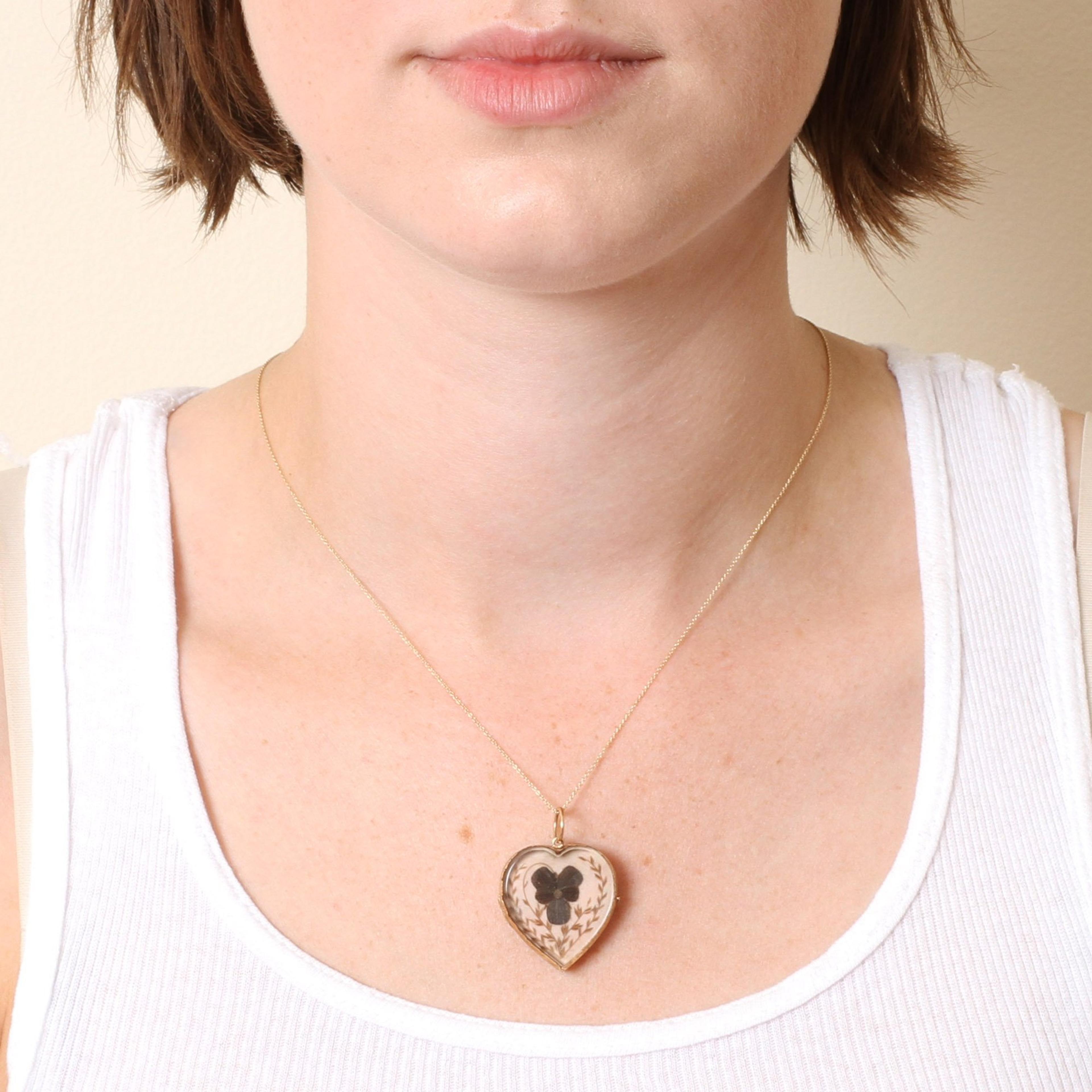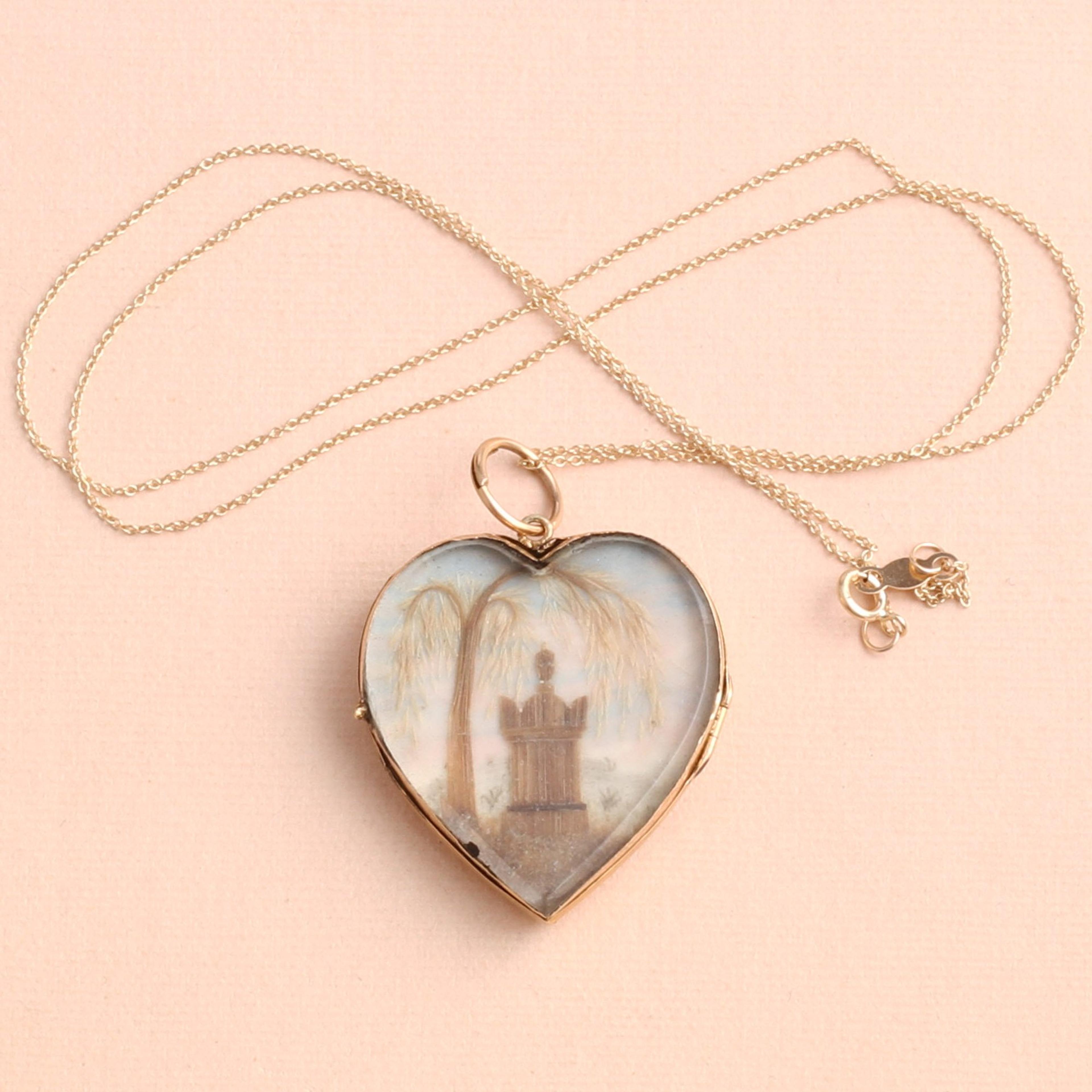 This exquisite late Georgian or early Victorian heart-shaped mourning locket features two lovely scenes composed using strands of human hair. One side features a pansy in a stylized leaf surround. "Pansy" comes from the French pense meaning "to think." Lovers of a hidden meaning, the five-petaled flower was frequently used in 18th and 19th century jewelry to express the sentiment "think of me." The obverse features a beautifully rendered mourning scene with a gravestone beneath a weeping willow. The use of hair in memorial or love token jewelry was incredibly common in the 18th and 19th centuries. In the days before the photograph, locks of hair (or incredible art works made from hair like this locket!) were a physical reminder of a loved one. The sentiment behind the use of hair in memorial jewelry is beautifully described in this quote from the 1860 Godey's Lady's Book: "Hair is at once the most delicate and lasting of our materials and survives us like love. It is so light, so gentle, so escaping from the idea of death, that, with a lock of hair belonging to a child or friend, we may almost look to heaven and compare notes with angelic nature, may almost say: 'I have a piece of thee here, not unworthy of thy being now.'"