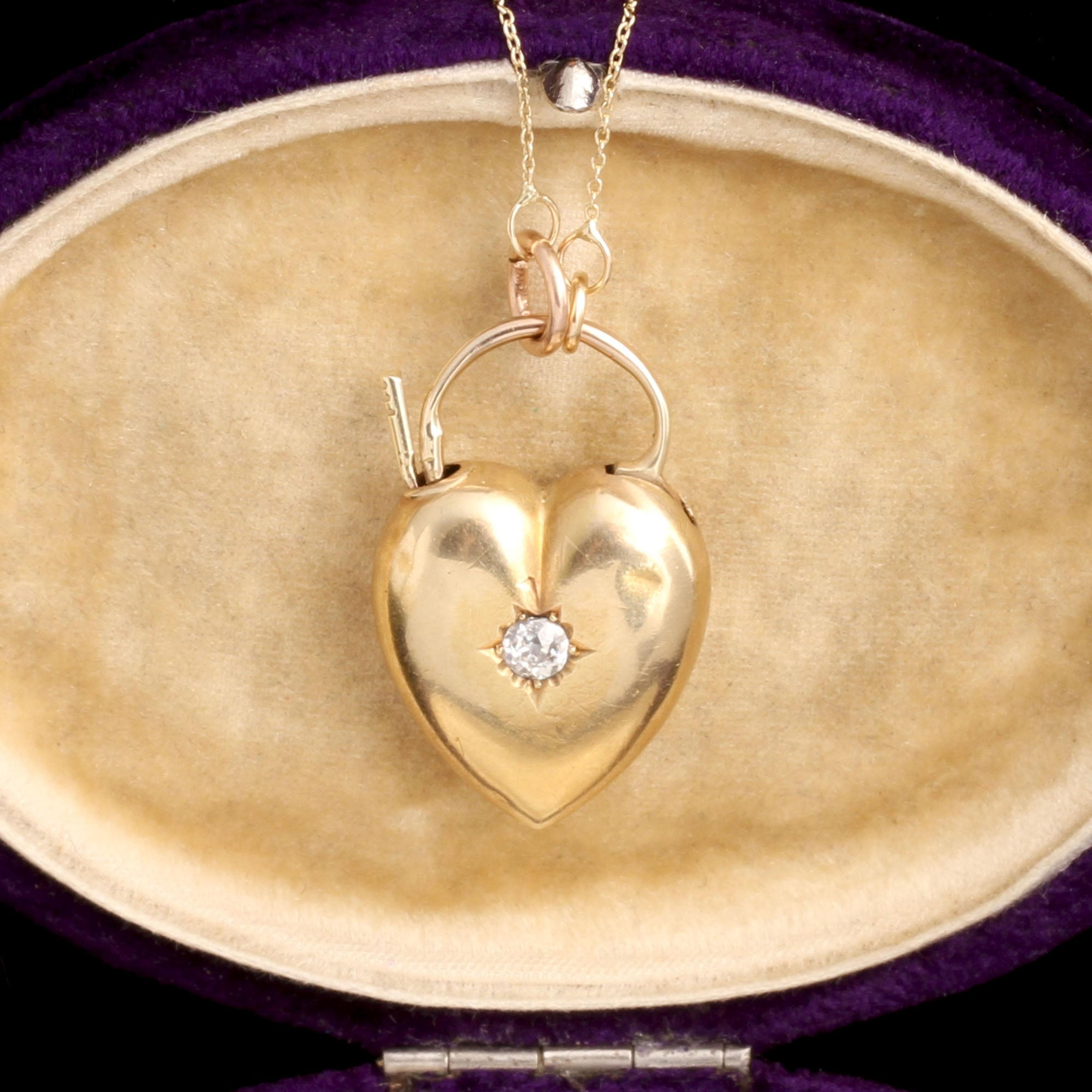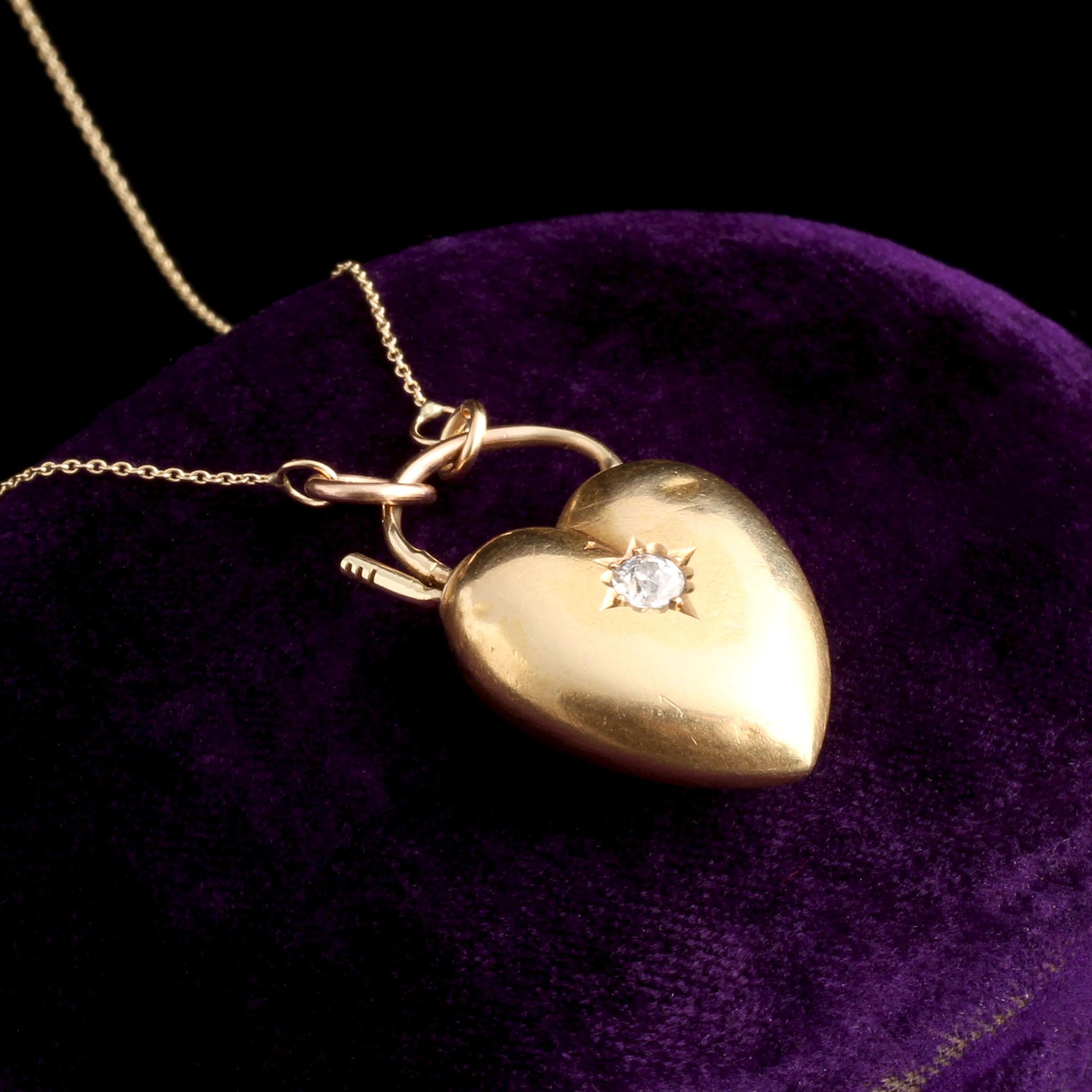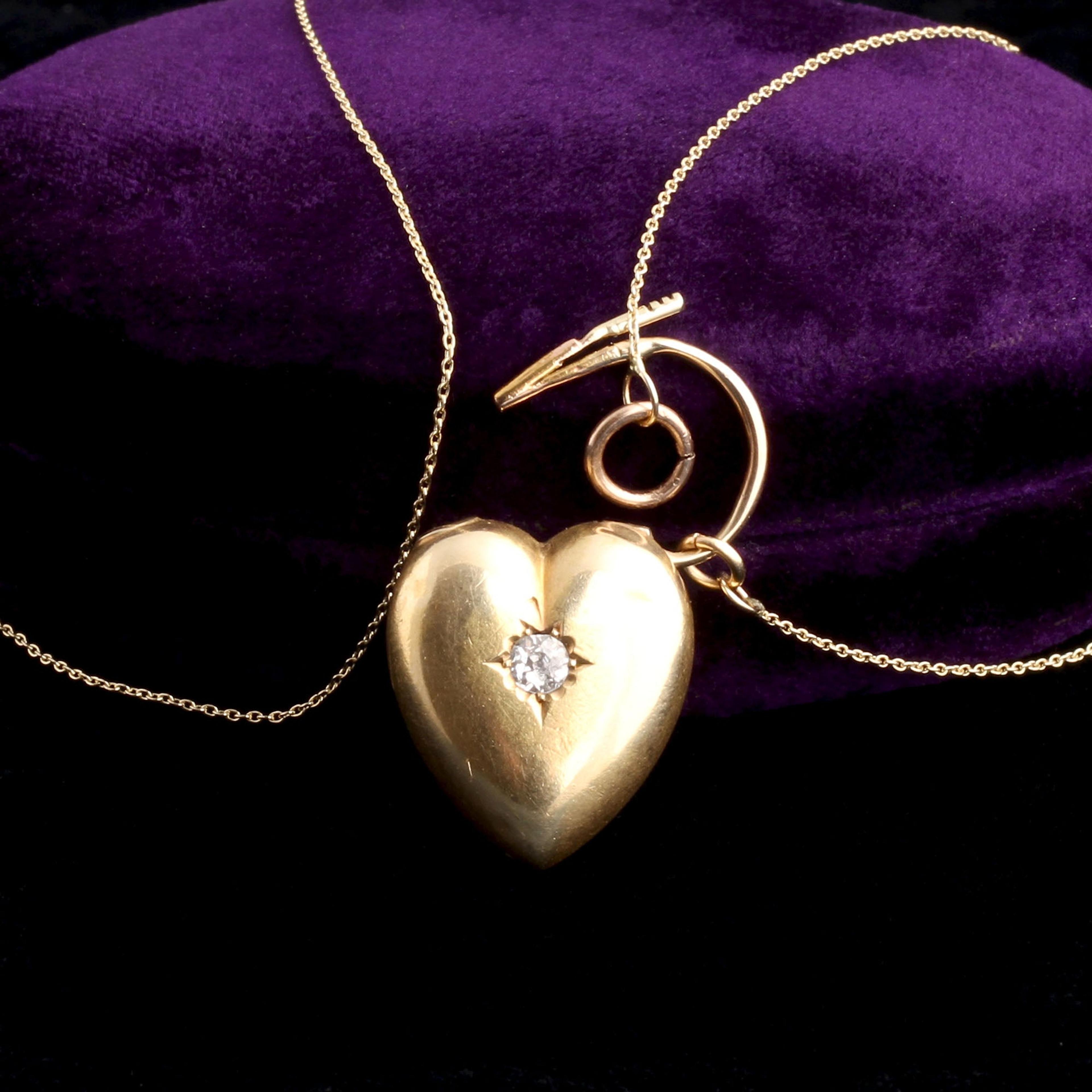 An especially lovely and unusual Victorian heart-shaped padlock with a bright old European cut diamond set within an ivy leaf. We've added a new 18" 14k gold chain to make it into a necklace.