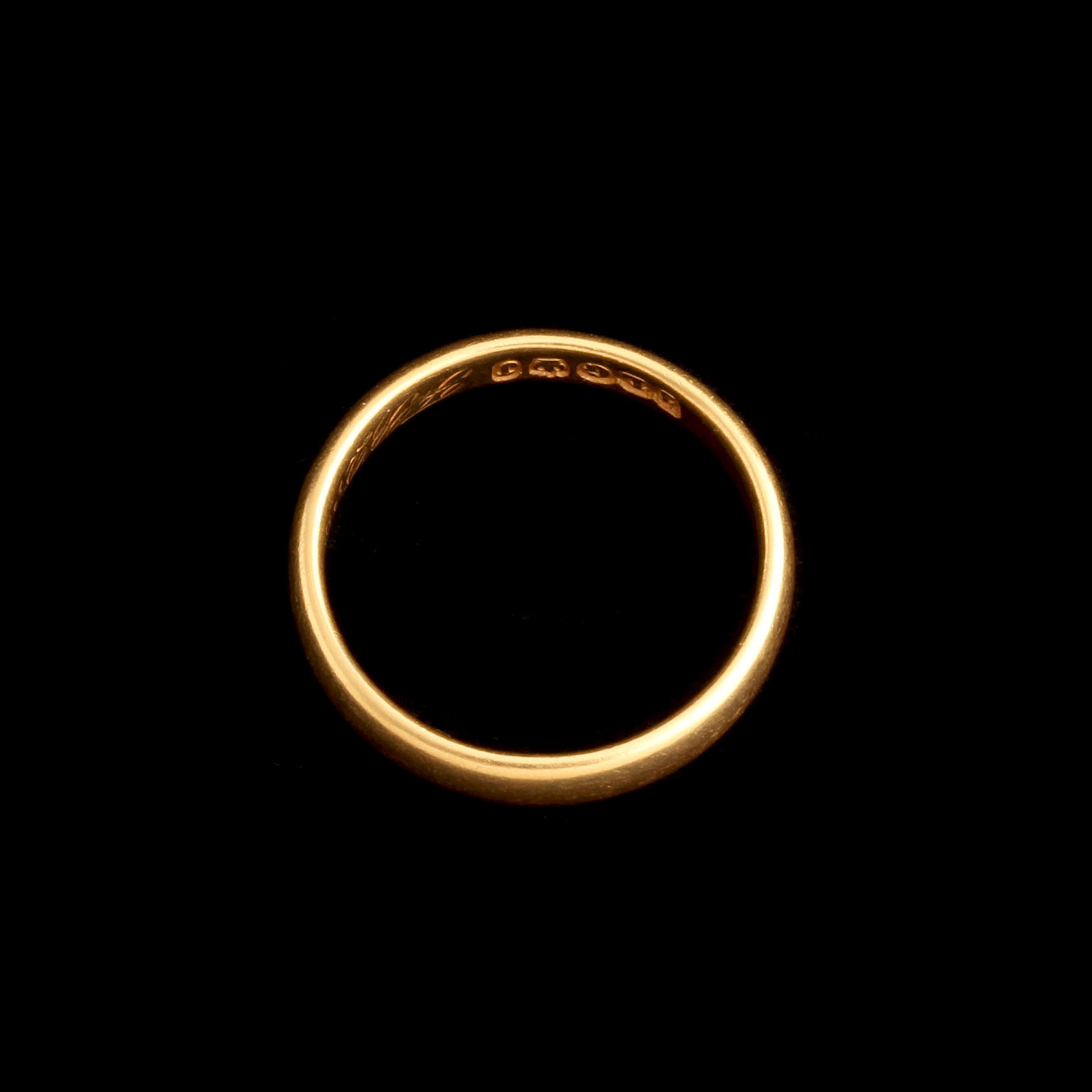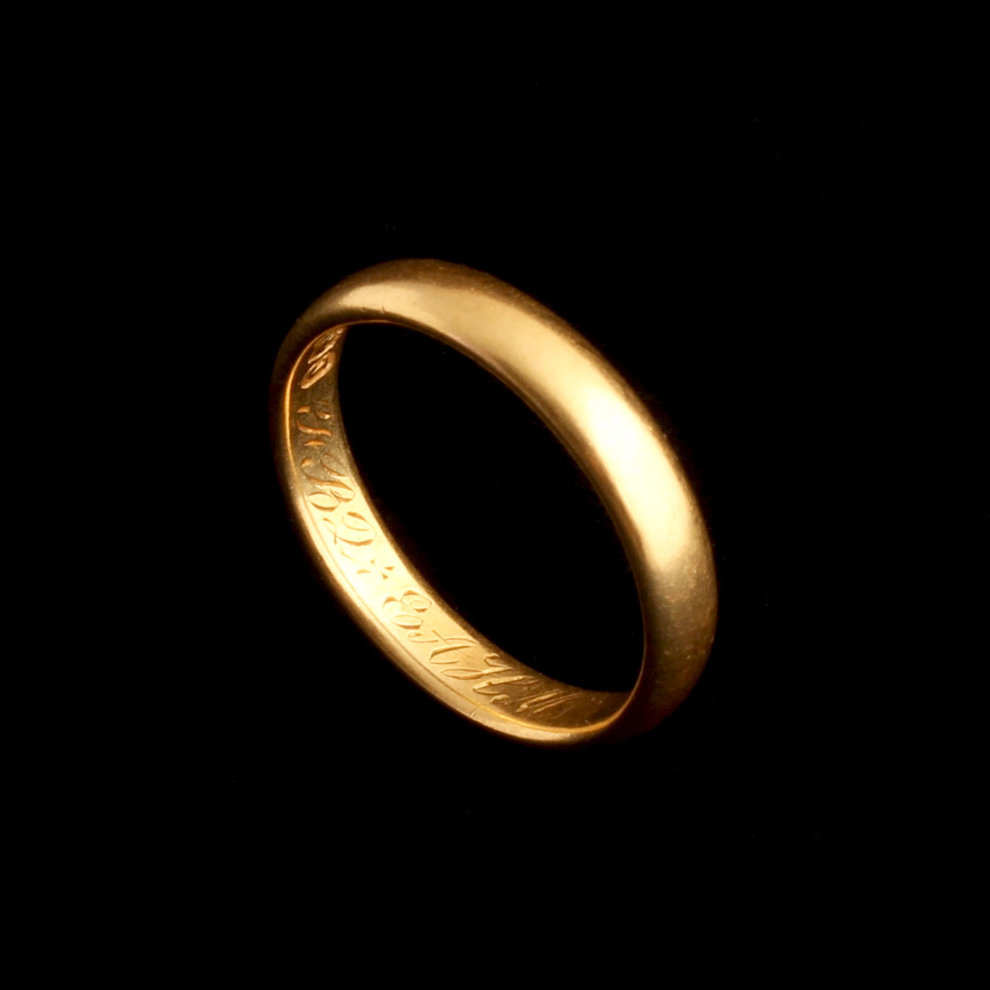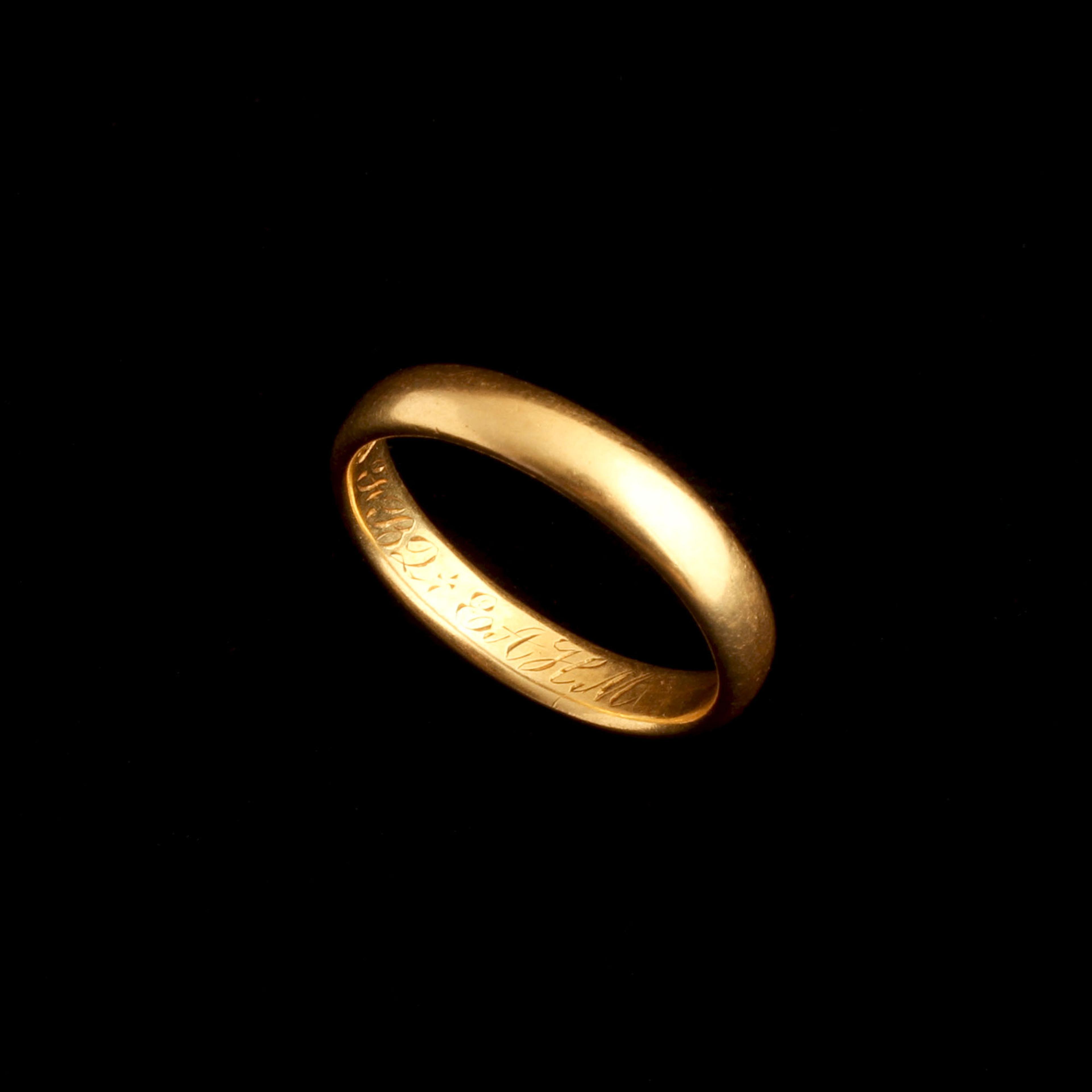 More than meets the eye, this Victorian 22k gold wedding band is a rare jewel made and assayed on the island of Jersey. Jersey and the channel islands didn’t have an official assay system or mark, as a result local jewelers often developed their own pseudo-hallmarking systems modeled on the traditional British style. The maker’s mark “JLG” belonged to John le Gallais (well-known for silver “Jersey Cans” and spoons, gold pieces from this period in Jersey are much rarer). Stamped alongside his initials is a crown (used by local smiths to imitate official British hallmarks or to signify high quality) and the letter “J”. Unlike official London or Birmingham date letters which change annually, Jersey makers sometimes used their own letter sequences. A letter “J” served as a localized mark of quality or a specific production period within le Gallais’ workshop. Beside all of these fascinating marks are the initials of the couple who commissioned this piece, “FBQ + EAHM”.