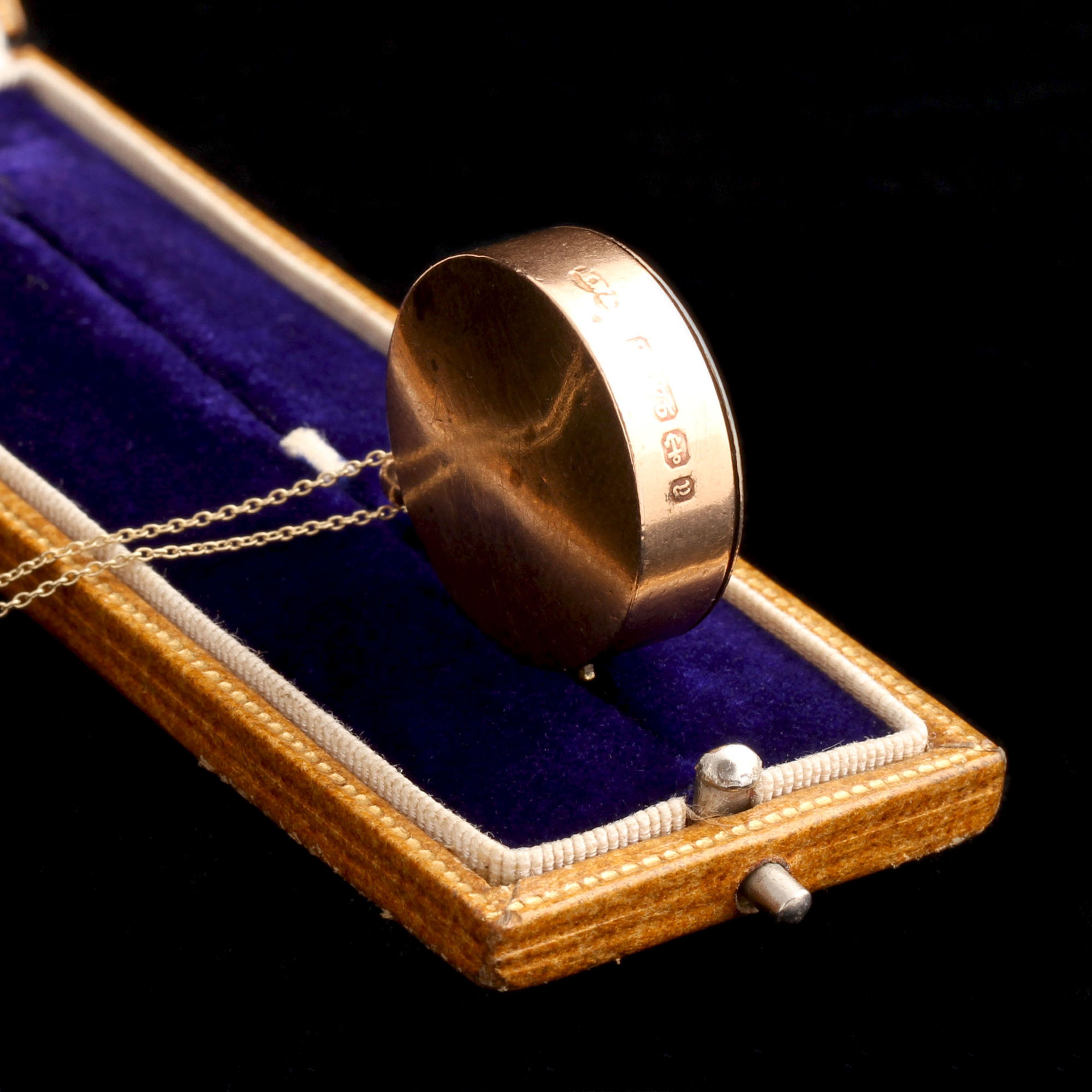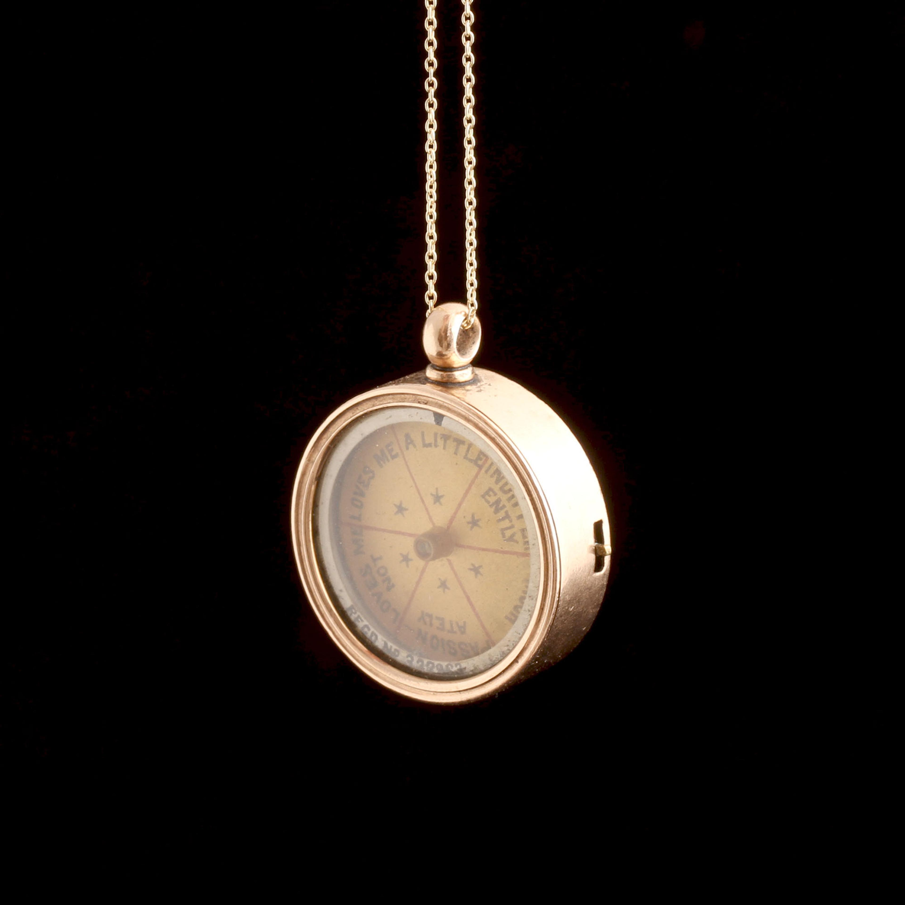 IF THE PETALS of a daisy aren’t giving you the clarity you need, try this mechanical alternative. Made in 1898 and hallmarked in Birmingham, this gold spinning jewel features a spring-loaded lever that reveals your crush’s true feelings—no guessing required. The stamped patent number suggests its inventor was proud (rightfully so—it still works beautifully). A clever Victorian novelty in immaculate condition. Try to find another one - I dare you!