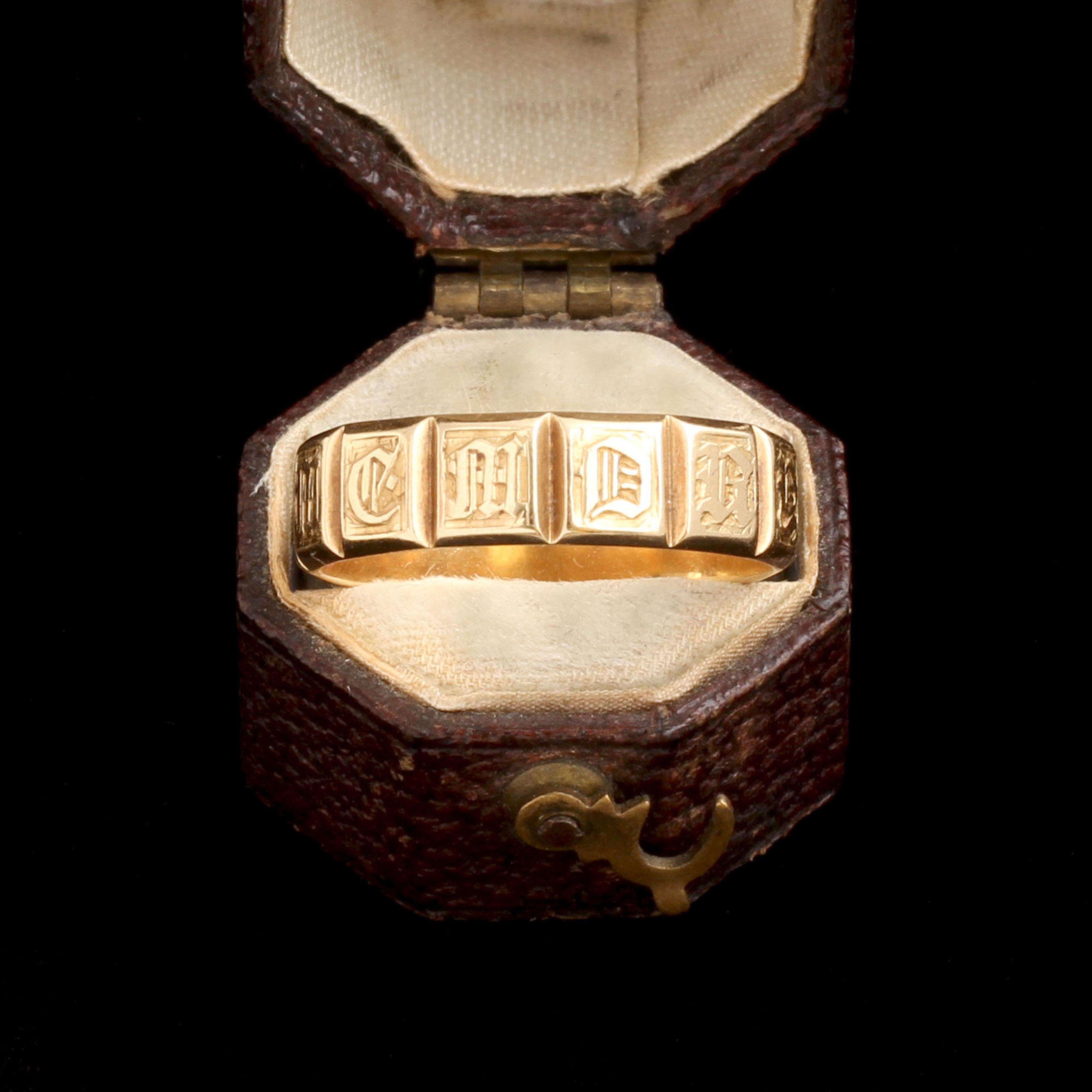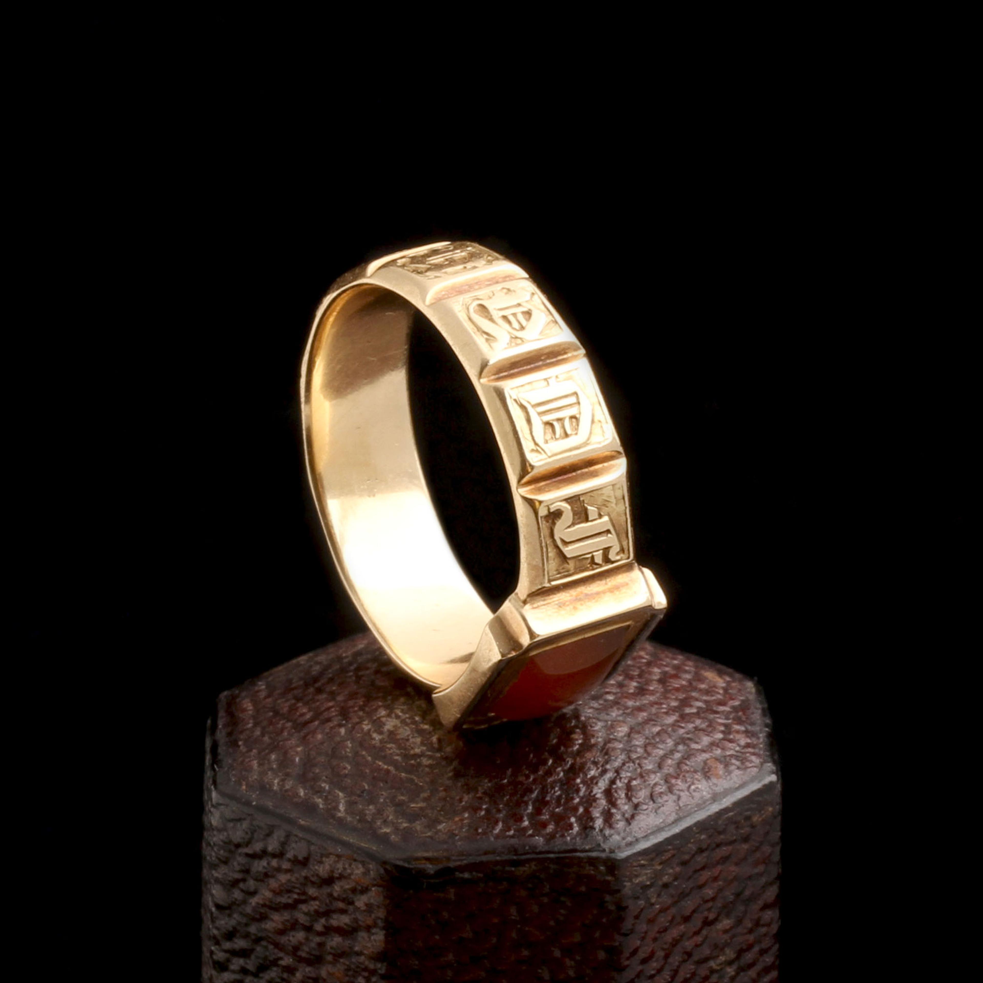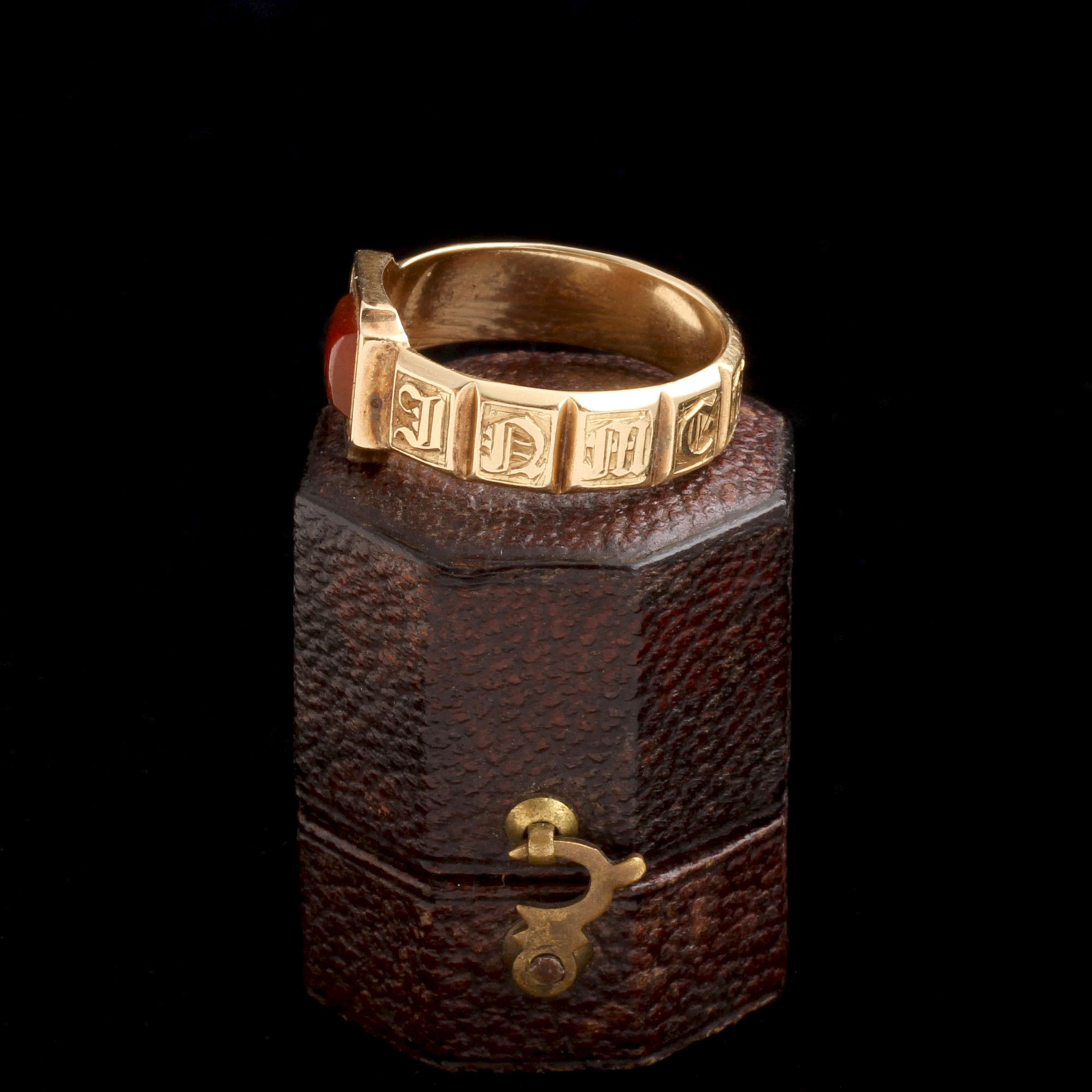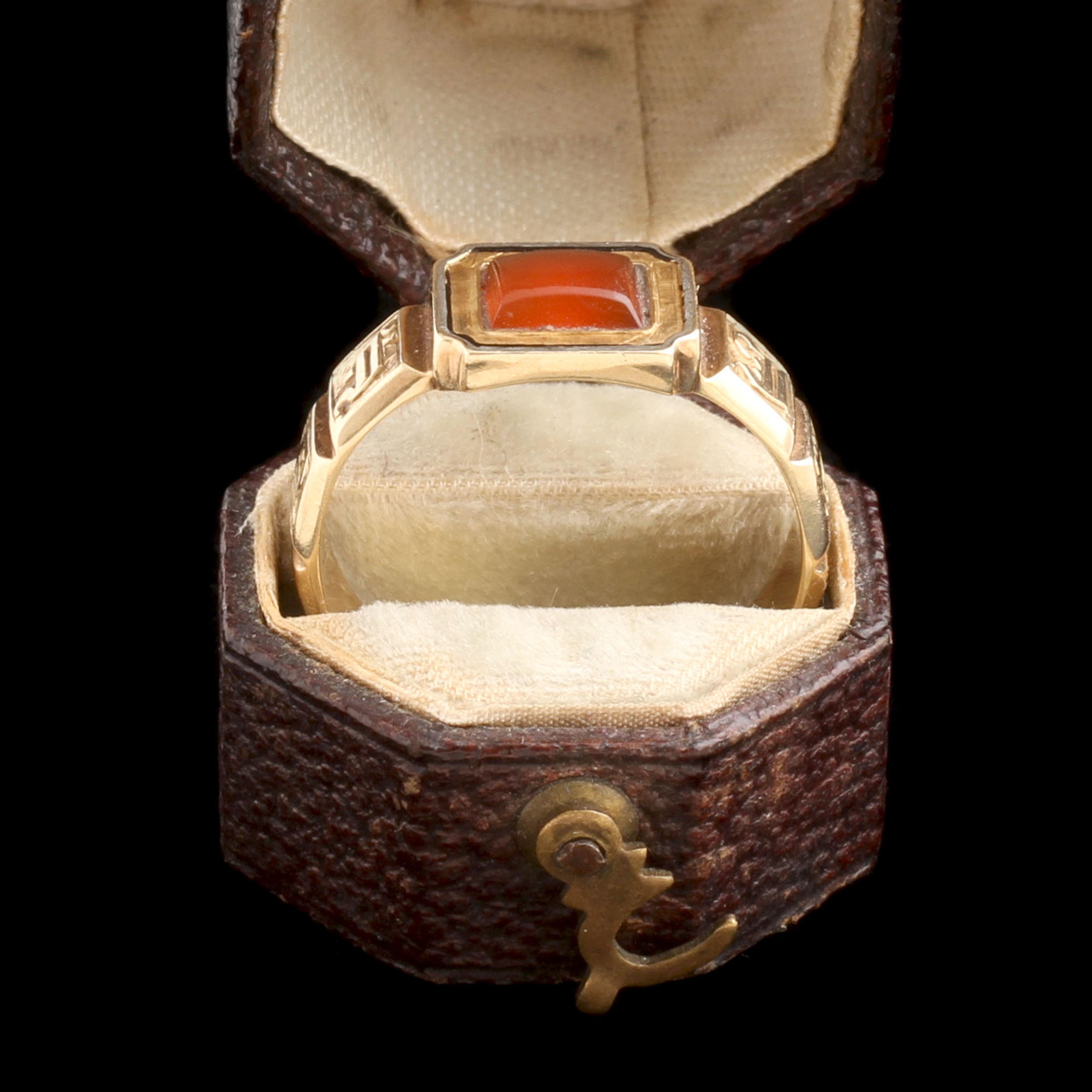 An undedicated mourning ring dating to the early years of the Victorian era. Possibly a jeweler’s blank used as a shop sample. The classic style is fashioned in gold with gothic lettering along the shank which reads “Memory Of.” The face of the ring is set with carnelian rather than a traditional hair locket. If mourning jewelry fascinates you but you find the death details of a stranger disconcerting, this might be the piece for you. That said, it would also be wonderful to do as the Victorians did and have the name of someone dearly departed engraved along the interior.