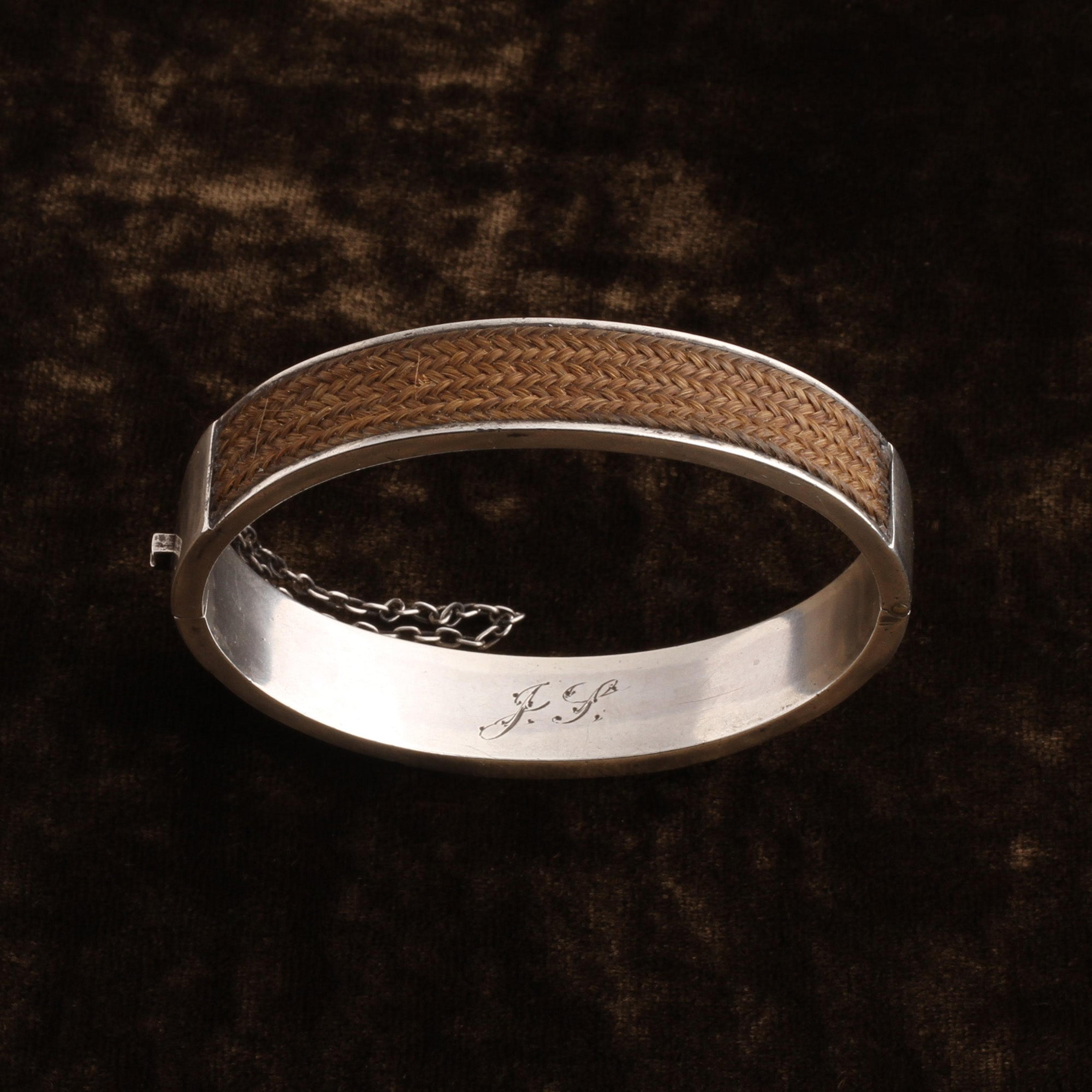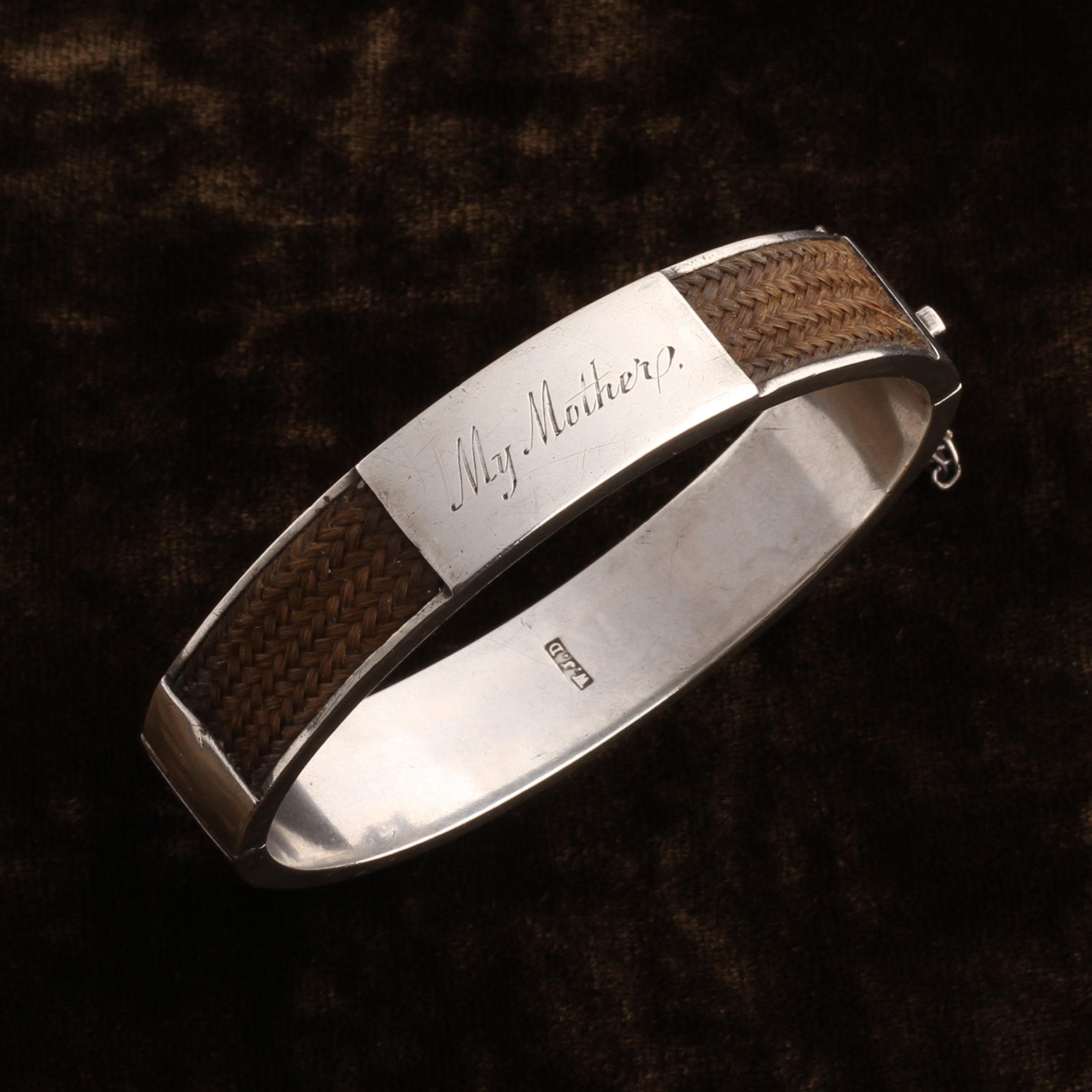 A beautifully simple Victorian bangle modeled in silver and inlaid with channels of plaited hair. The face of the bracelet is engraved with the dedication “My Mother,” the interior features the engraved initials “J.S.” and a “WJD” makers mark.
