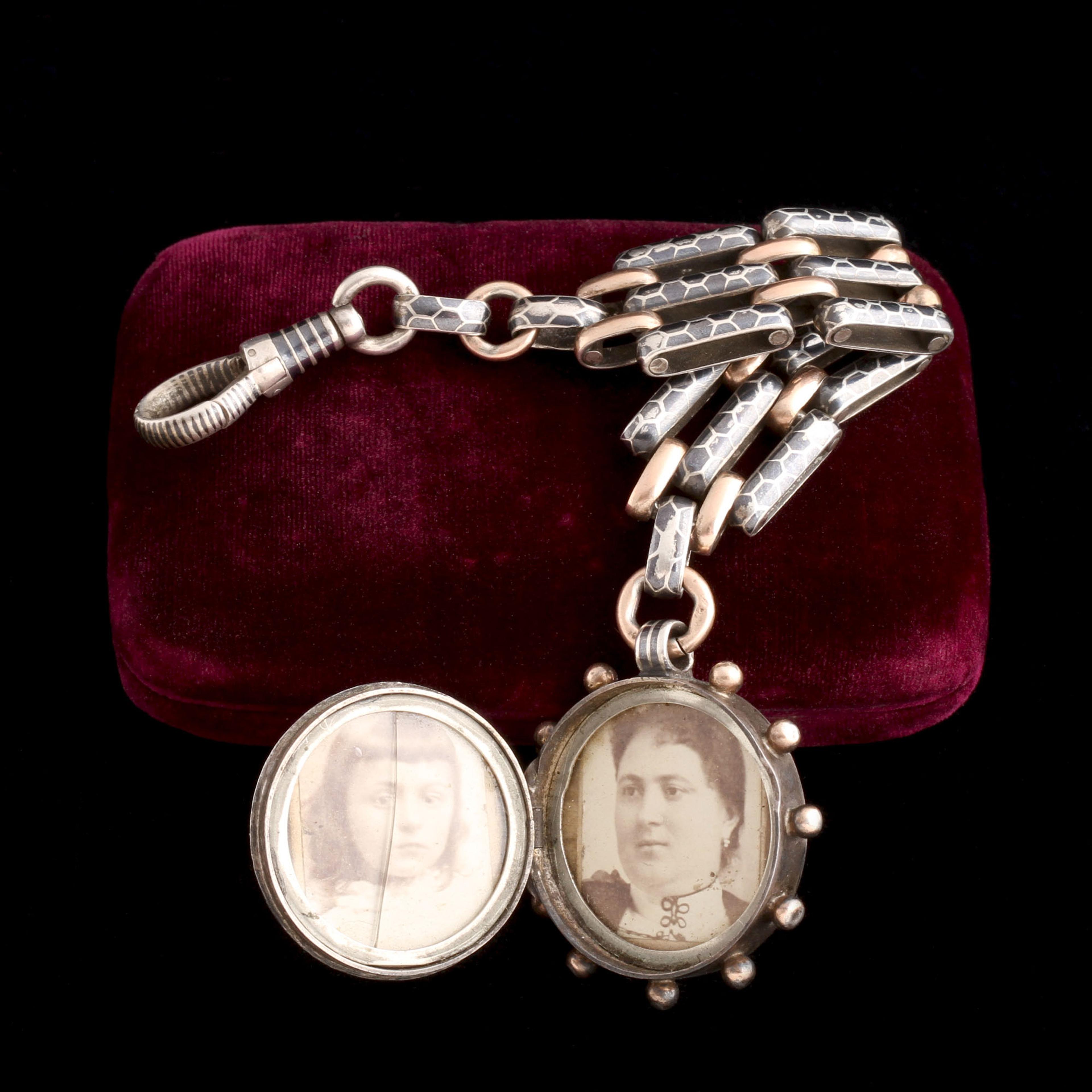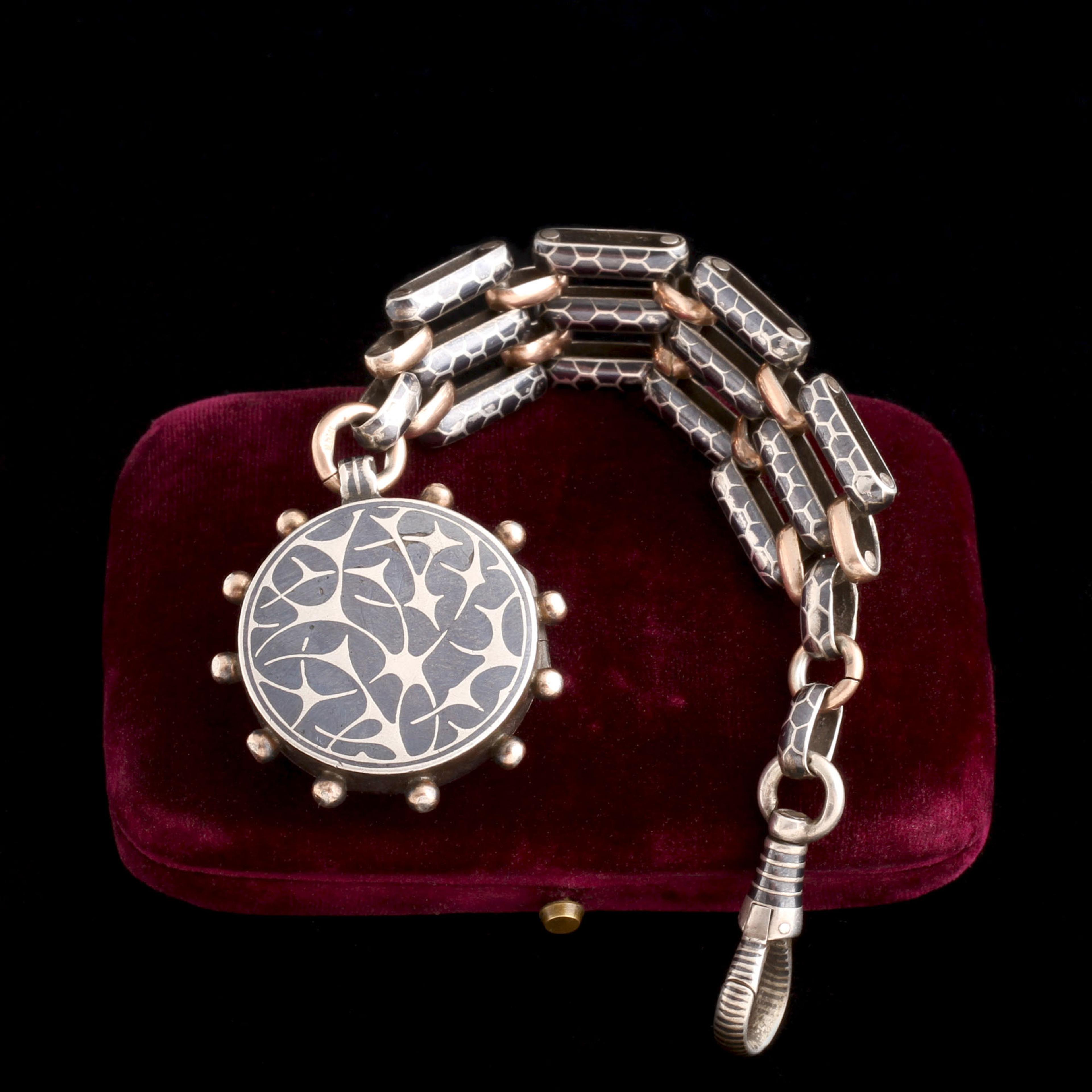 Crazy patterns and multicolored links decorate this Niello watch fob and chain; inside are poignant family photos that you can remove and replace if you wish.
