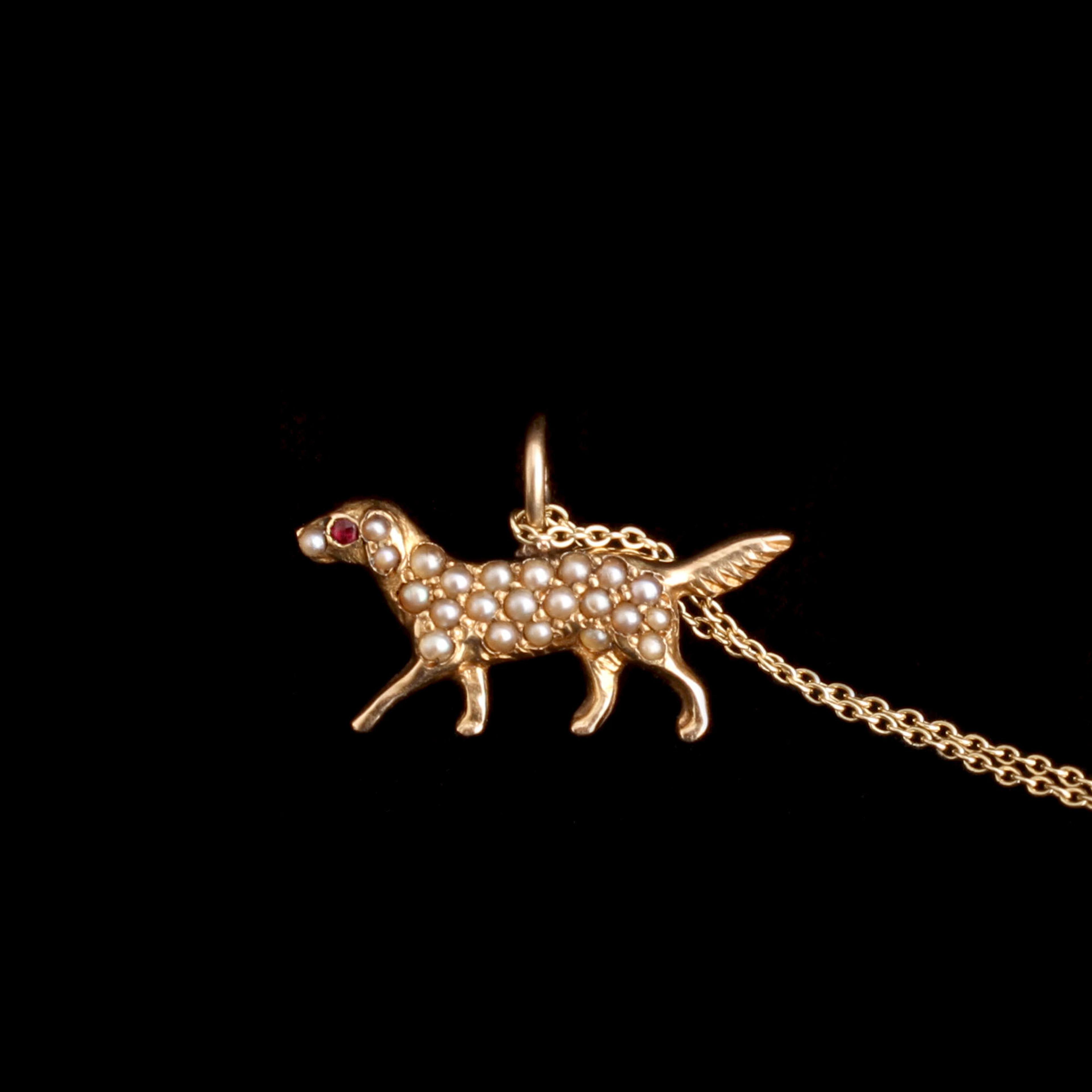 A Victorian golden pupperino, studded with seed pearls, with a friendly ruby eye.
