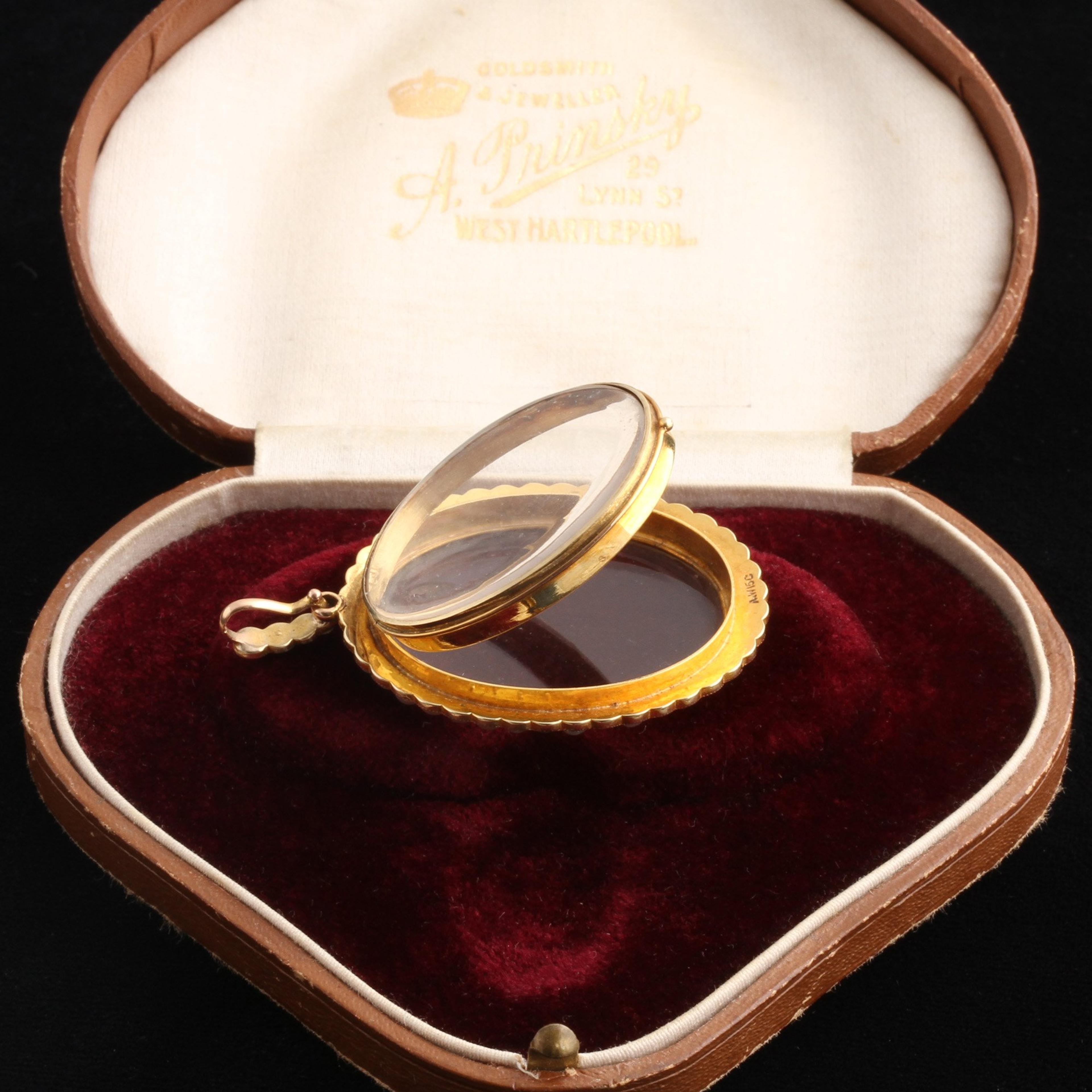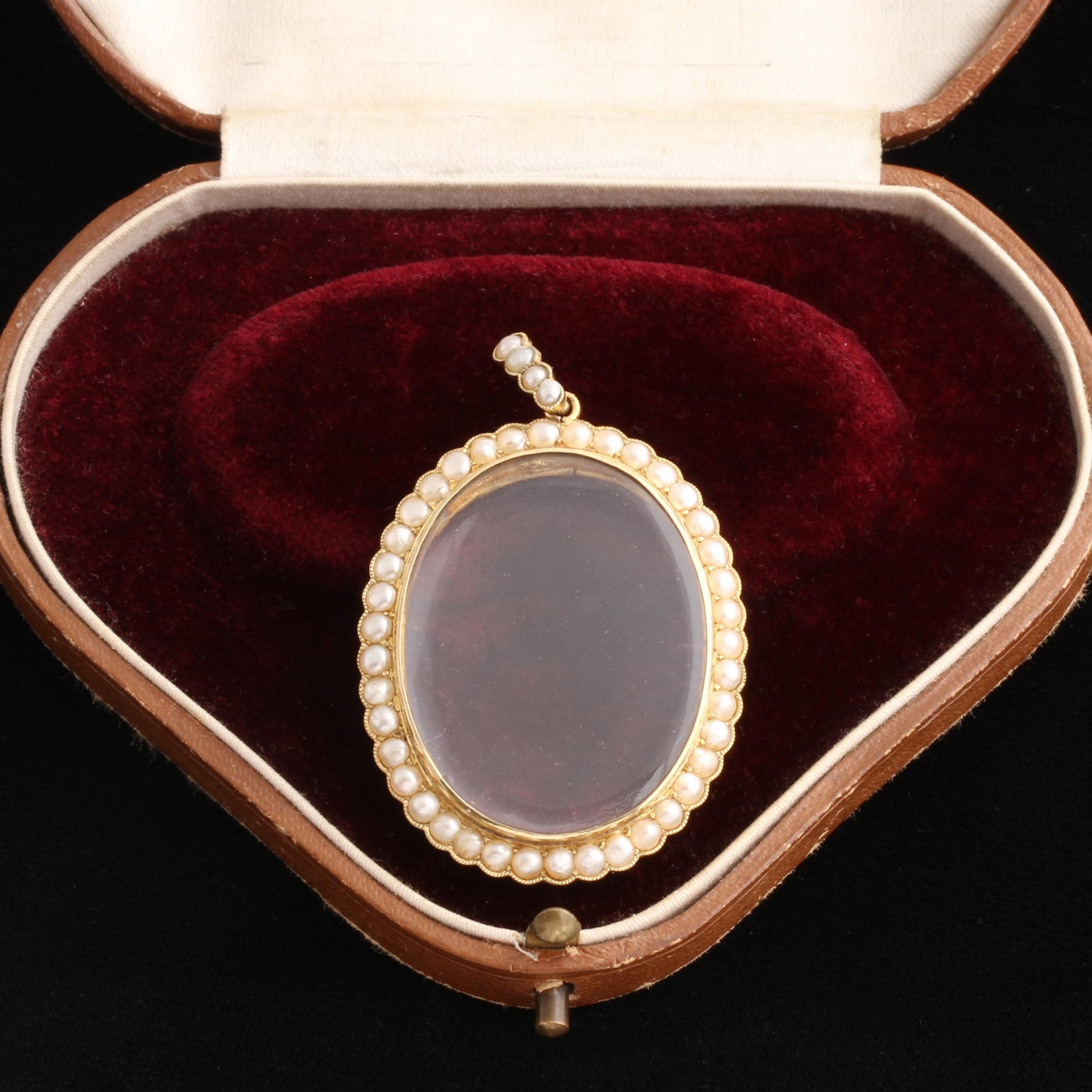 A Victorian photo locket fashioned in warm 15k yellow gold with a seed pearl frame and matching bale. The face of locket is set with a beveled glass lens, the reverse features a hinged glass locket panel. AW makers mark.