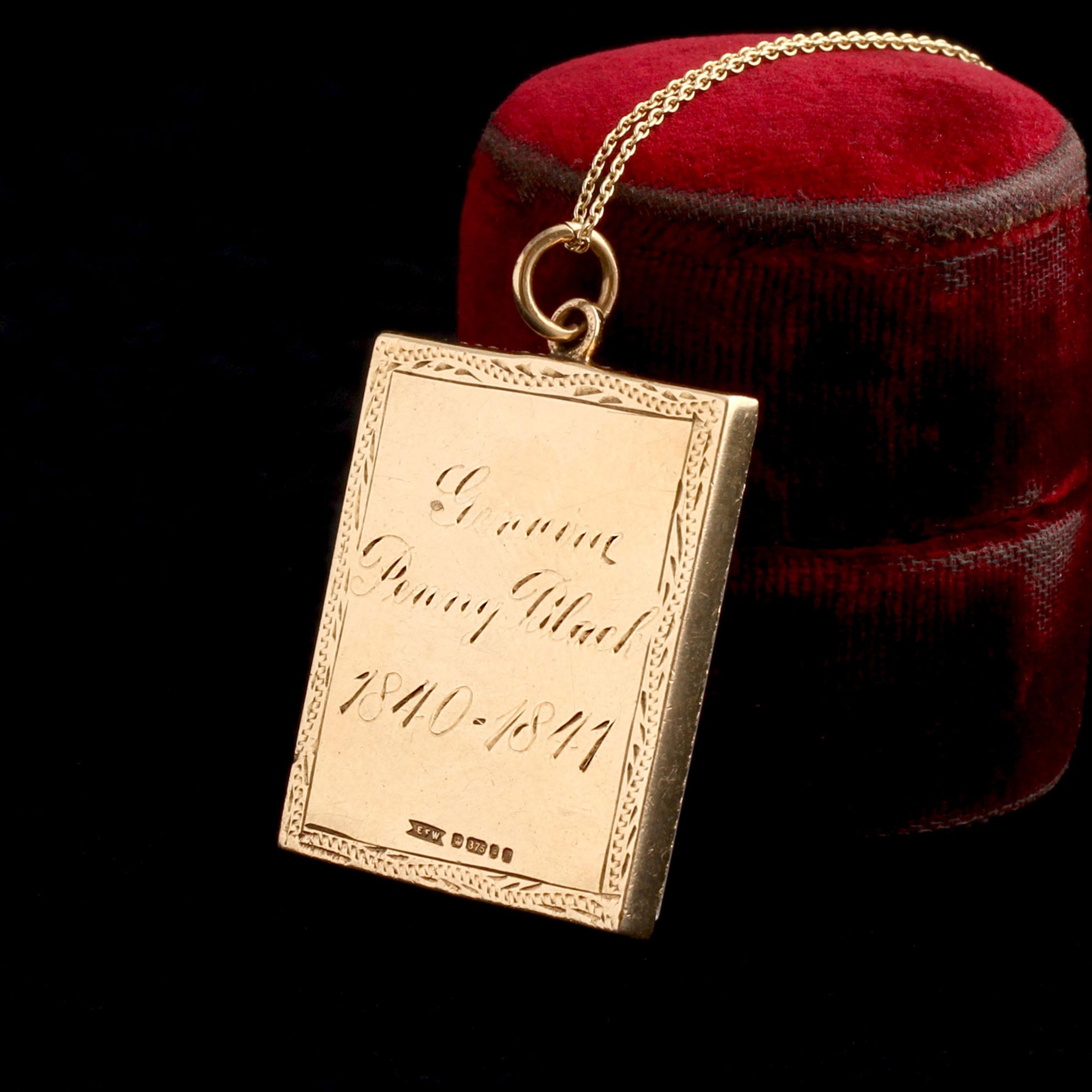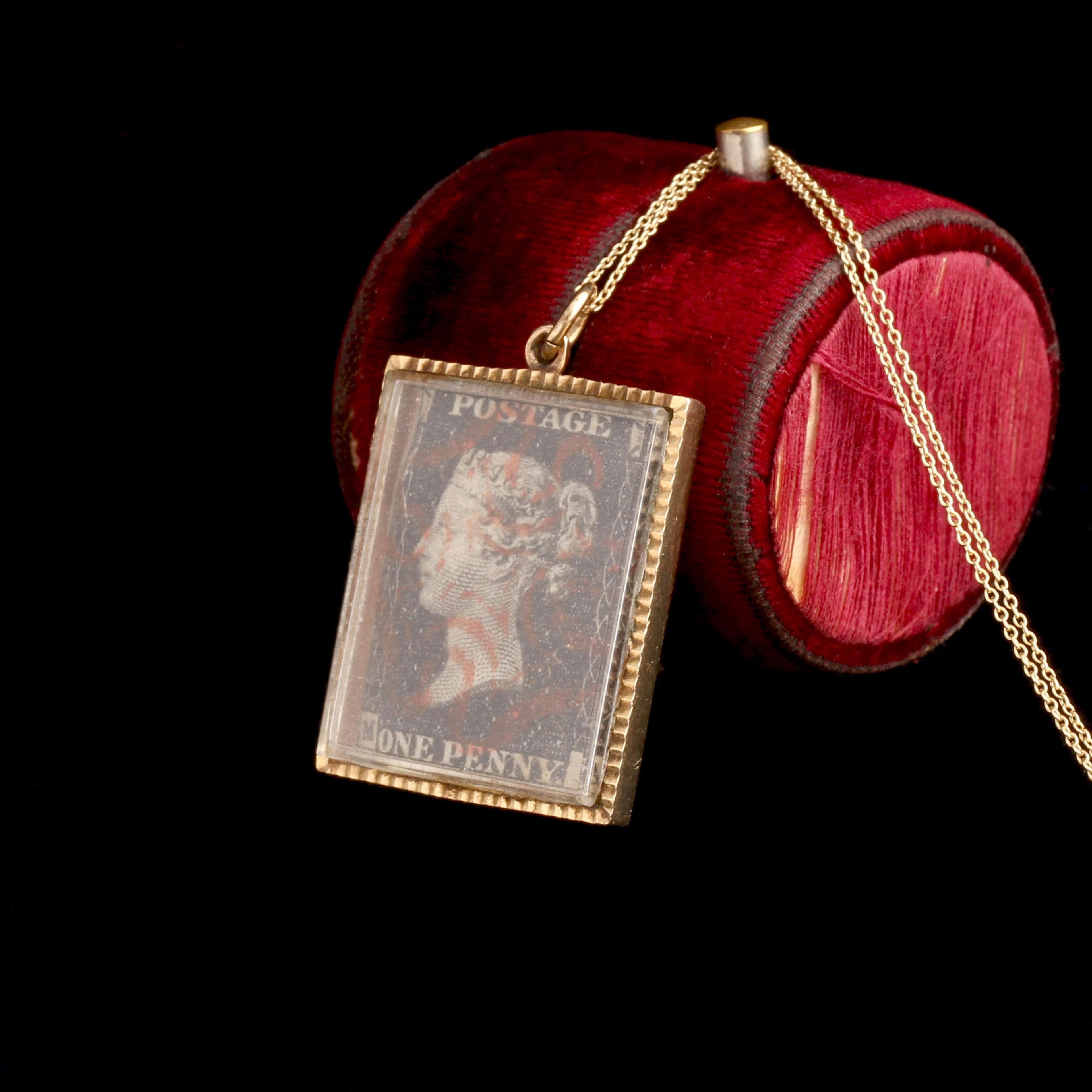 9k gold (marked), glass, penny black stamp, new 14k gold chain