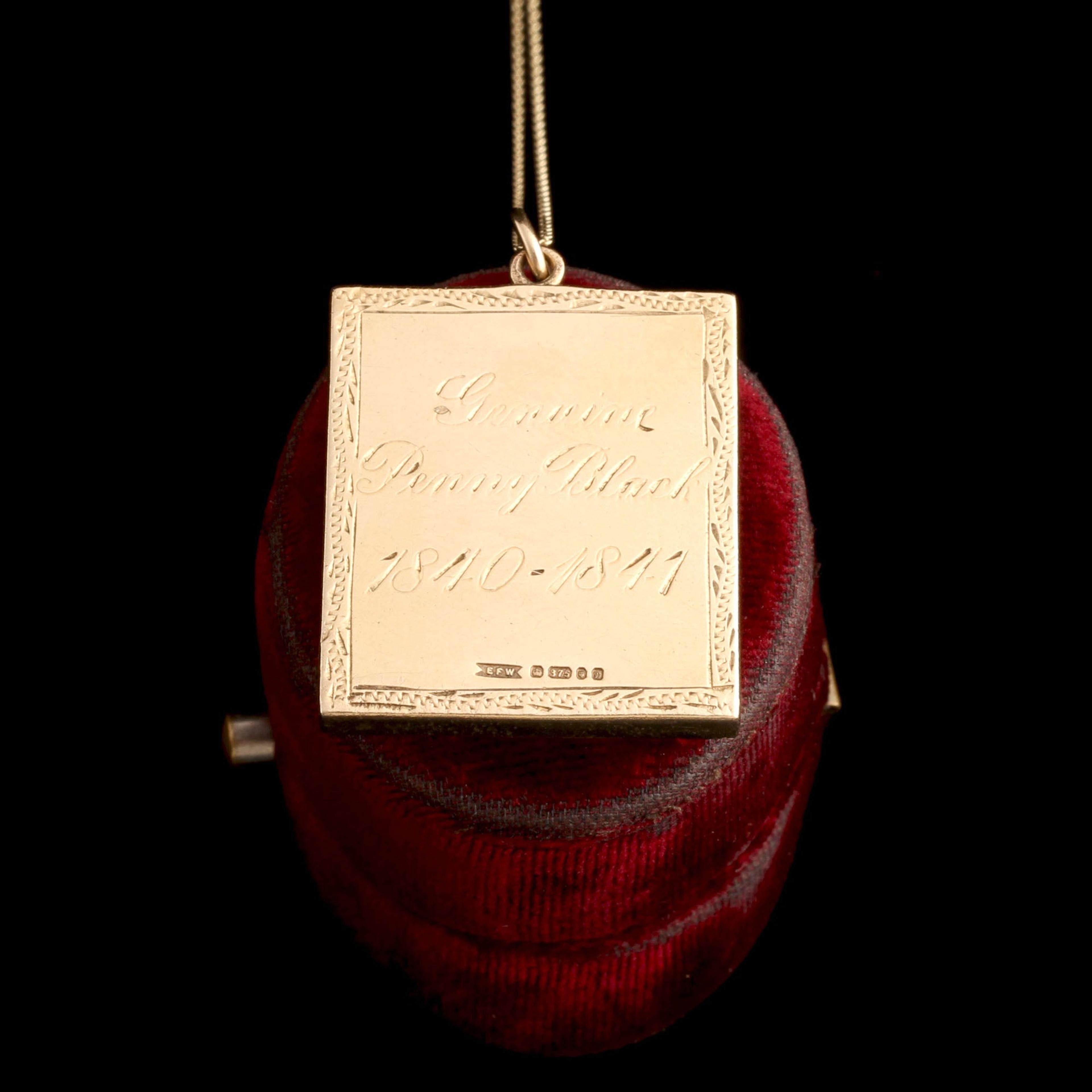 The "Penny Black" was the world's first adhesive postage stamp used in a public postal system. It was in use for just one year - between 1840 and 1841. The face of the new-ish-ly crowned Queen Victoria appeared on it. They're collectible (to philatelist nerd kings and queens) because they were the first of their kind and were printed for such a short run. This one is mounted in gold and hand engraved "Genuine Penny Black 1840-1841".