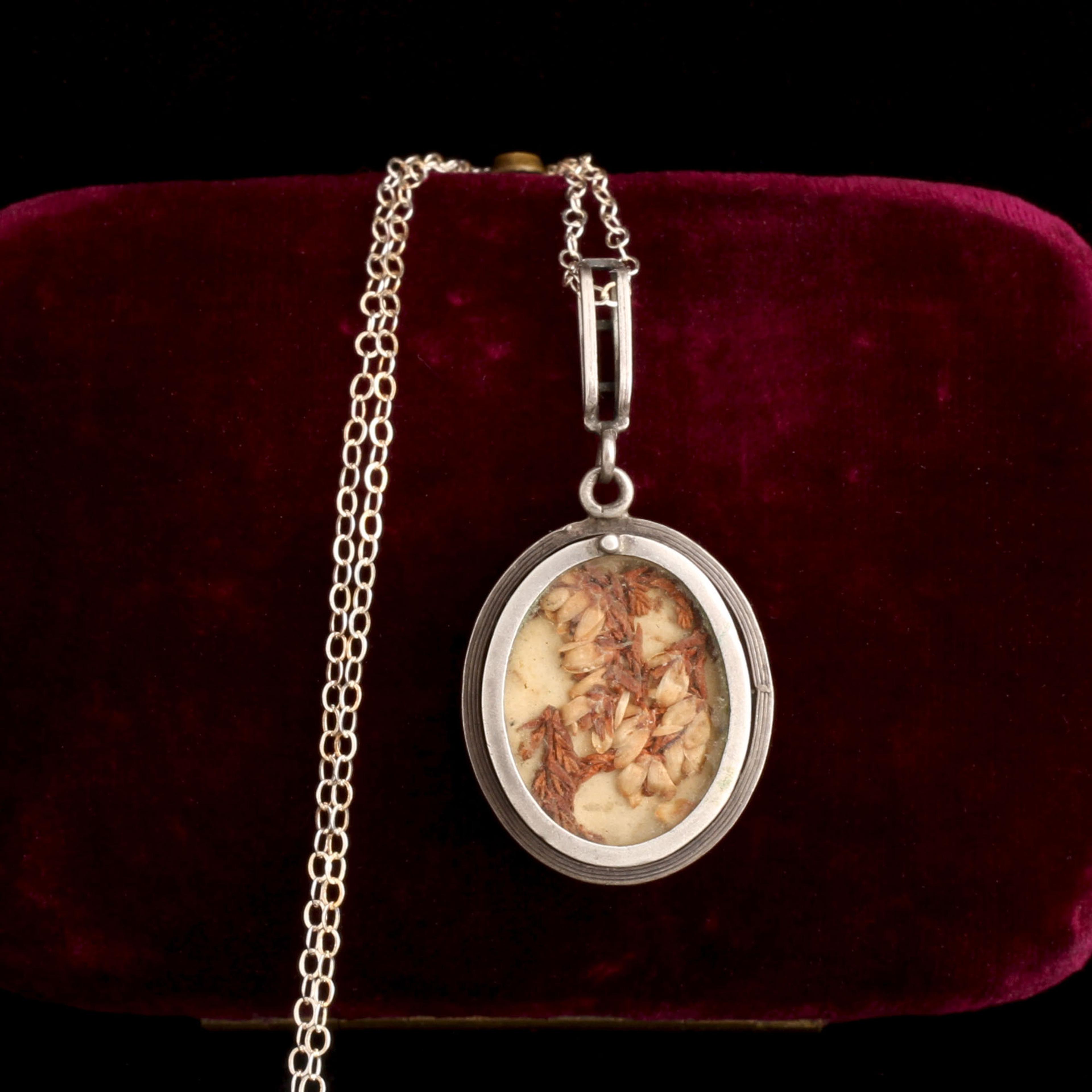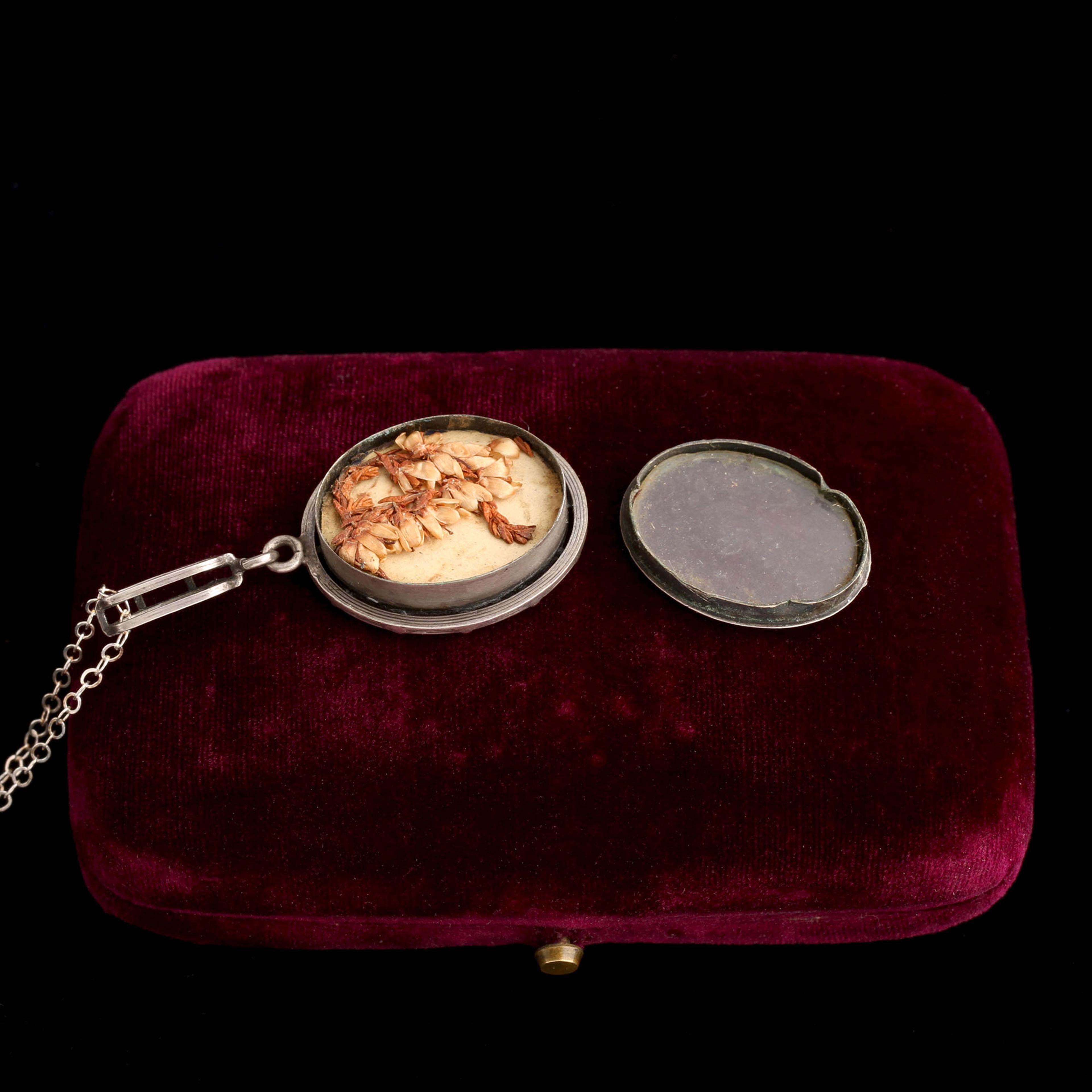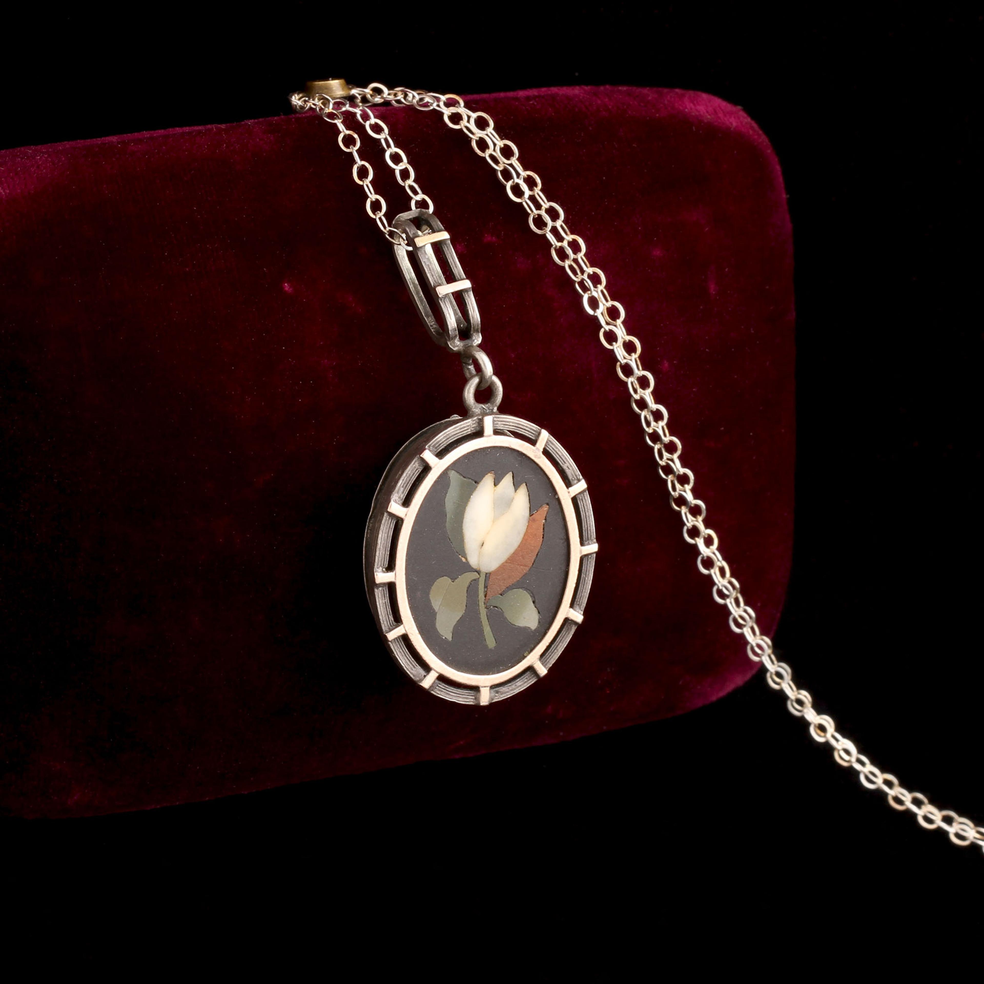 Pietra dura, meaning “hard rock,” is a method of inlaying stone developed in Ancient Rome. The pietra dura technique was used from early Roman times through the Renaissance to make decorative floors, table tops, and other mid-size architectural elements. The craft experienced a revival in the form of jewelry in the mid-nineteenth century when this piece was made. The flower in this c.1860 locket composed of many pieces of stone seamlessly fitted together and mounted in silver.