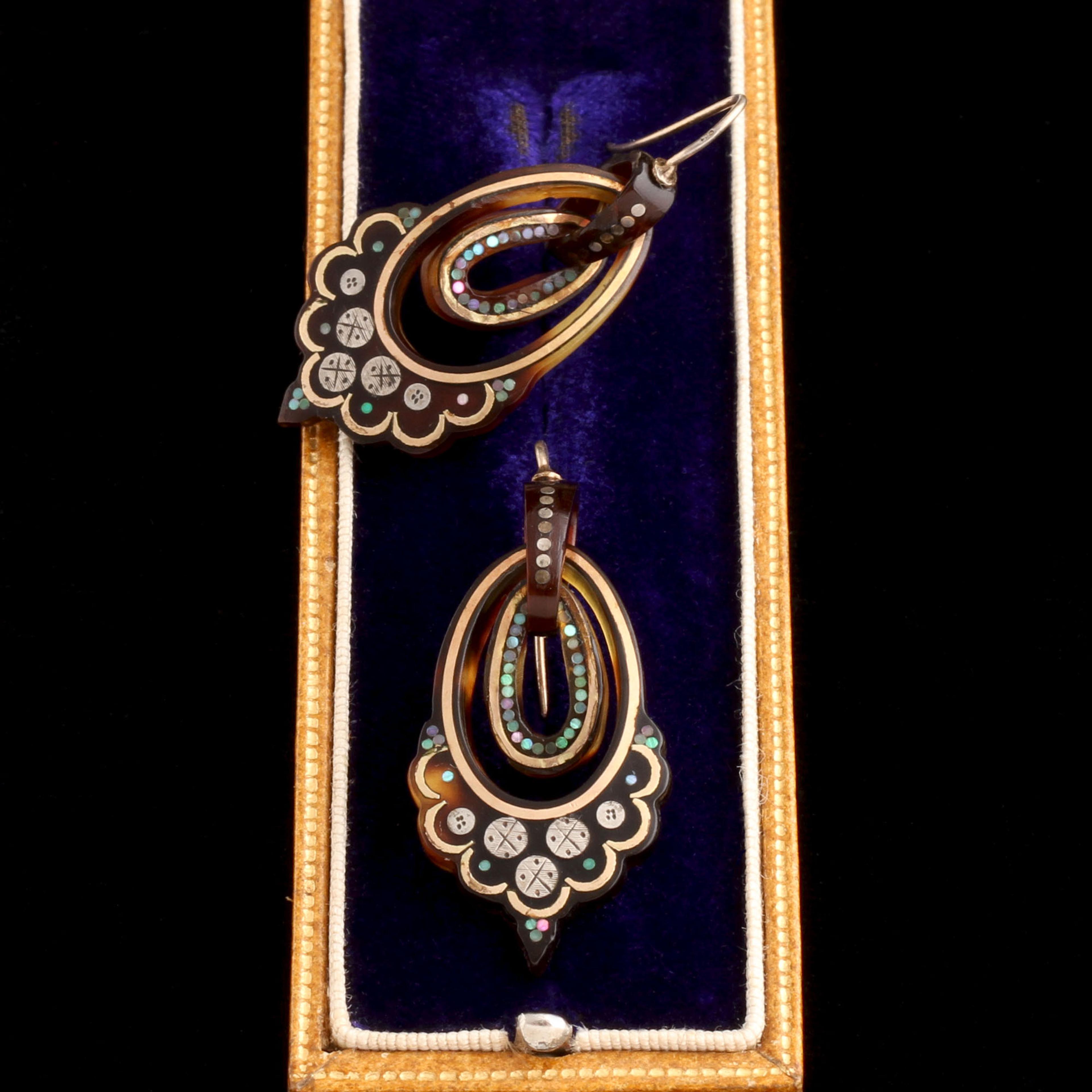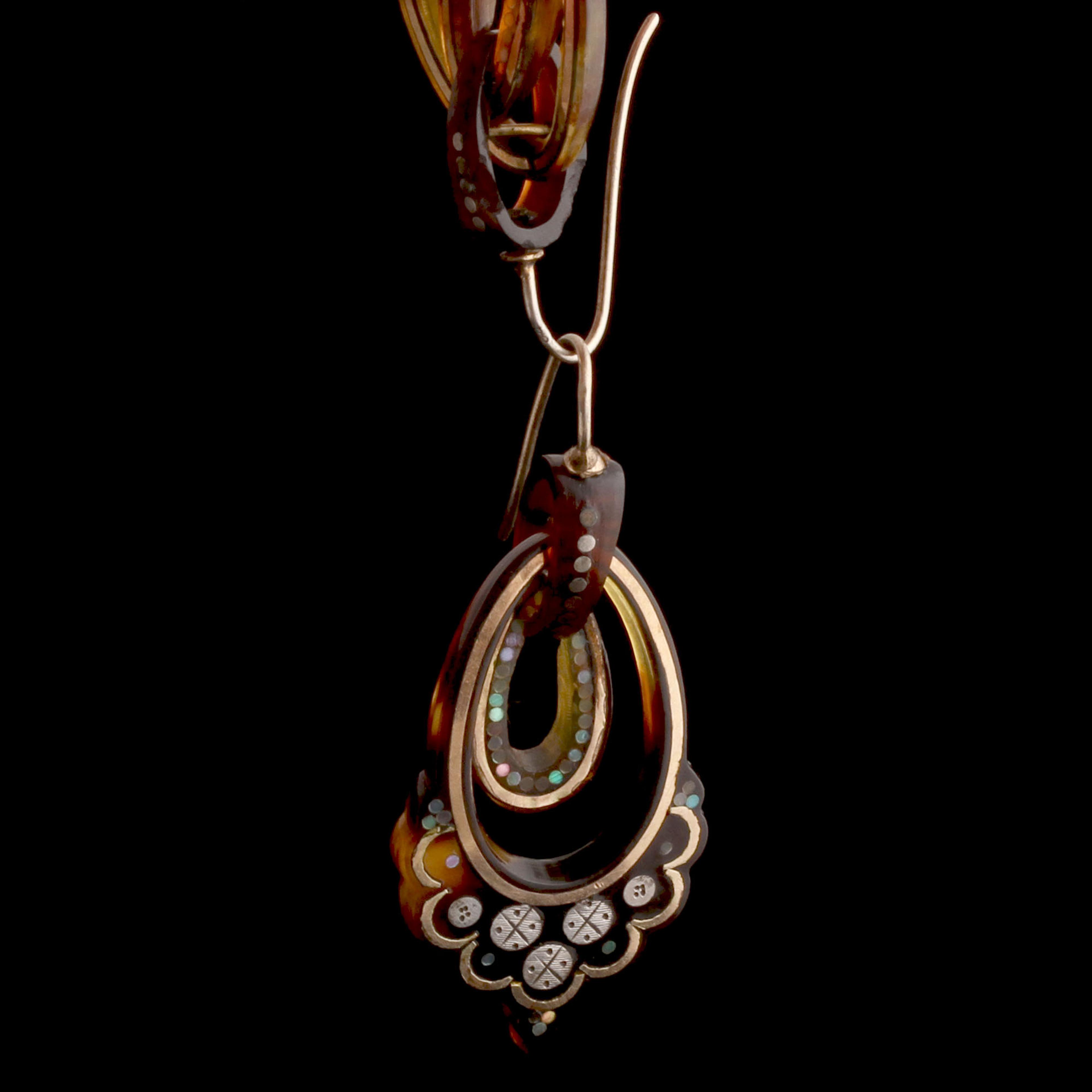 Tortoiseshell is a gorgeously complex material that 19th-century jewelers got really creative with. Most Victorian piqué work relies on repetitive gold inlay, but these earrings are different: vibrant mother-of-pearl inlay creates flashes of color and light that shift with movement, creating a prismatic effect. They feel exuberant and inventive, showing how piqué makers experimented with color and texture.