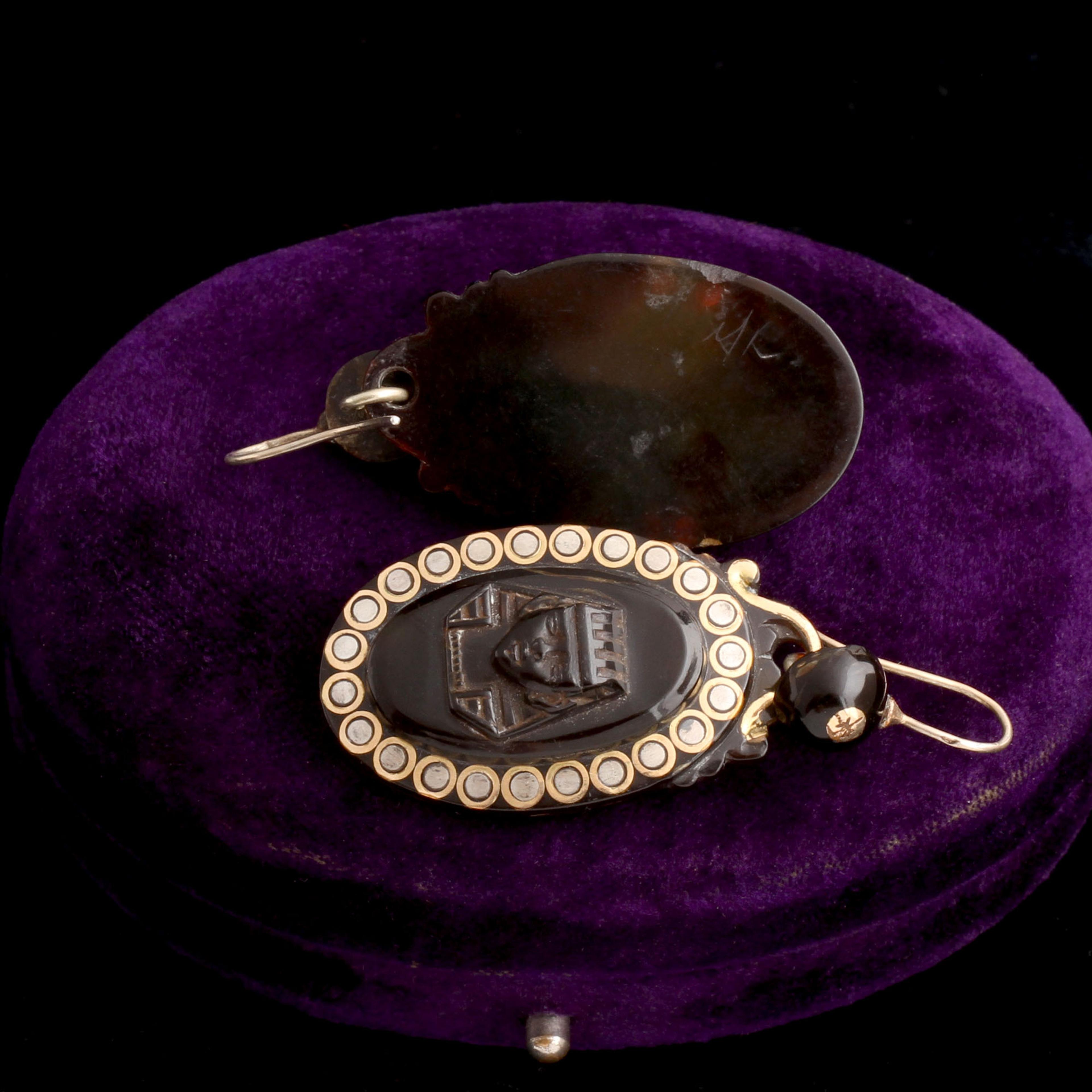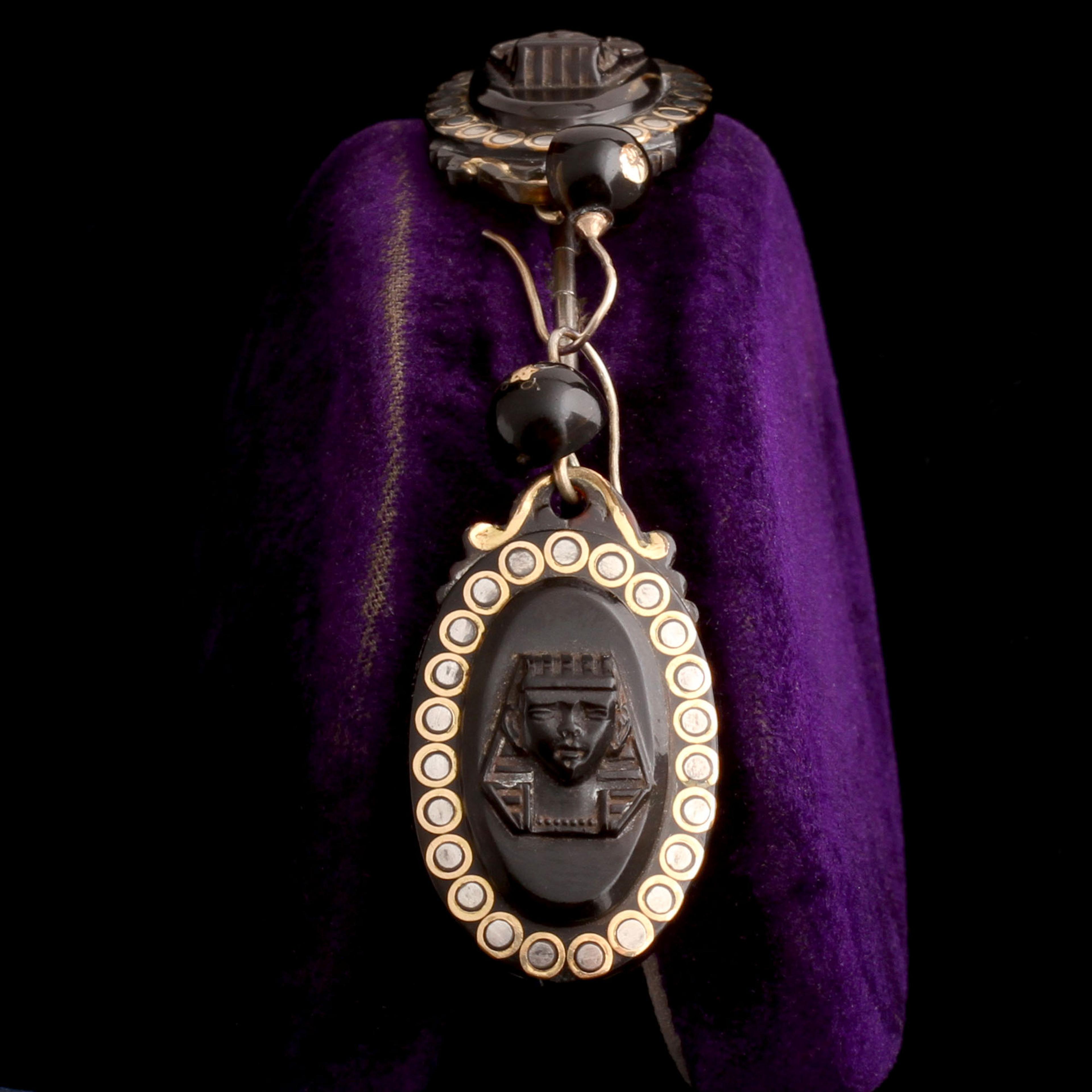 Jewelry of the late 19th century was heavily decorated with scarabs, ankhs, serpents, and sarcophagus heads, and people couldn't get enough. Precious metal wire decorates these ancient Egypt-inspired tortoiseshell ovals.