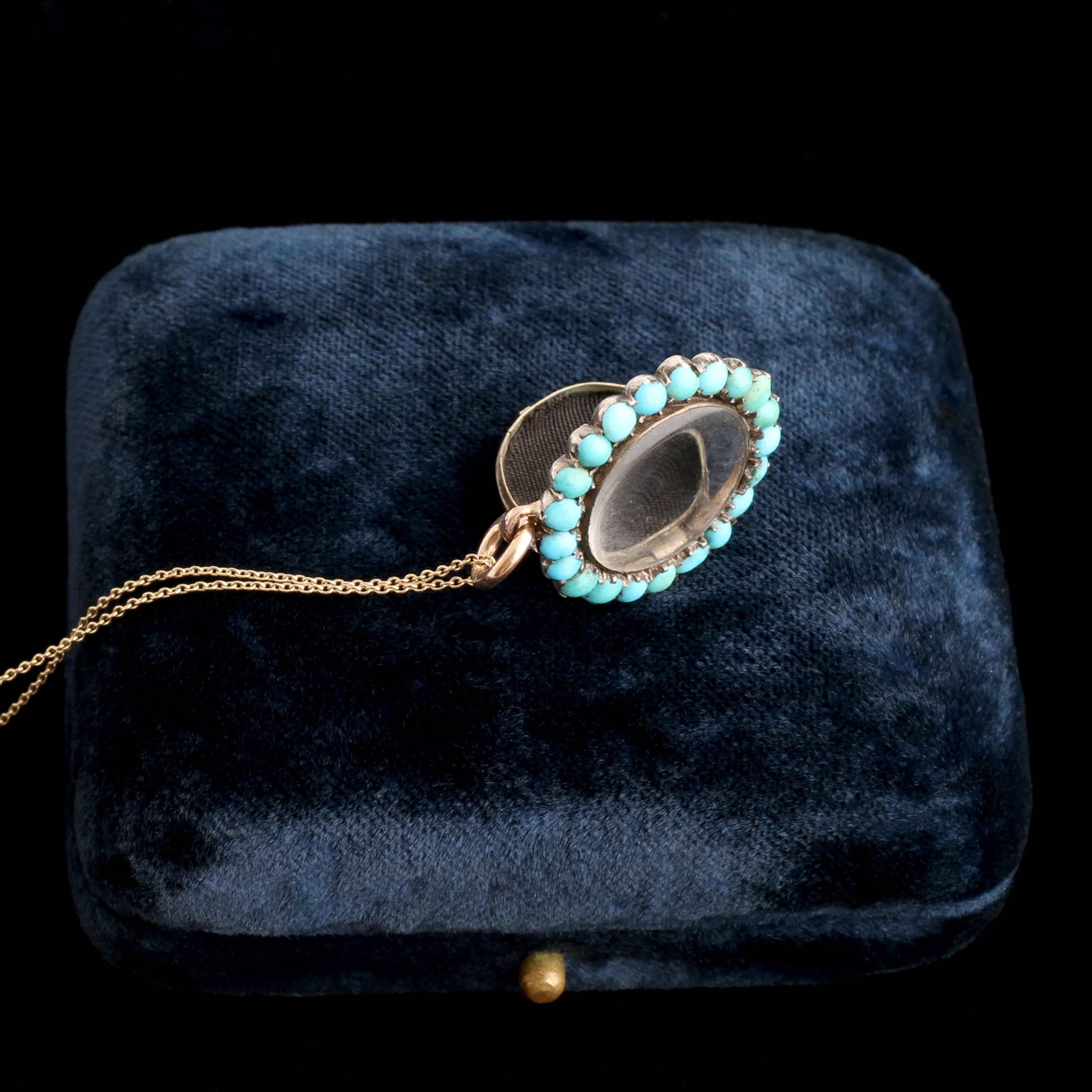 10k gold (tests), turquoise cabochons, glass lenses, hair, new 14k gold chain