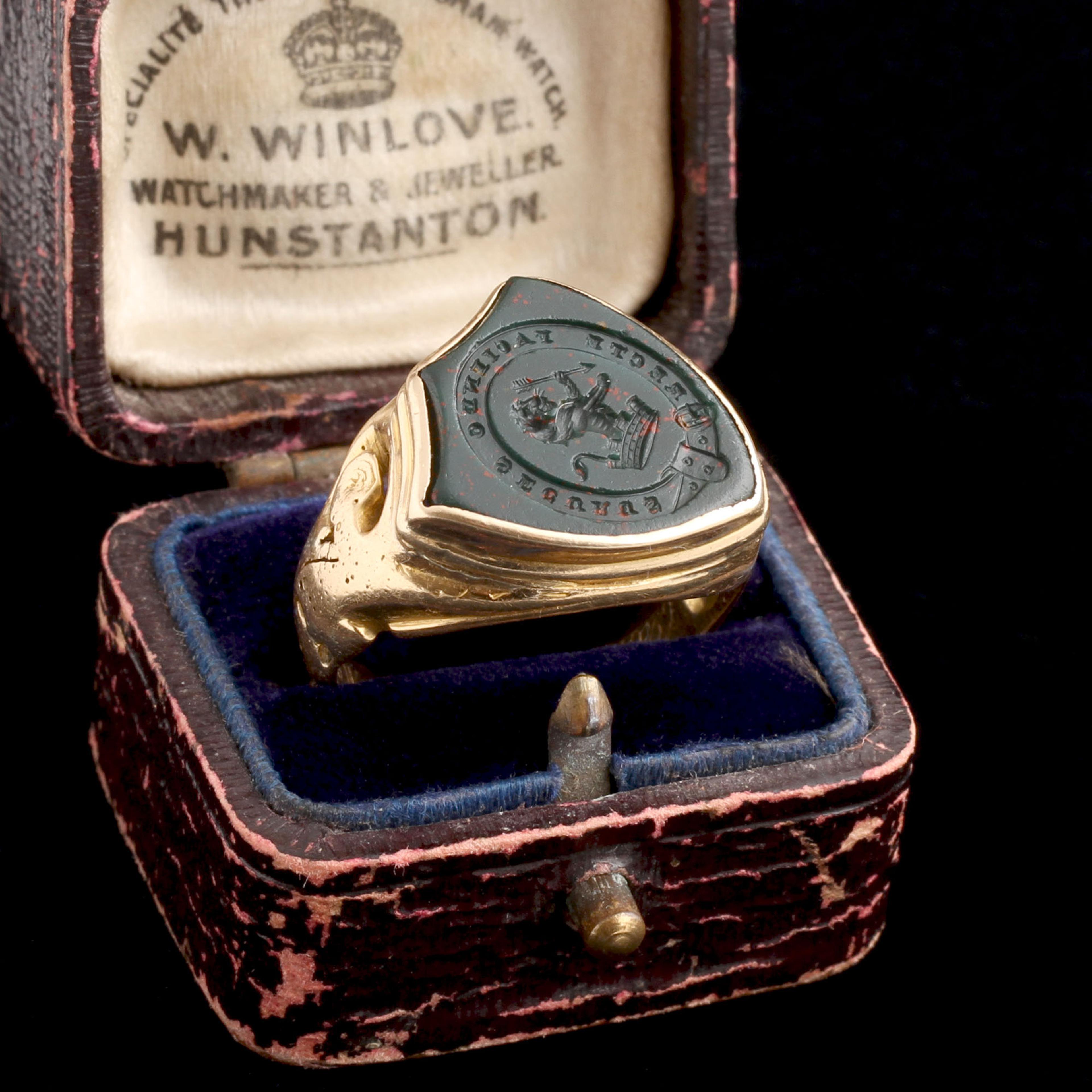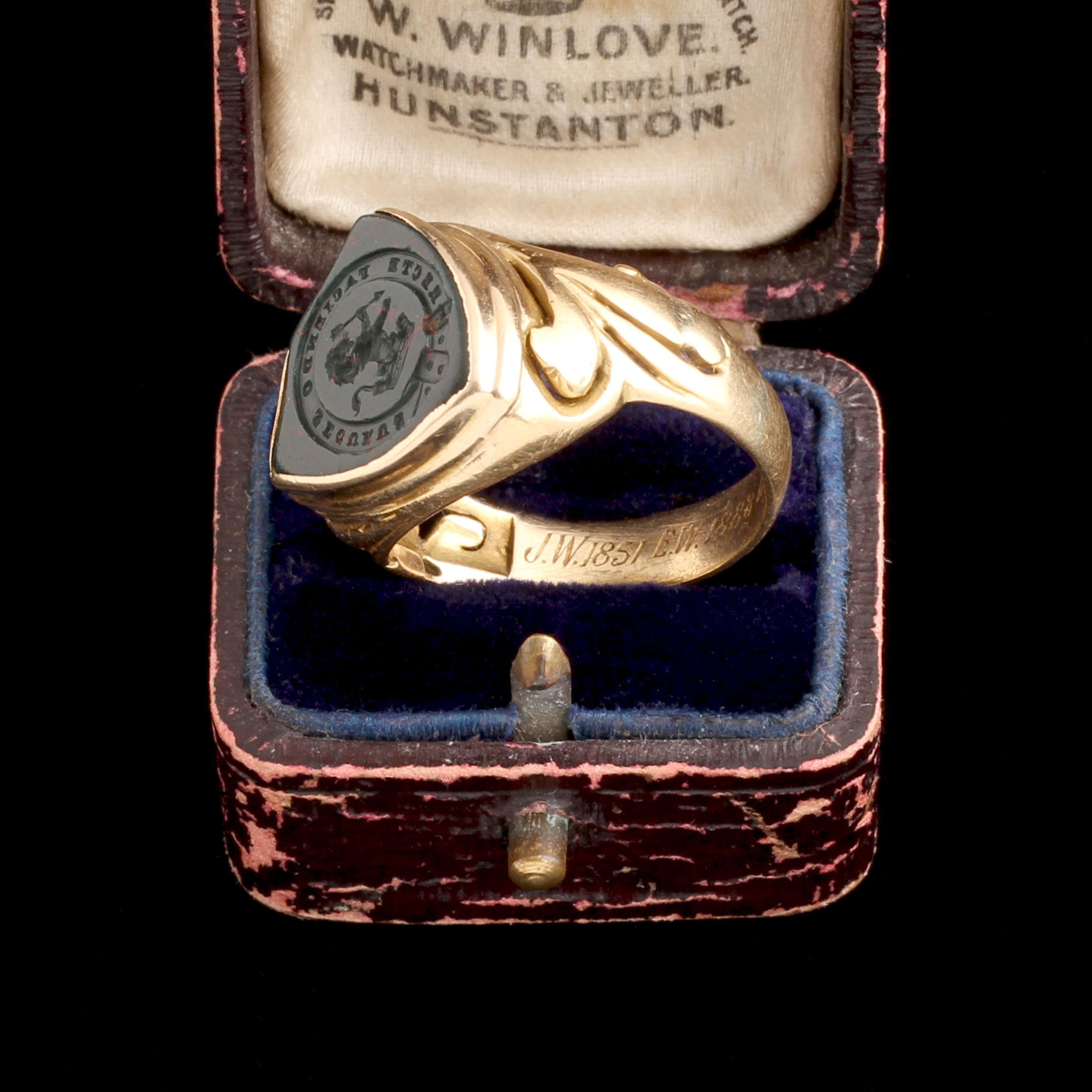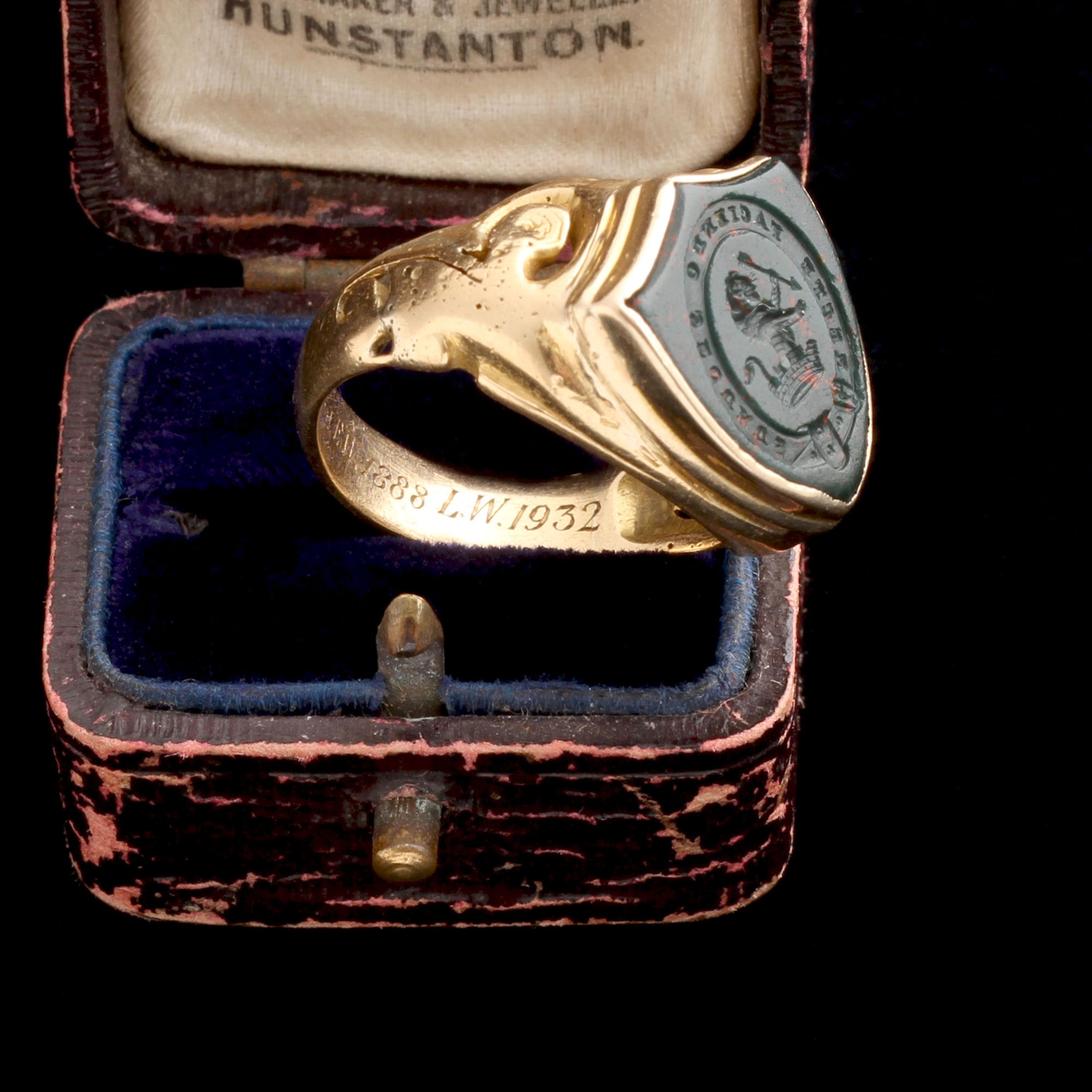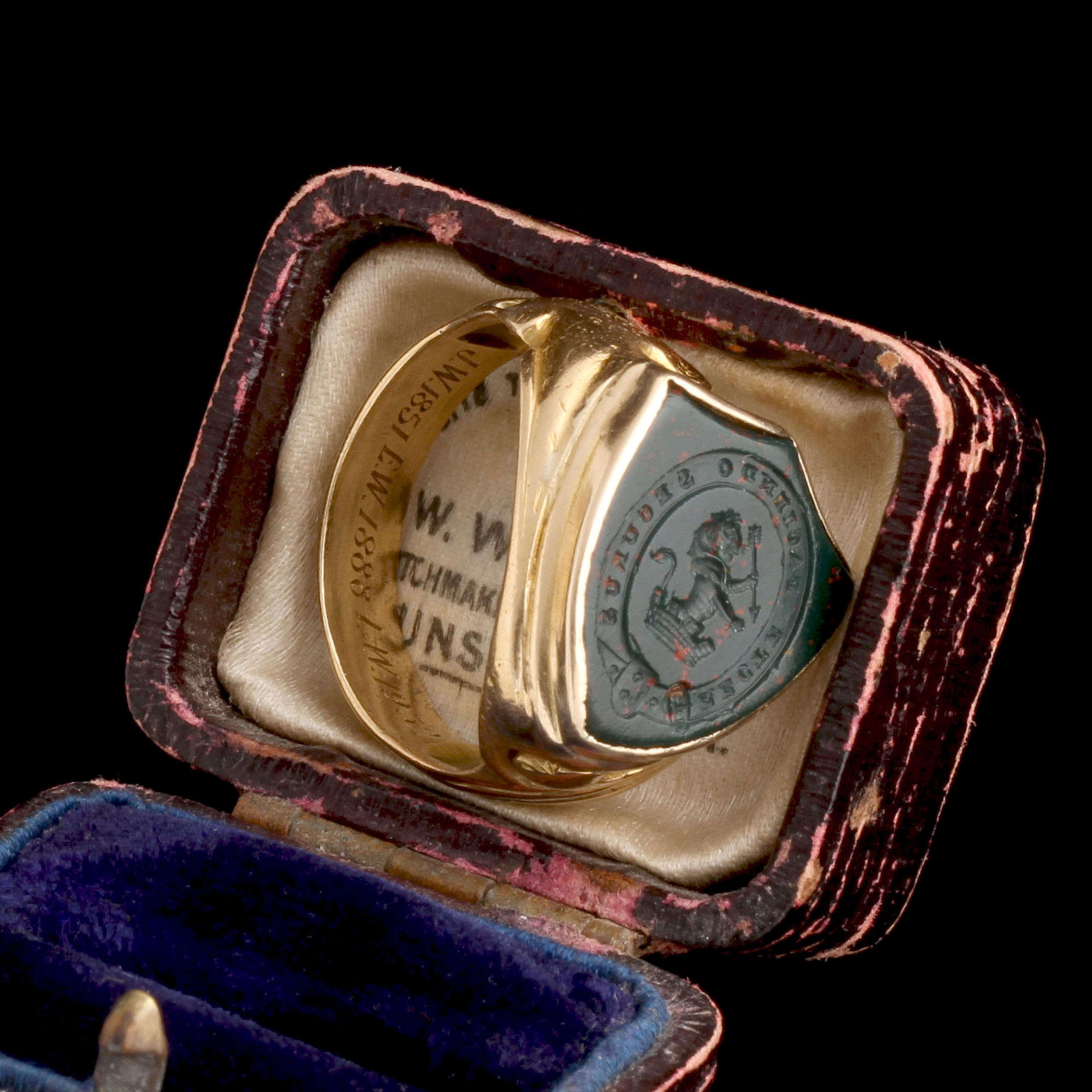 The translation is "Safe in doing what is right". Inside, it's engraved "JW 1851 EW 1888 LW 1932", so there's a family legacy there. This heirloom ring was designed to be worn on the left hand; the shield is set at an angle so that when the wearer raises their hand they view the shield straight on. The bloodstone is speckled with red dots.