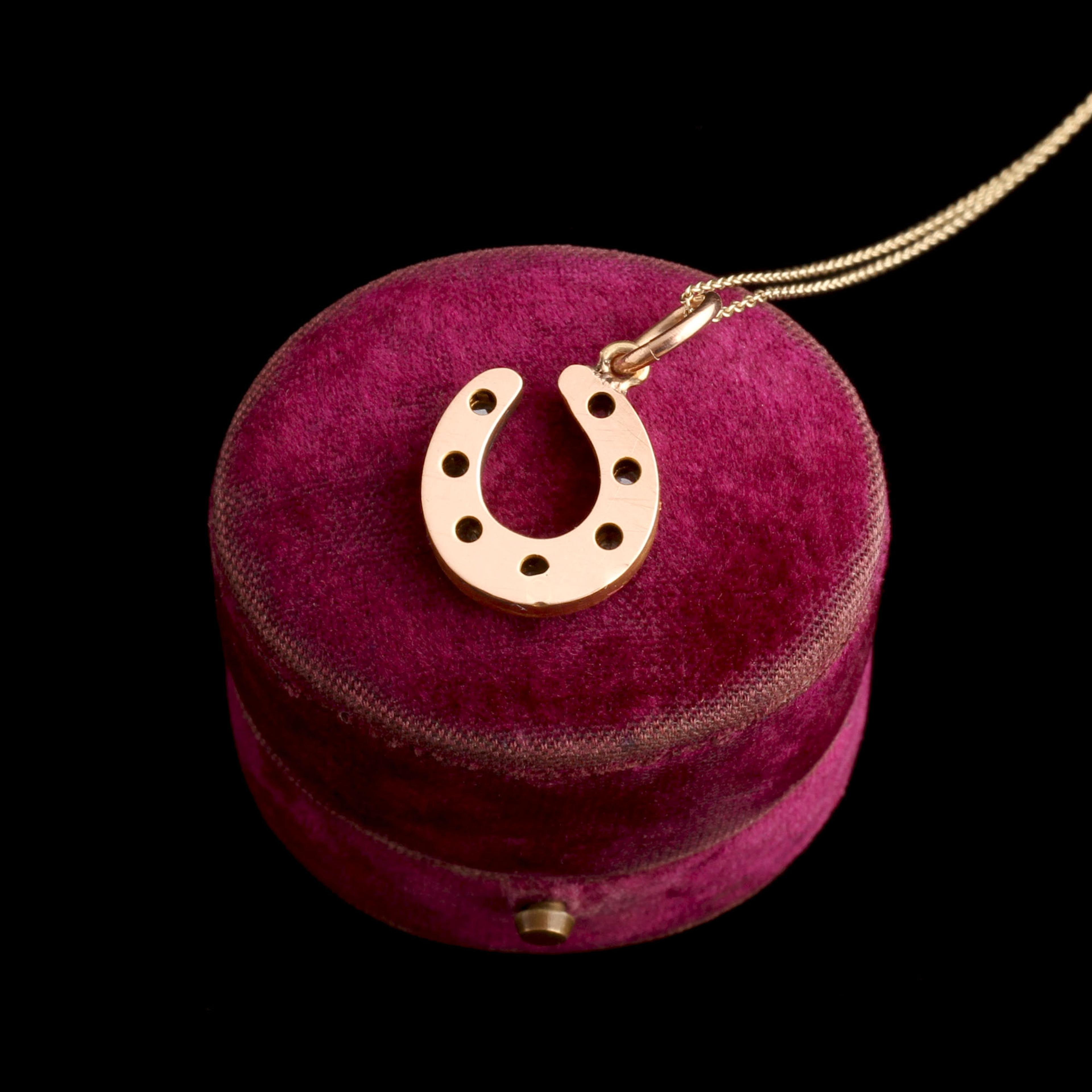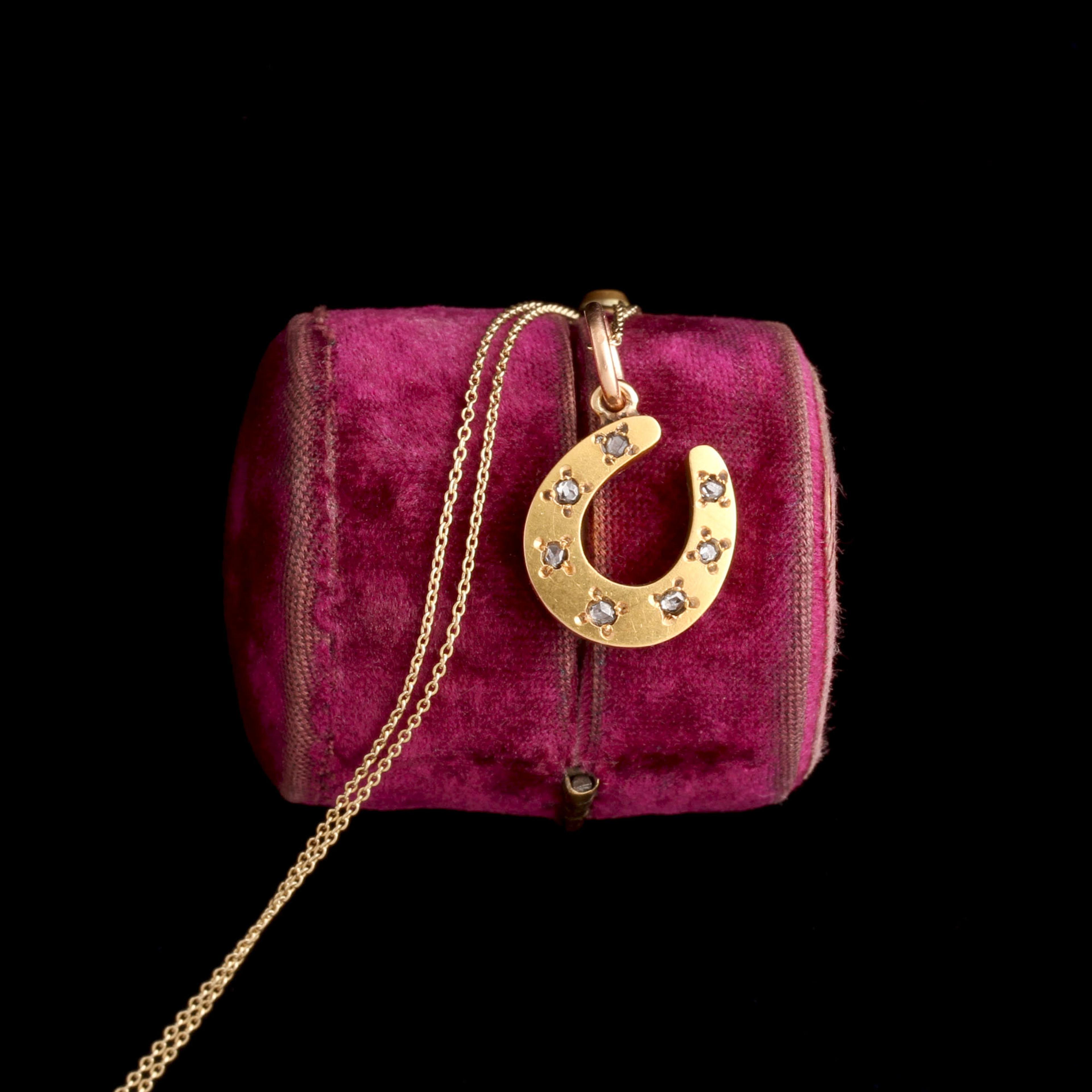 A late 19th century horseshoe charm modeled in 18k gold and set with seven rose cut diamonds.