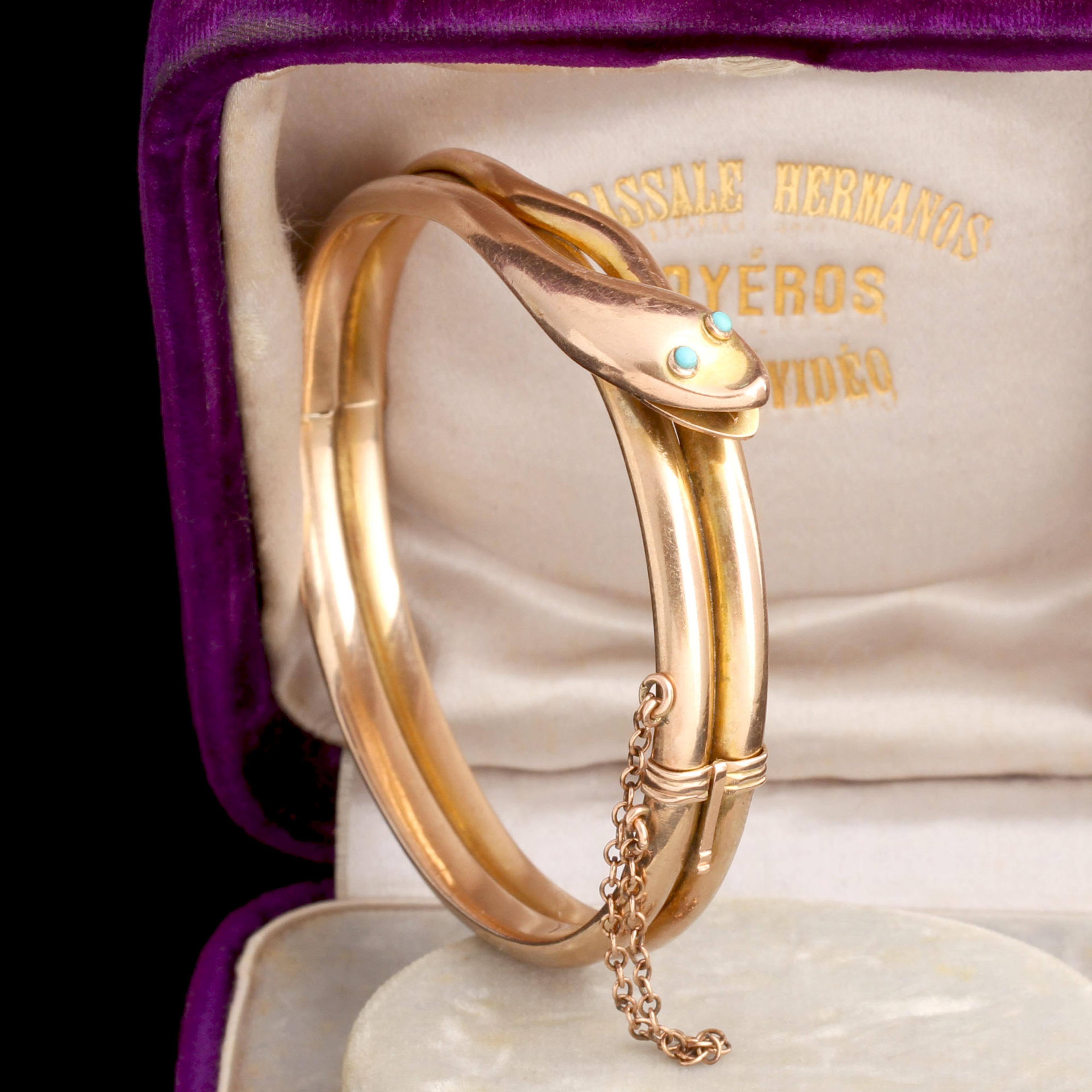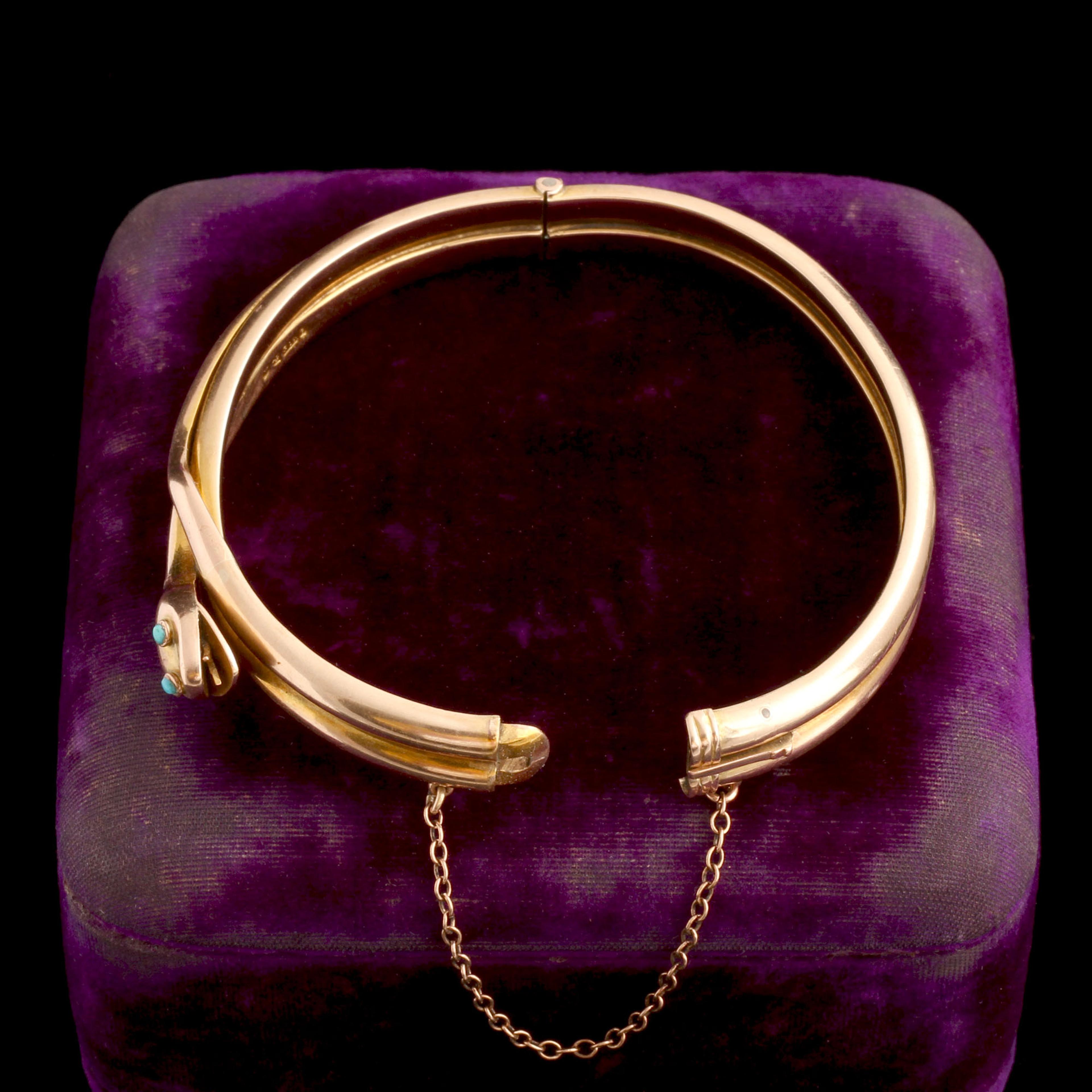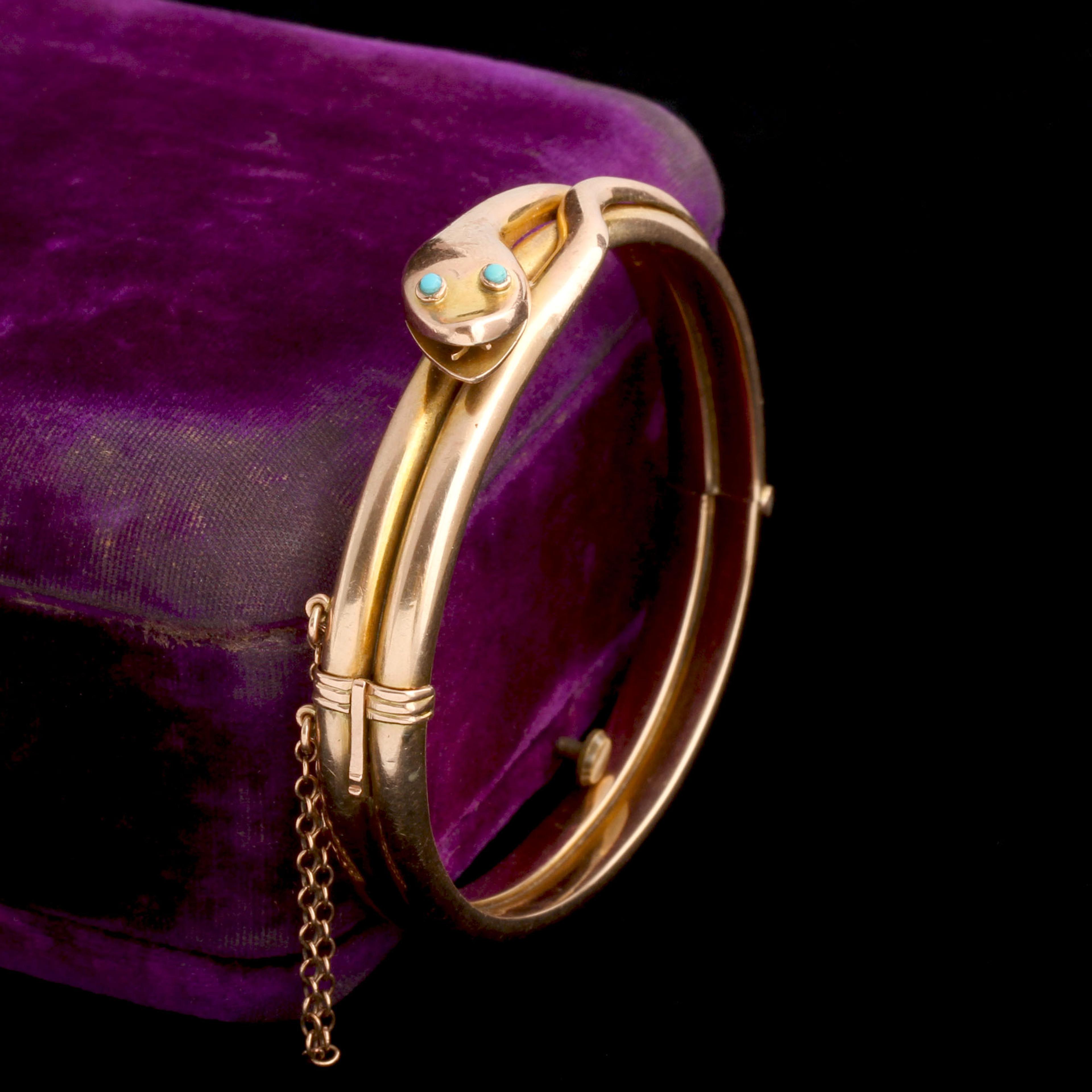 DEEP INSIDE this enthusiastic snake's open mouth, a forked tongue lies. Buggy turquoise eyes, wiggly tail, smiley expression = perfection. The clasp is secure; it's marked "Patent Bolt Snap".