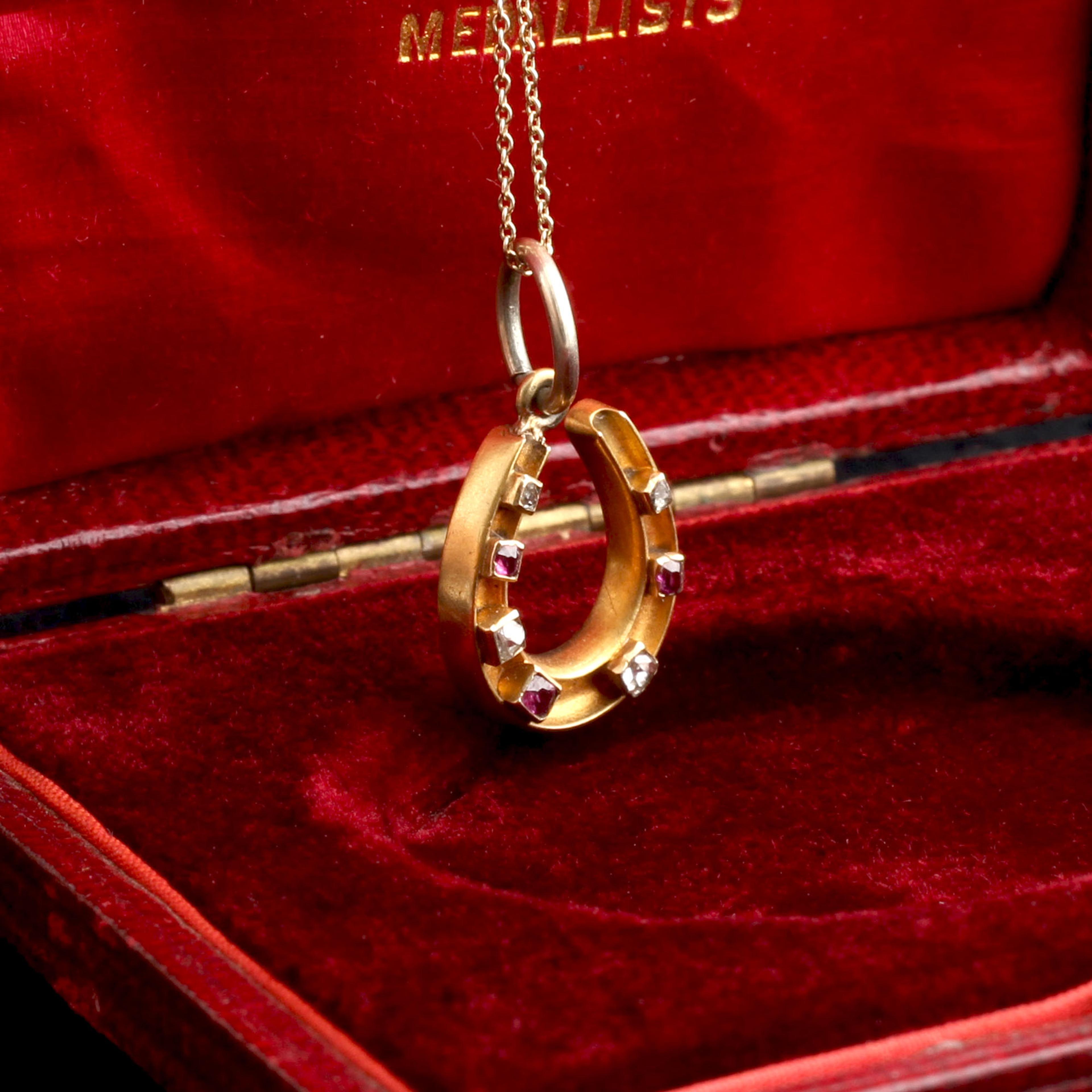 HUMANS HAVE CARRIED and worn lucky charms forever. Although the 19th and 20th centuries were thought to be ages of reason and science (and definitely not superstition) people still kept horseshoes close, just in case. Iron was believed to guard against trouble, so full-size shoes were nailed above doorways. The crescent shape also reached back to much older, pre-Christian lunar goddesses of protection. Here, the 7 (lucky!) nails are made of rose cut diamonds and old cut rubies set in square mounts.