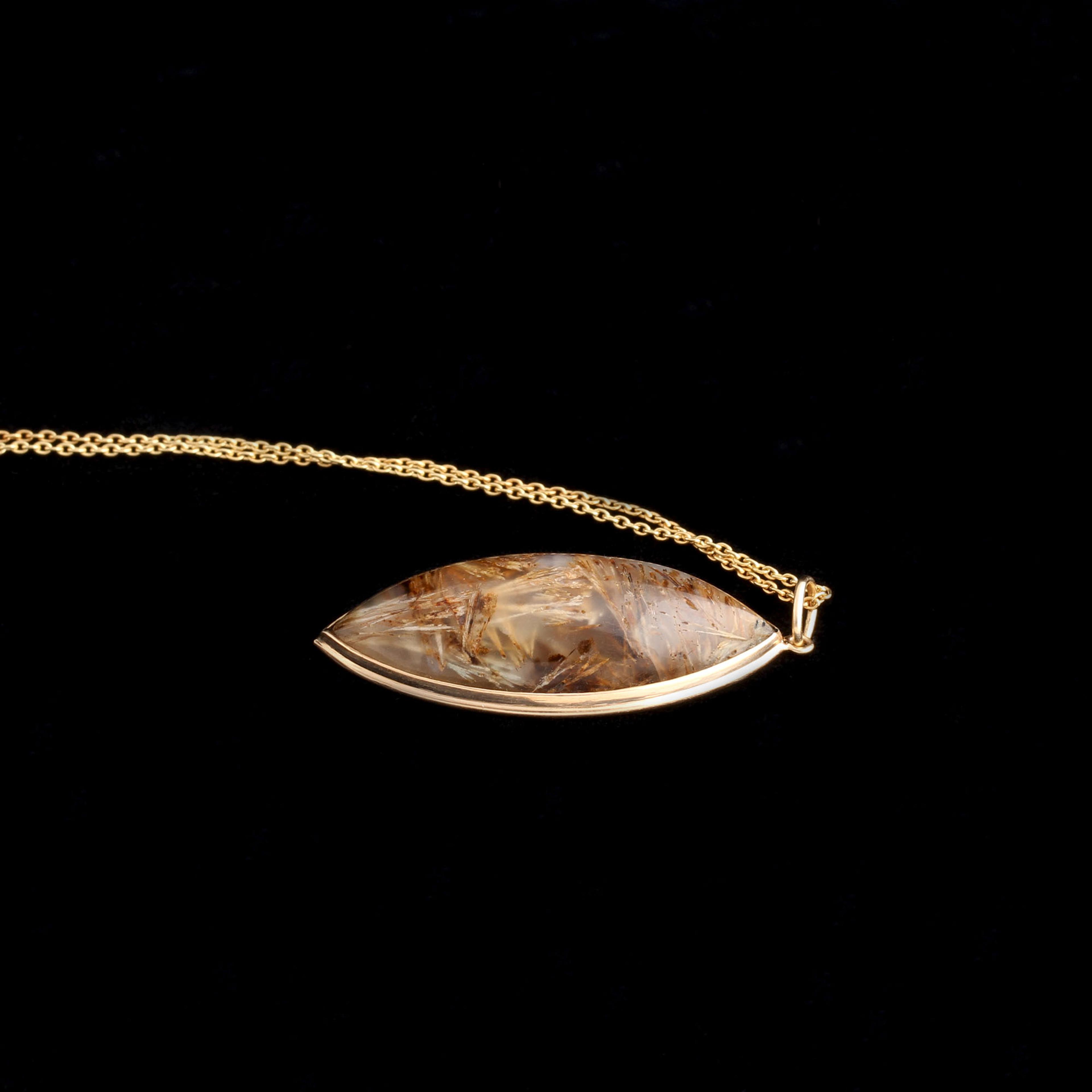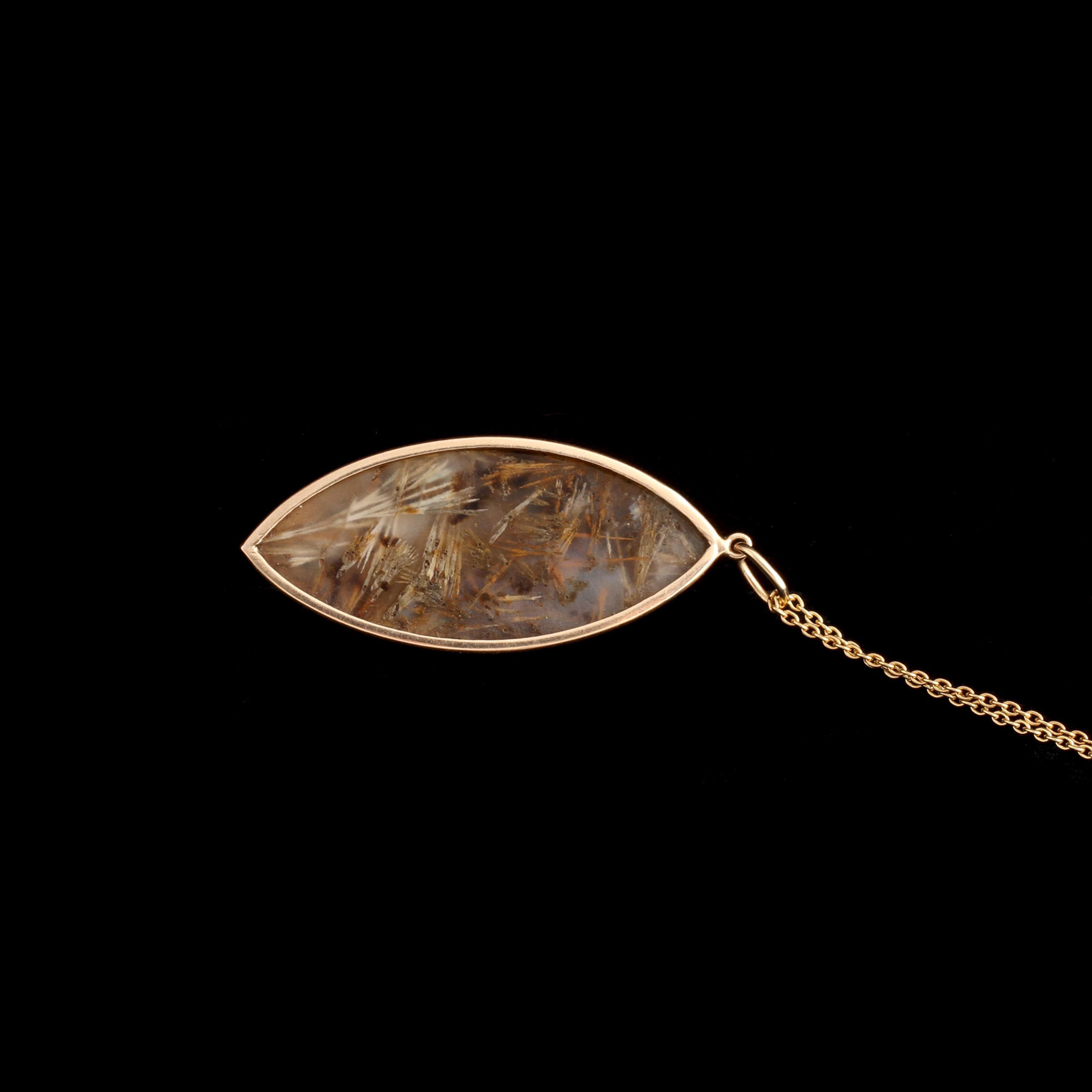 This rutilated quartz cabochon has golden needle-like inclusions that seem to float within the stone. In the 19th century, quartz with these natural threads of rutile was prized as a “Venus hair stone,” thought to bring insight and creative clarity. The elongated navette shape was extremely popular in the 1840s.