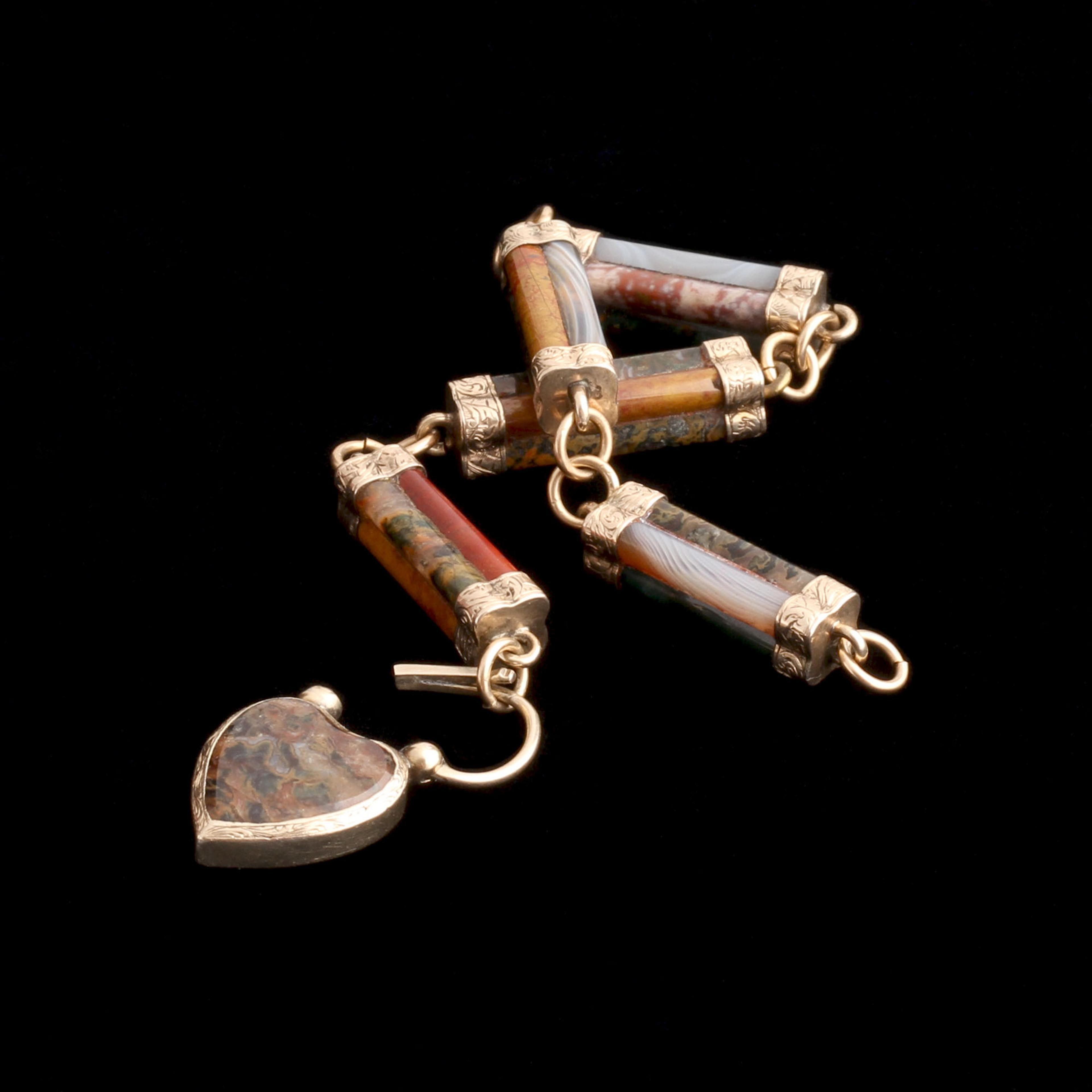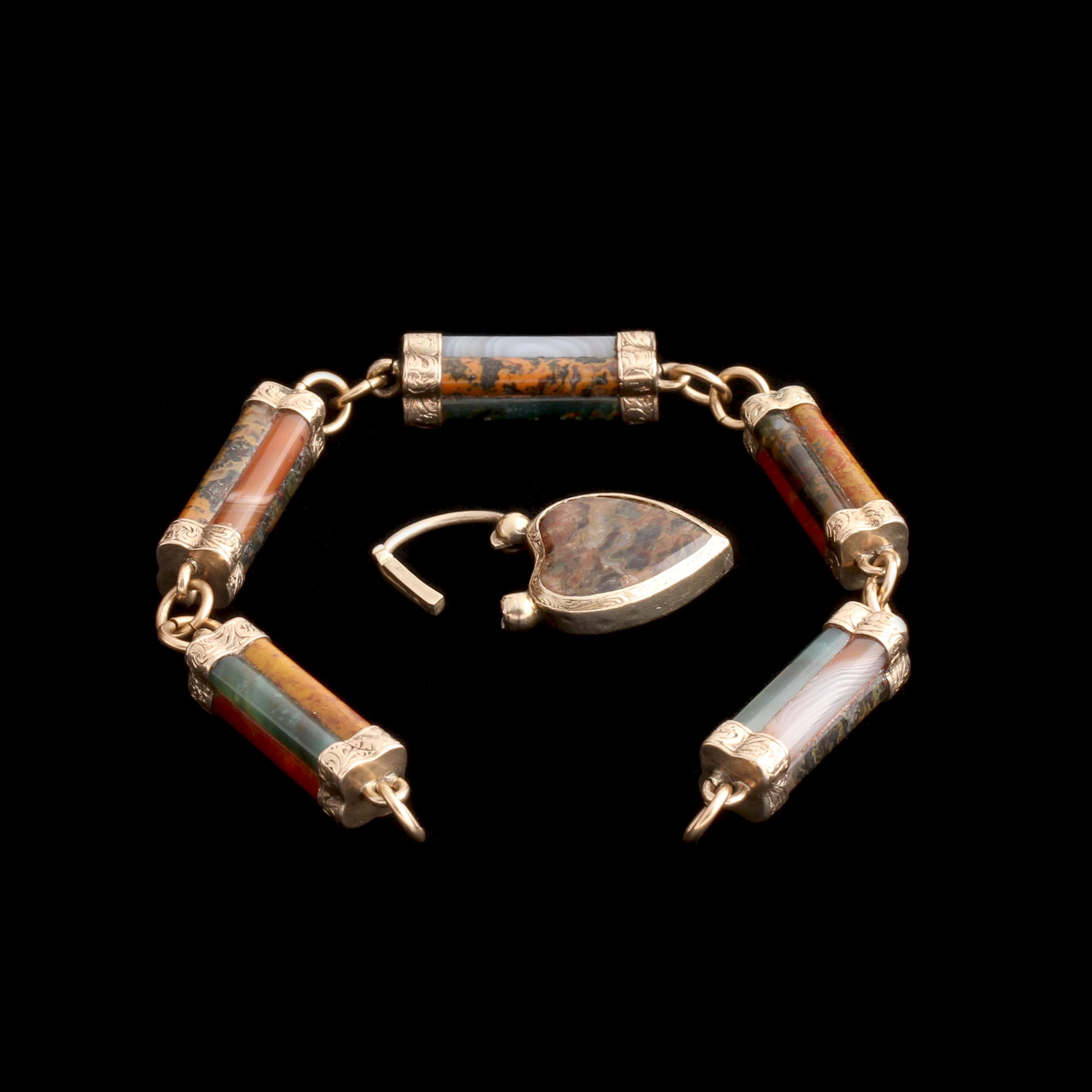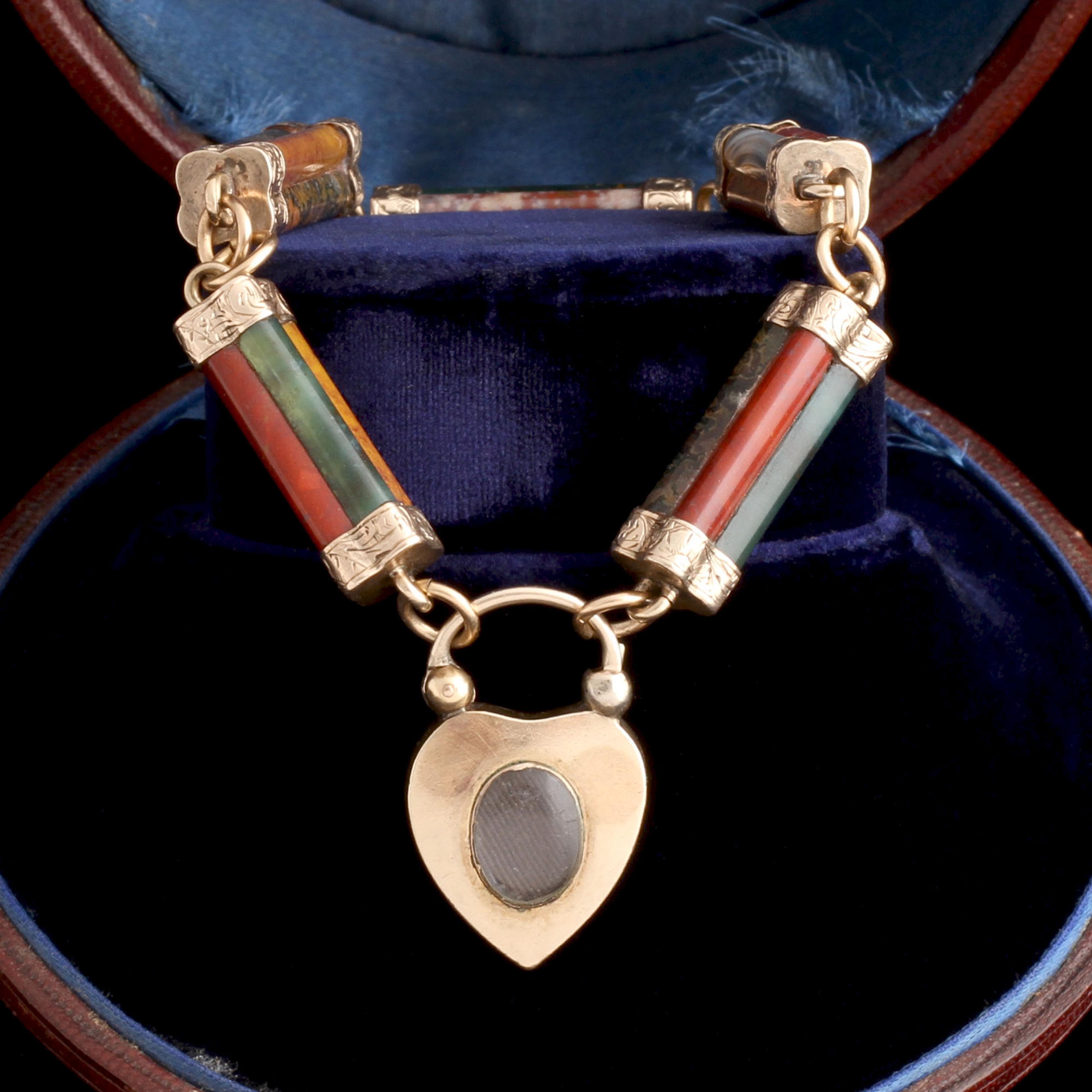 In 1848, Queen Victoria and Prince Albert purchased Balmoral Castle in the Highlands of Scotland. Victoria, enamored with Scottish design, popularized tartan plaids at court and commissioned jewelry in native stones. Pieces like this - crafted from indigenous agates - became the height of 19th century fashion. All over the UK, trendy women sought out Scottish "Pebble" jewelry to signal their good taste. Most examples were made in silver, but the finest, like this bracelet, were rendered in gold. A locket is cleverly hidden behind the heart-shaped clasp.