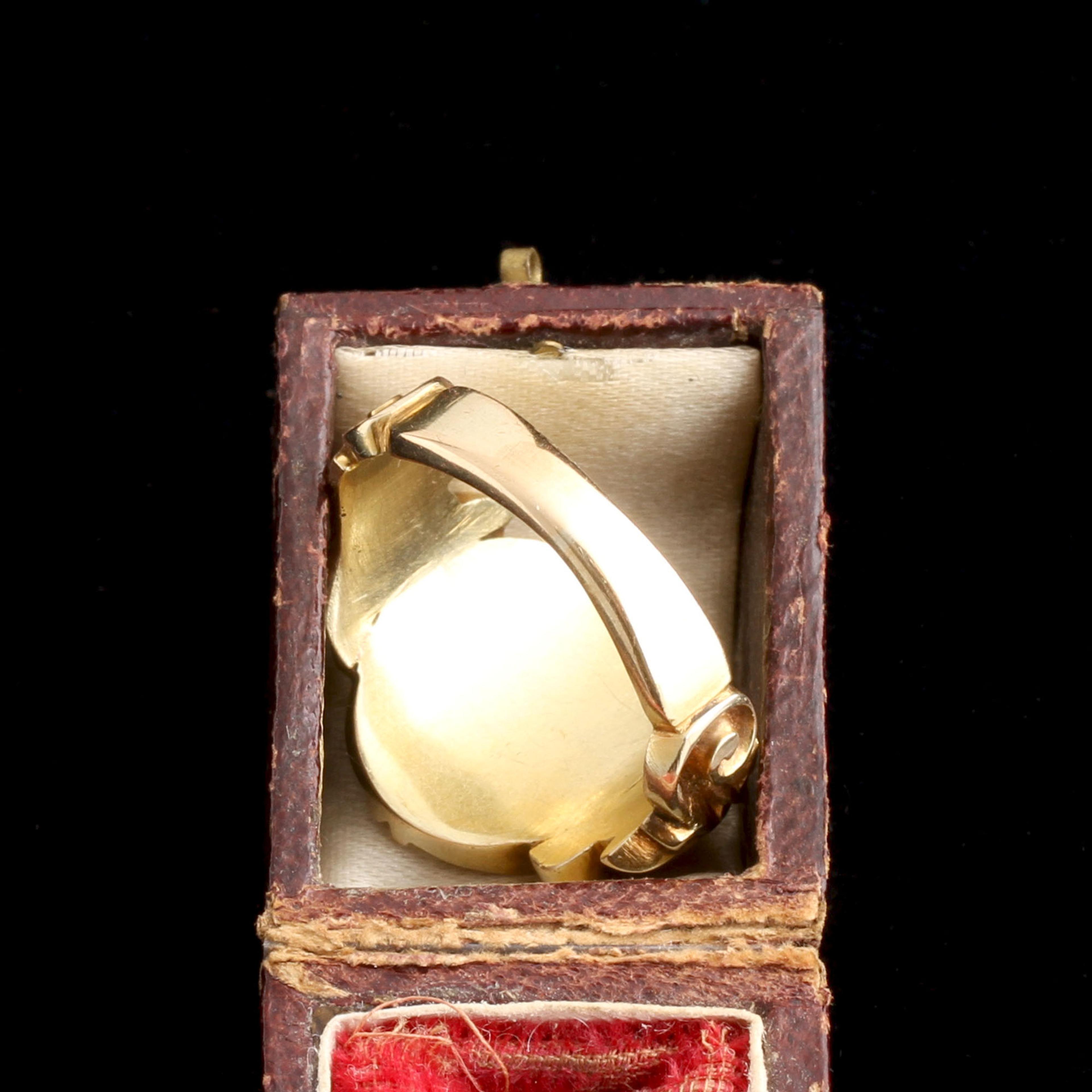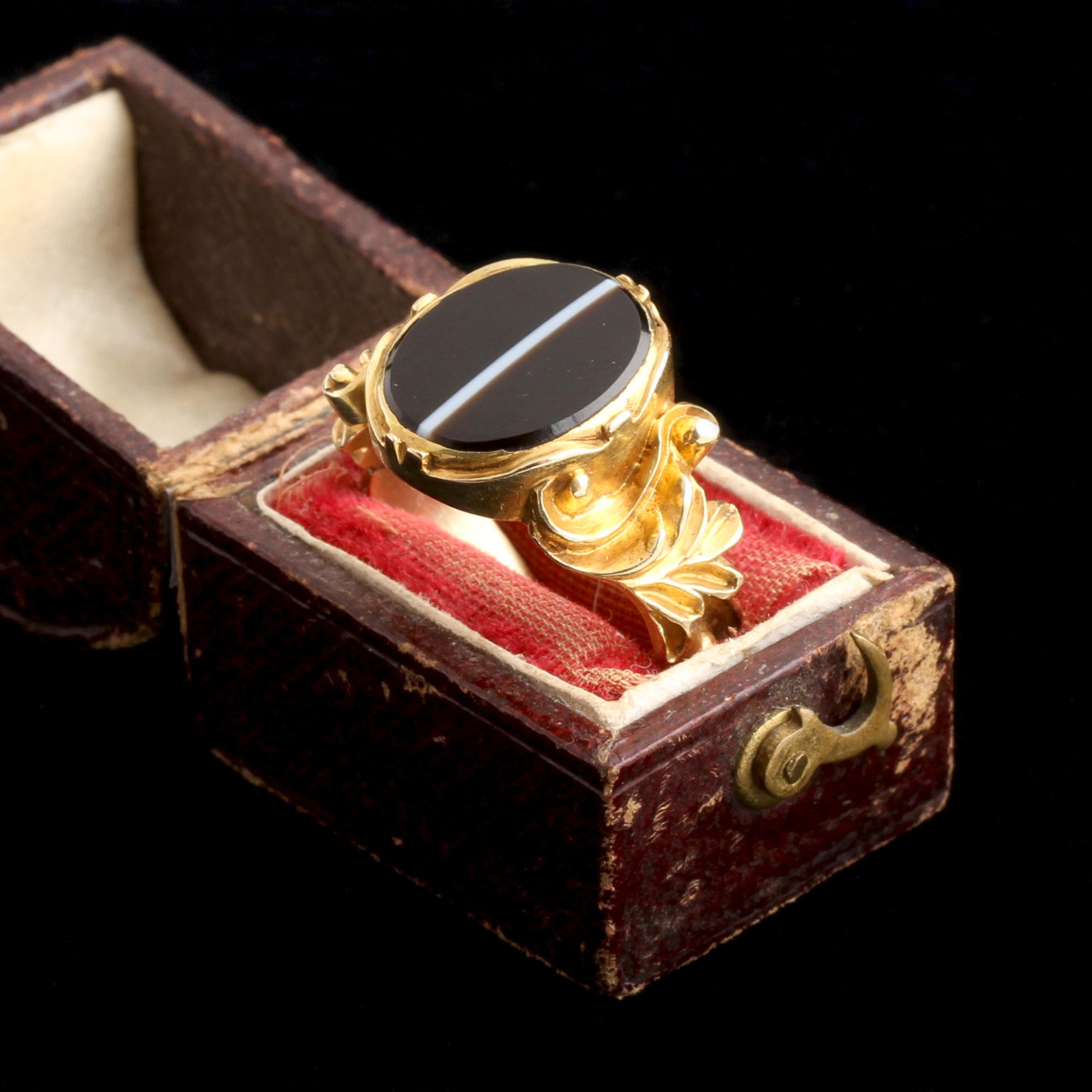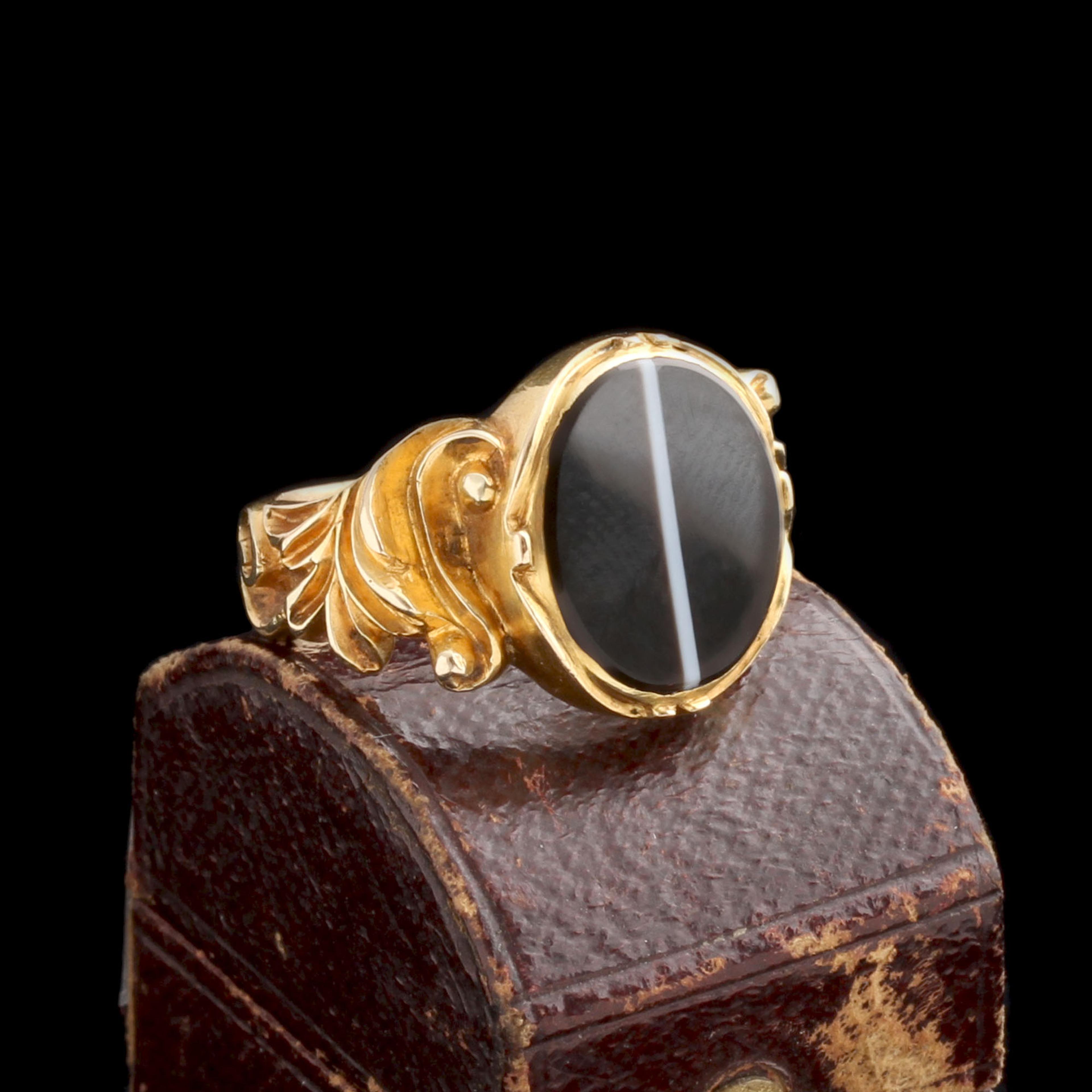 Agate derives its name from the Achatus river in Sicily, where sizable deposits of the stone were discovered as early as 300BC. Banded agate (also known as onyx) is the stone most often used in carving cameos and intaglios, cutting them en cabochon or fashioning round beads with a single stripe came into vogue in the mid 19th century. This c. 1870 signet ring is modeled in gold with dramatic scrolled shoulders and a deep brown and white banded agate. To the New Age school of thinking, agate of this particular hue is believed to bring victory in conflict and elevate one’s intelligence.