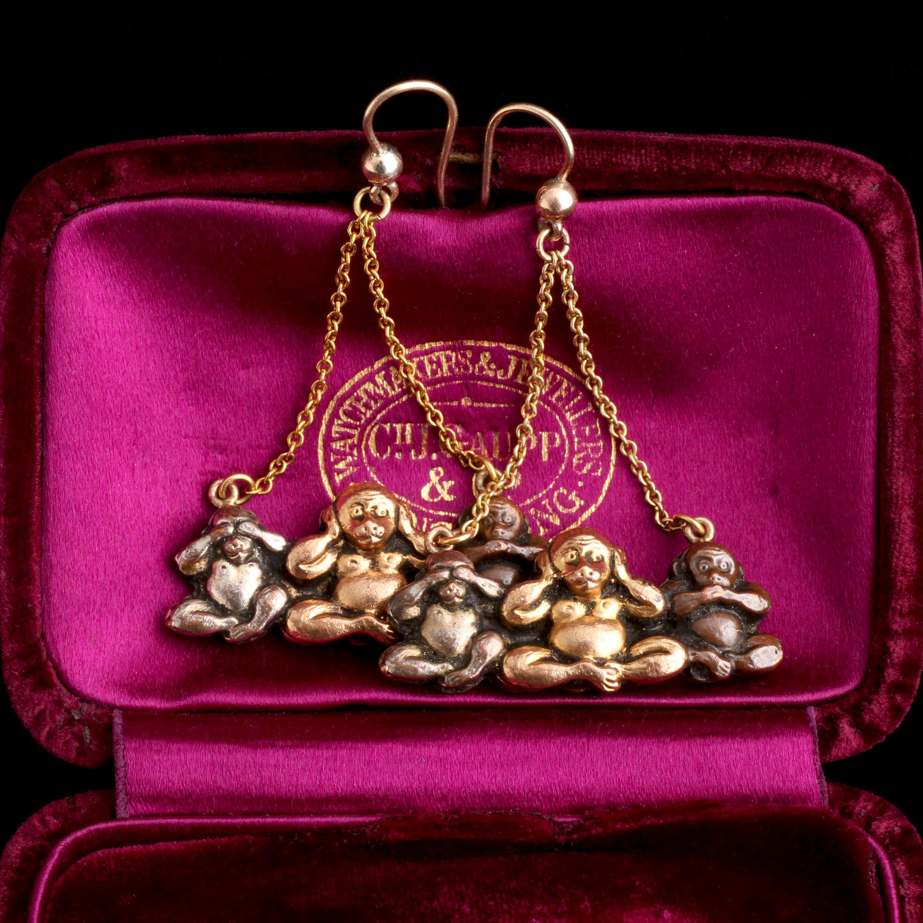 Small statuettes of three monkeys like these have been popular in Britain since the 1900s; they are known to have been carried as lucky charms by soldiers in the First World War. They are identified with the proverbial saying ‘See no evil, hear no evil, speak no evil’, first recorded in 1926 and now generally used sarcastically against those who - through selfishness or cowardice - choose to ignore some wrongdoing. The Wise Monkeys originated in Japan, where they have been known since the 16th century; statues of them are set at crossroads in honour of Koshin, the God of Roads, whose attendants they are. There, their slogan is Mi-zaru, kika-zaru, iwa-zaru, ‘No seeing, no hearing, no speaking’, with a pun on Japanese for ‘Monkey’, and it is used to teach prudence and purity.