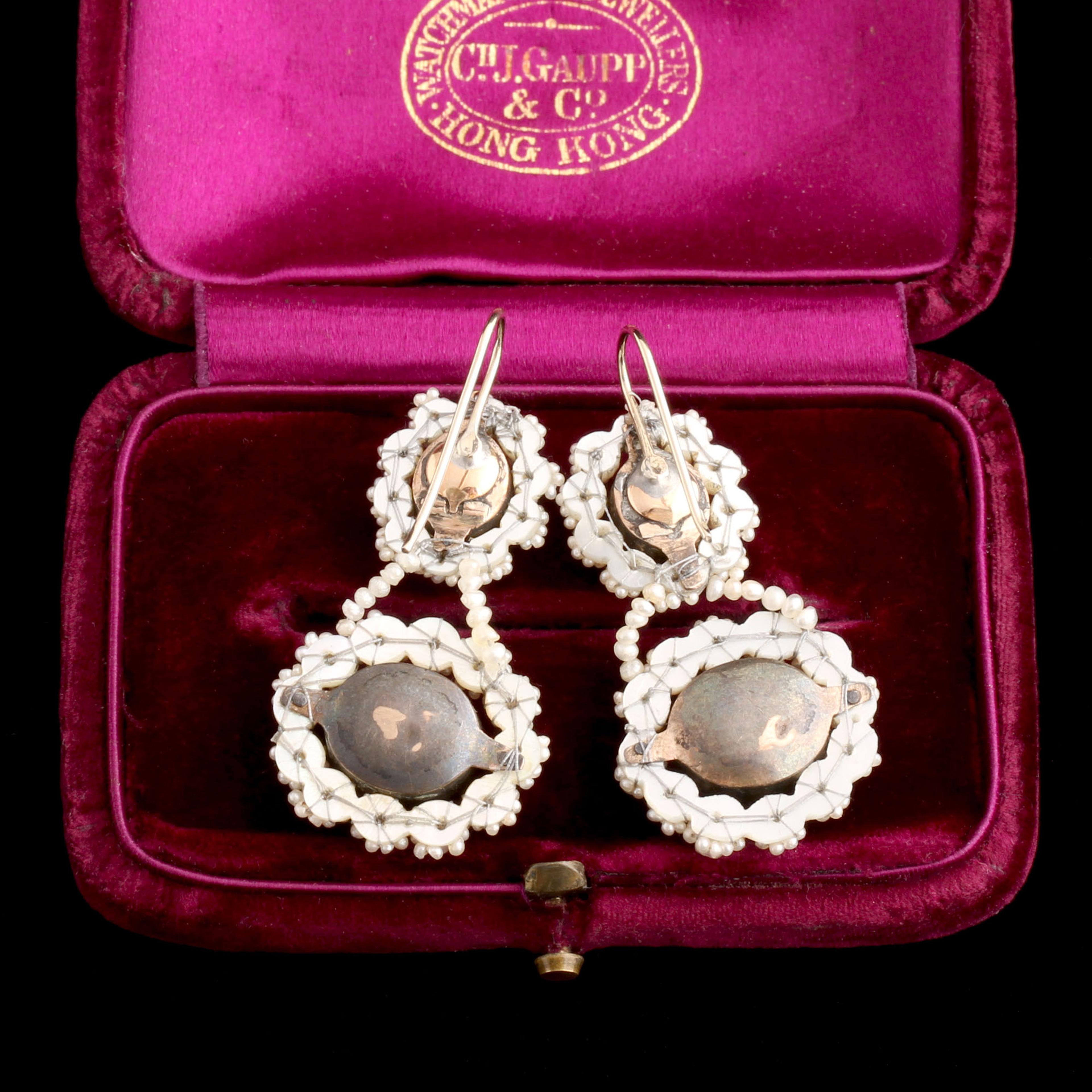 Sparkling purple pastes—cut to imitate amethyst—glow at the center of each collet-set drop. They're backed in foil and surrounded by halos of seed pearls, all sewn onto a mother-of-pearl plate. In the 19th century, pearls signified purity and devotion, while purple stones were tied to loyalty and spiritual depth. The settings feature 14k gold ear wires with lightweight metal backing plates, a common construction of the period that allowed for larger statement earrings without excessive weight. The scale? Fierce.