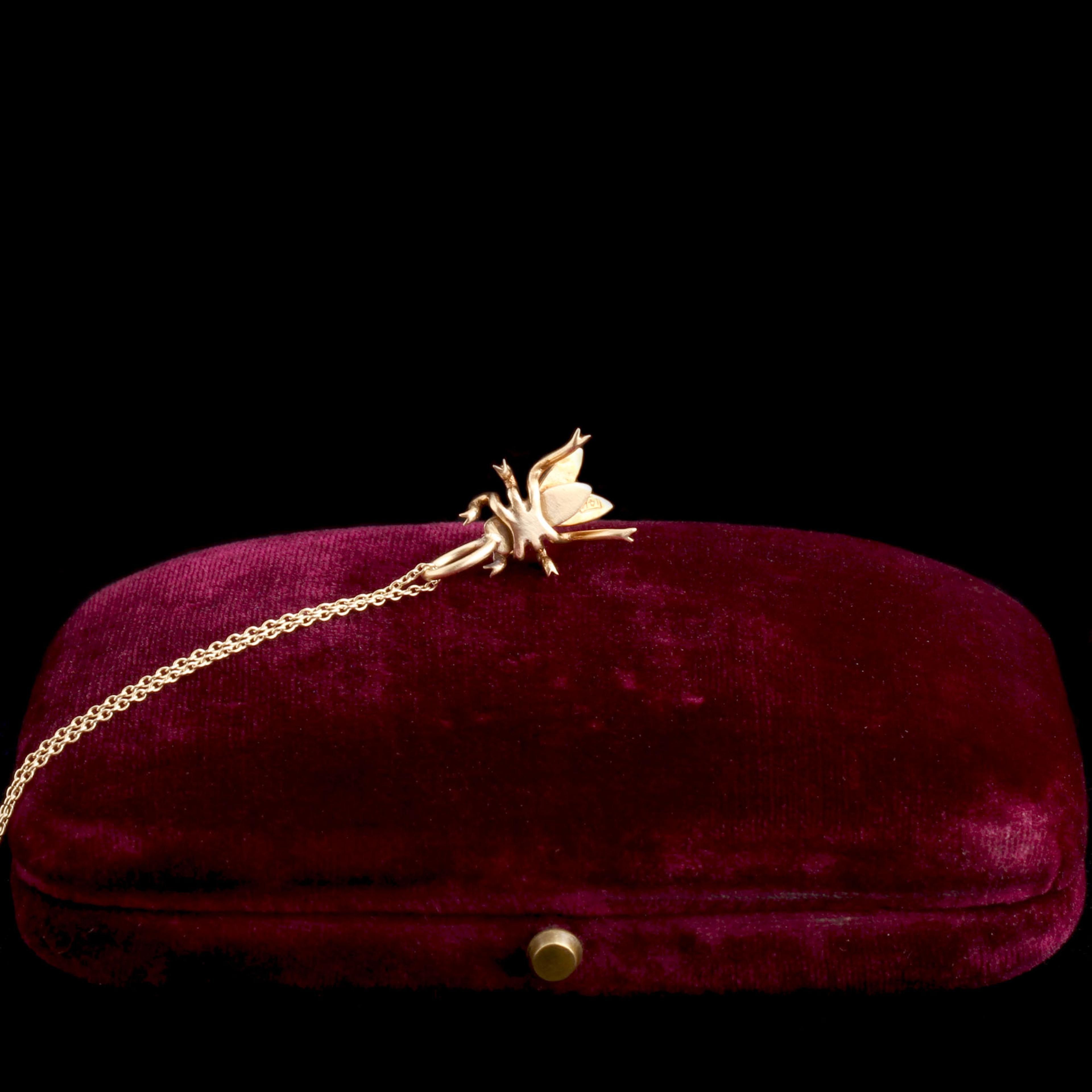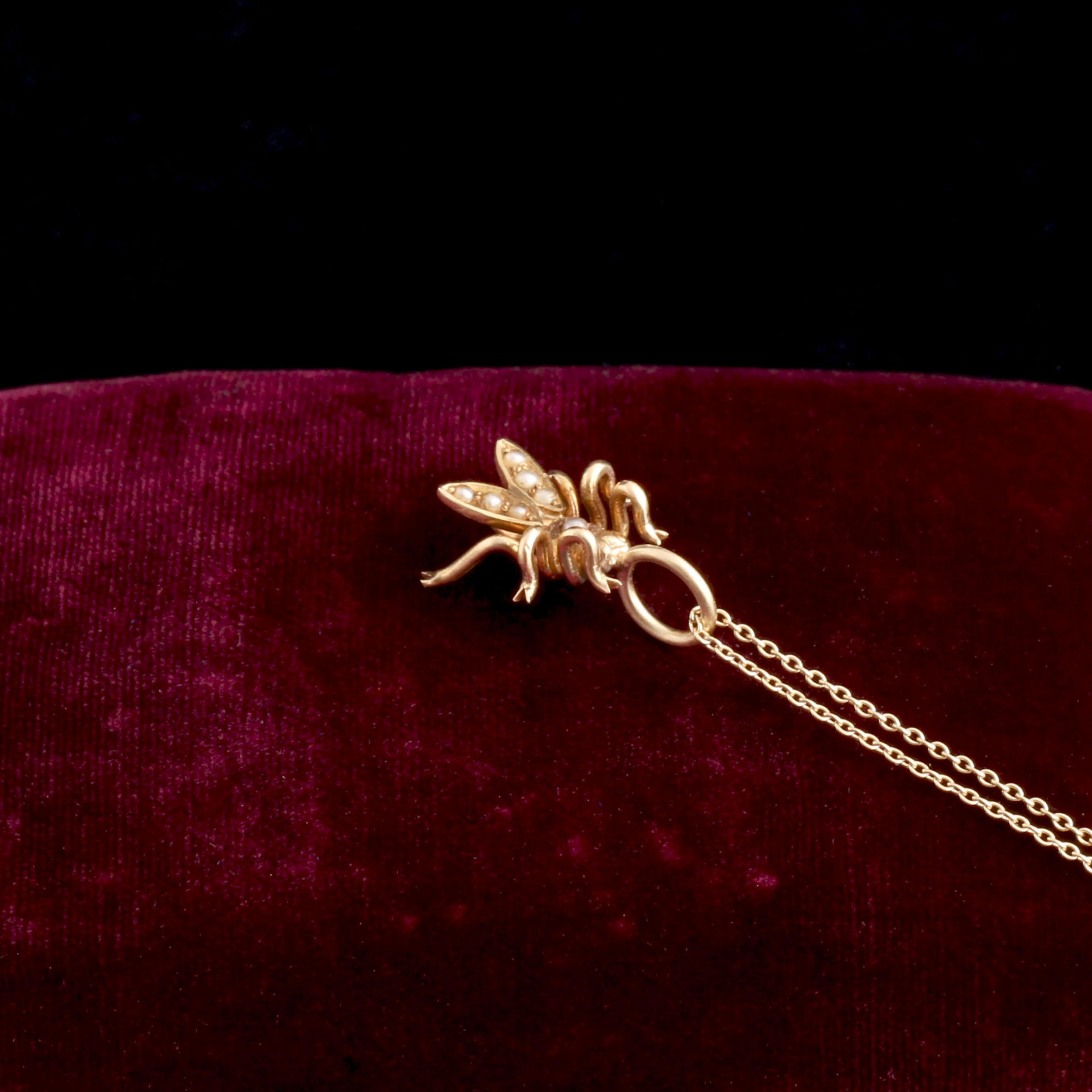 The Victorians and Edwardians loved a little bling at the neck. Stickpins could show what hobbies you were into AND served to secure your cravat/tie/ascot. In the 21st century, the complex neckwear is obsolete and most men (sadly) don't accessorize with jeweled animals. But these little sculptures were designed to be noticed, and many are complex works of craft. They've been reborn as pendants. This one is a tiny gold pearl-studded fly, an insect that symbolized secret-keeping during the Victorian era.