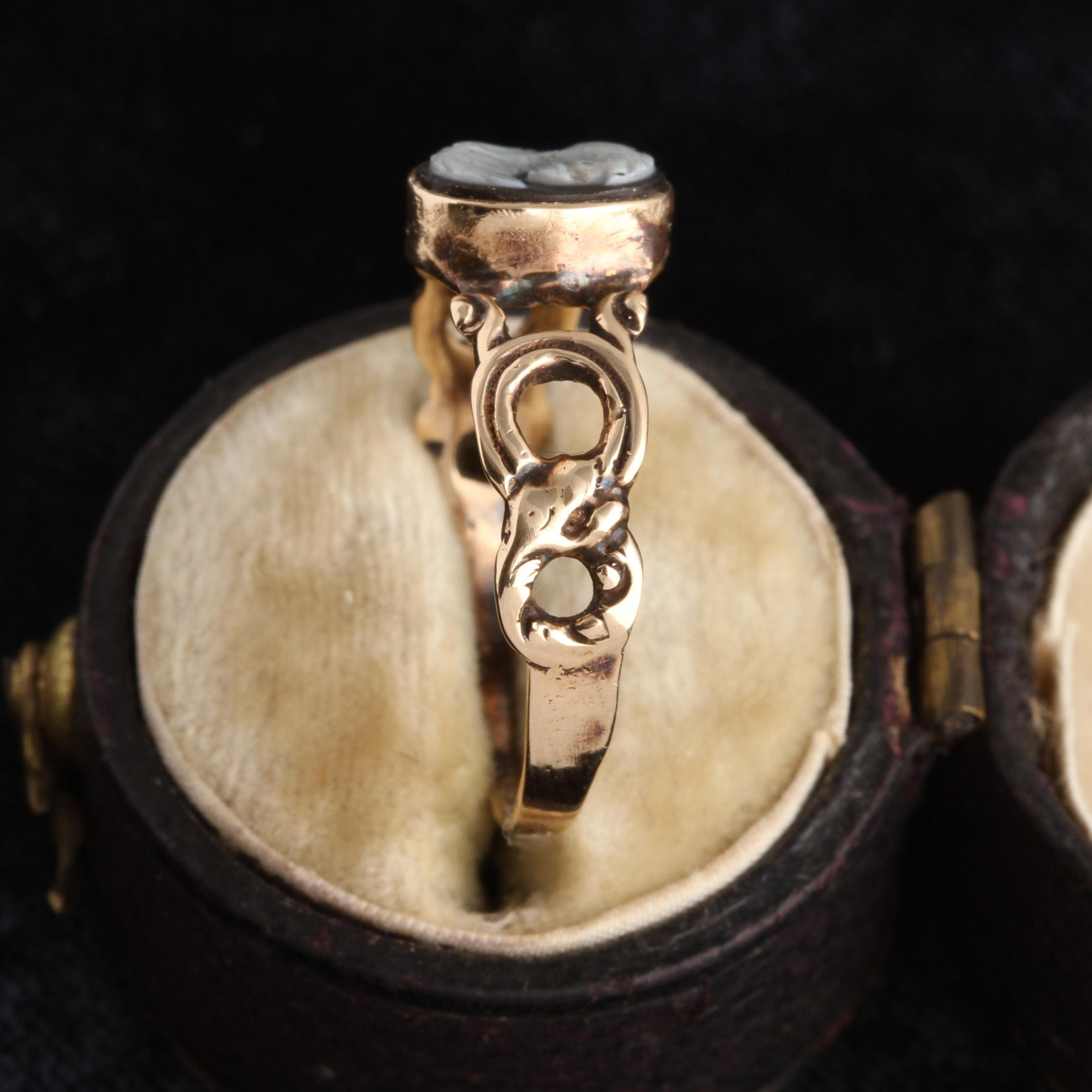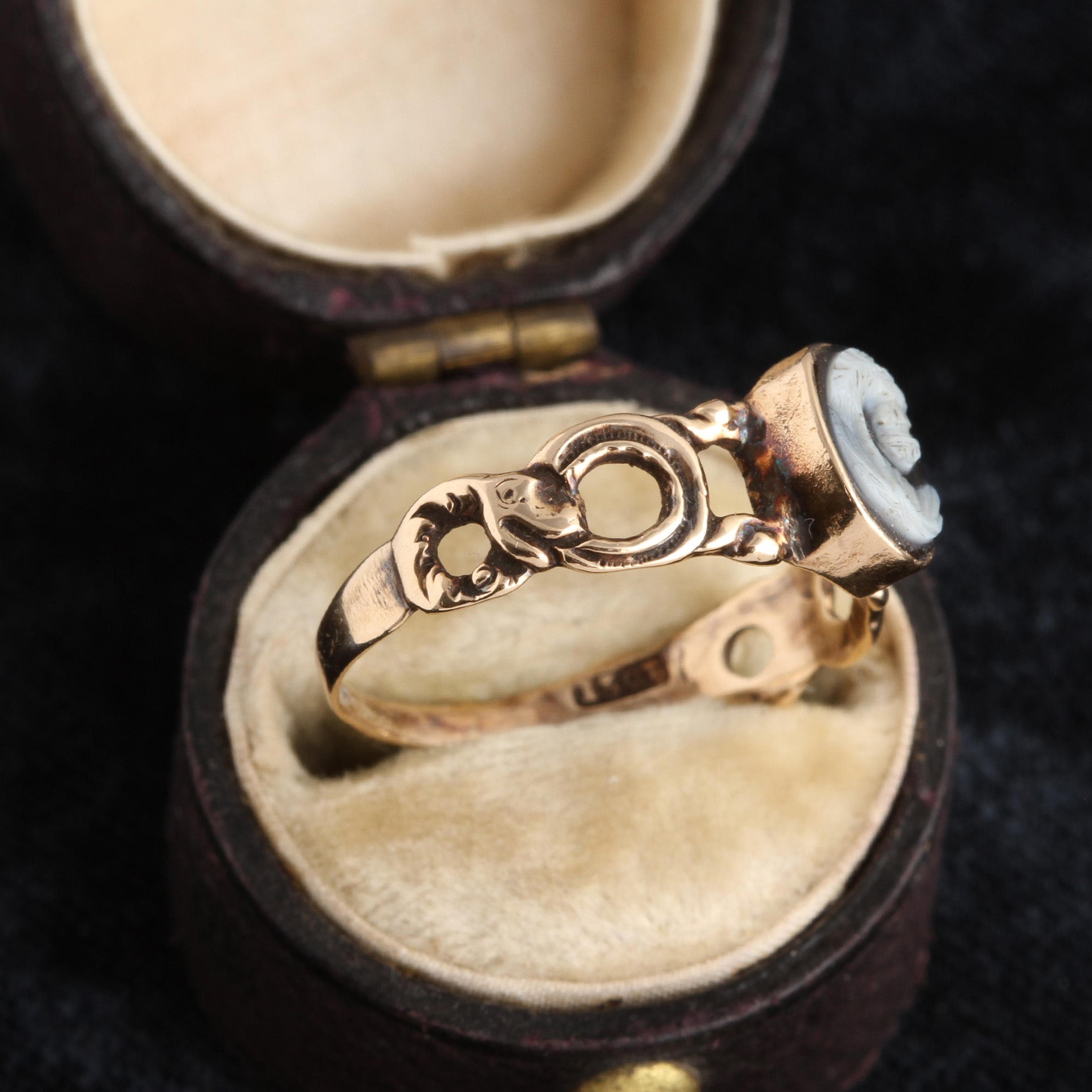 An unusual Victorian ring set with a hardstone cameo of an urn beneath a weeping willow. Note the shoulders, that's not just fanciful Victorian scrollwork, those are a pair of snakes twisted in the shape of infinity knots.