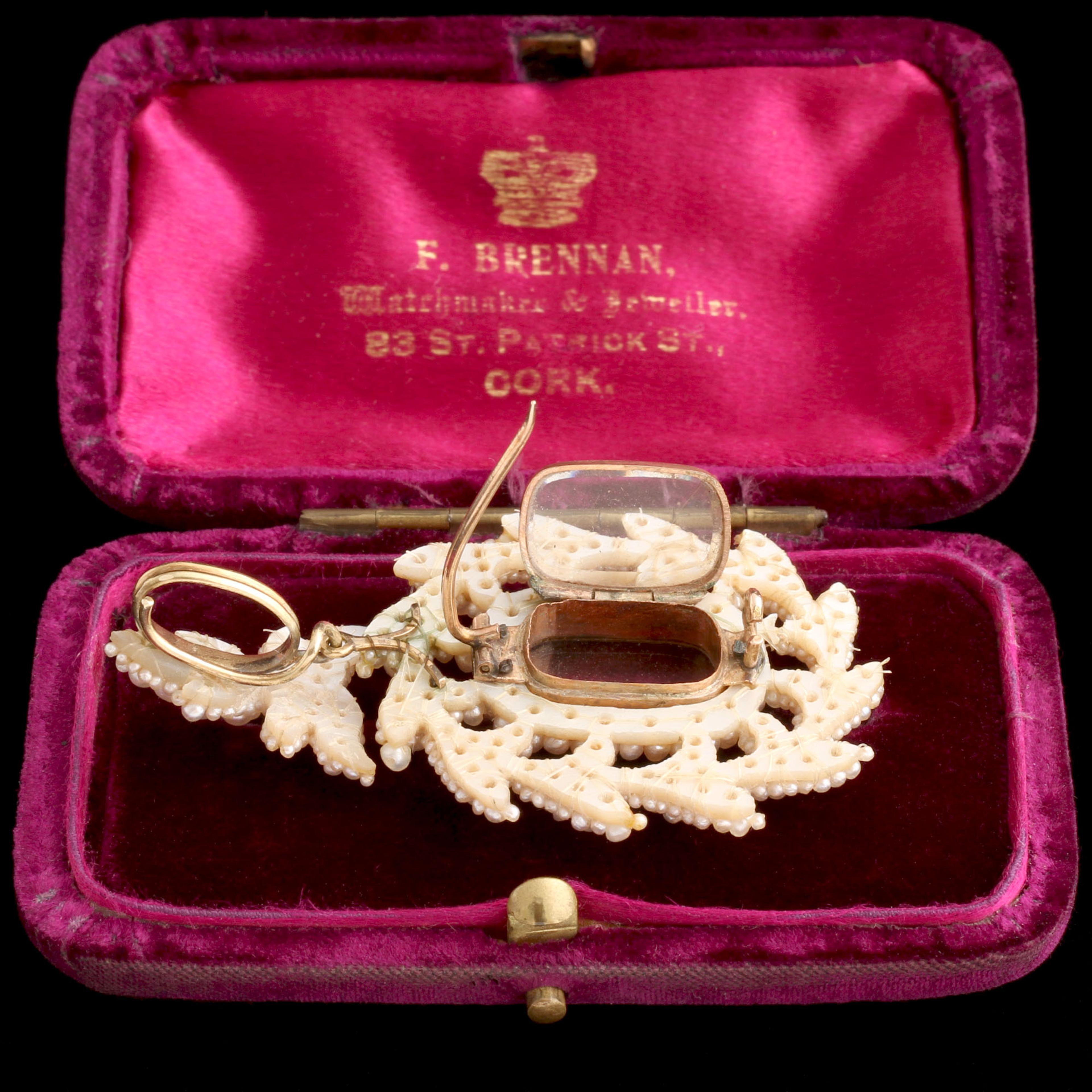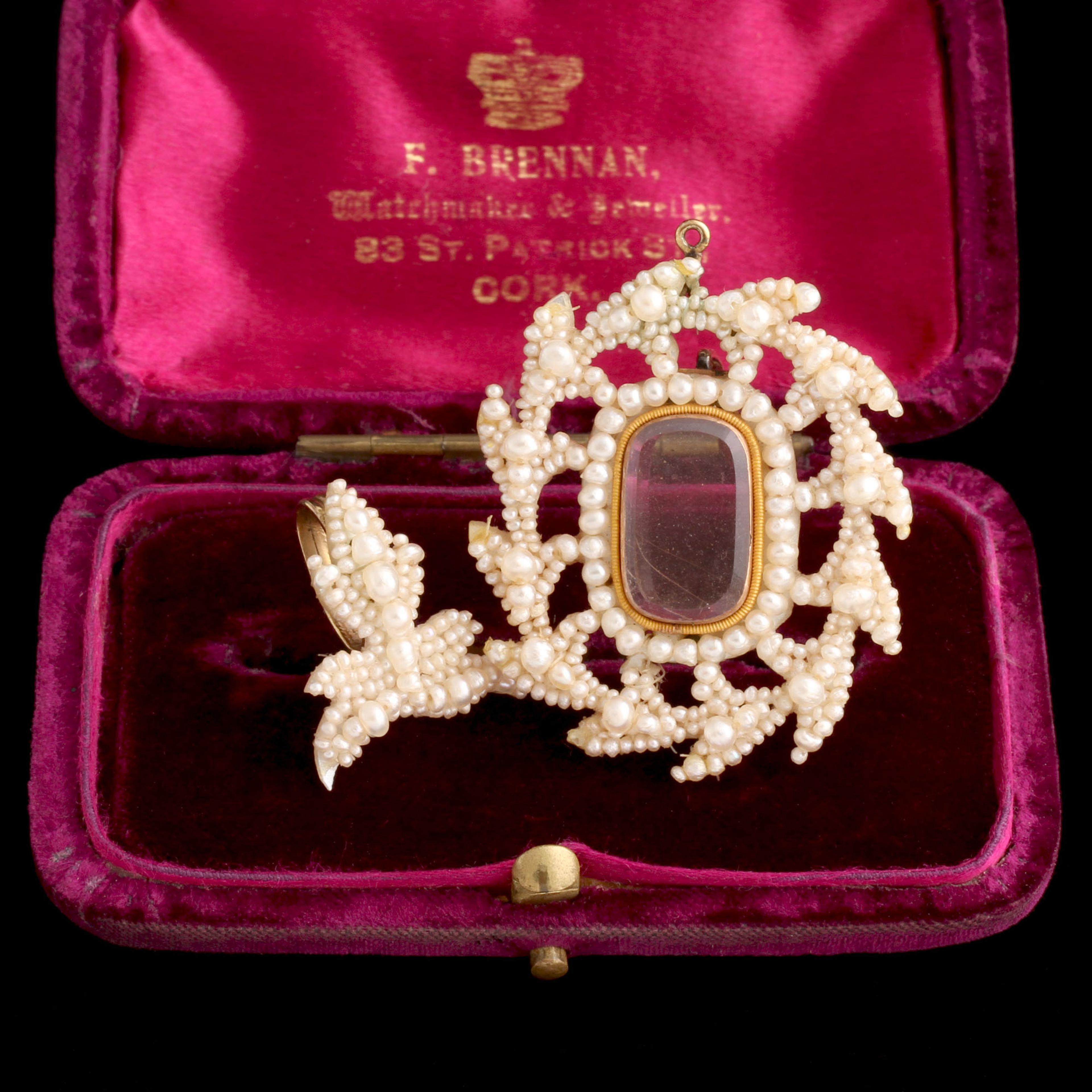 IN 19TH CENTURY England, tiny seed pearls perfectly suited the Neoclassical taste for intricacy and restraint. Large natural pearls were so rare that most people would never see one, let alone own one. Seed pearls were way more available: they could be harvested in large quantities from freshwater mussels in Europe and America, making pearl jewelry more accessible while retaining its associations with refinement and virtue. A dense, lacy surface of many sewn-on seed pearls may read to us as fussy now, but in the Romantic period, people wanted to exhibit morality over conspicuous display. Unless you were at court, or posing for an aristocratic portrait - then bring on the giant orbs.