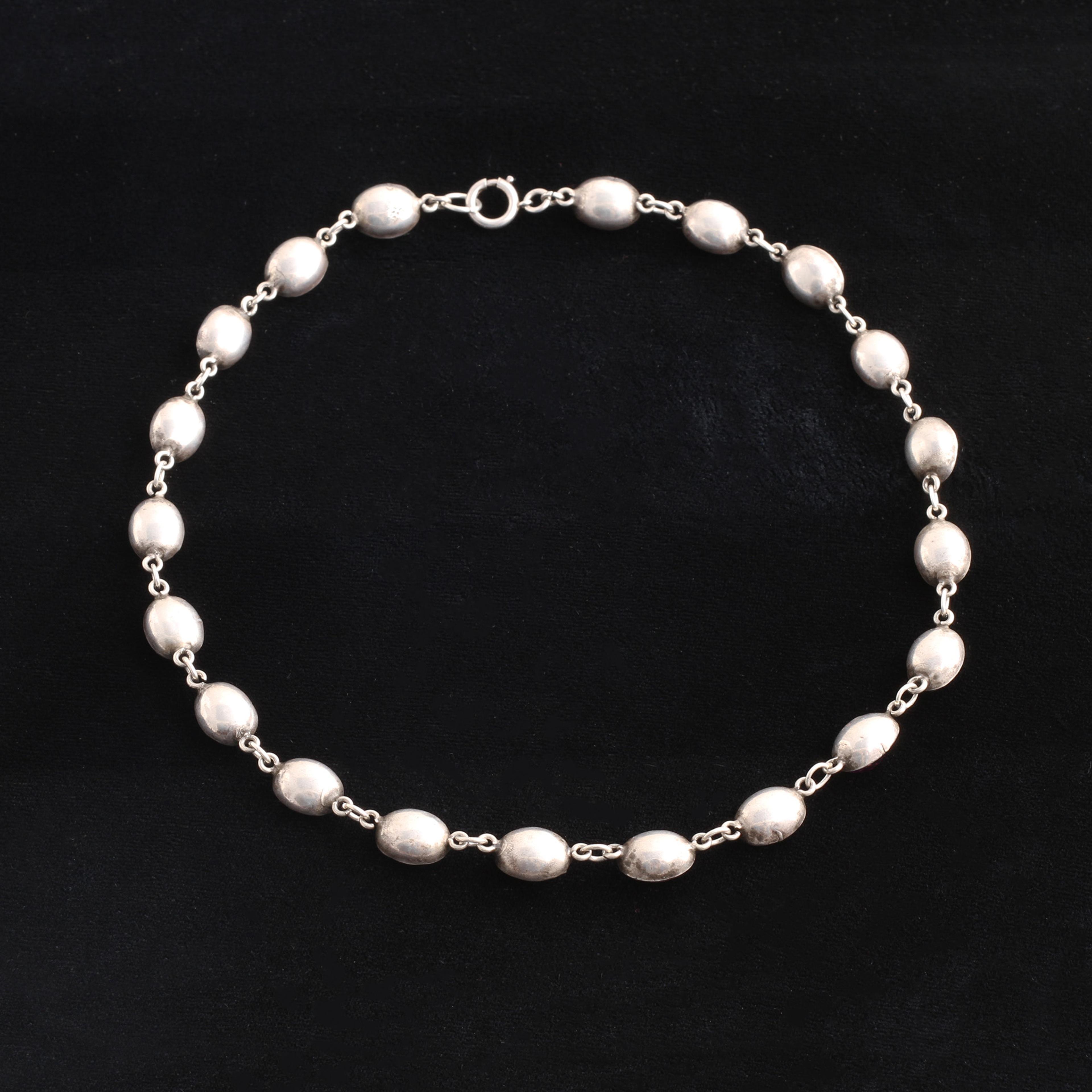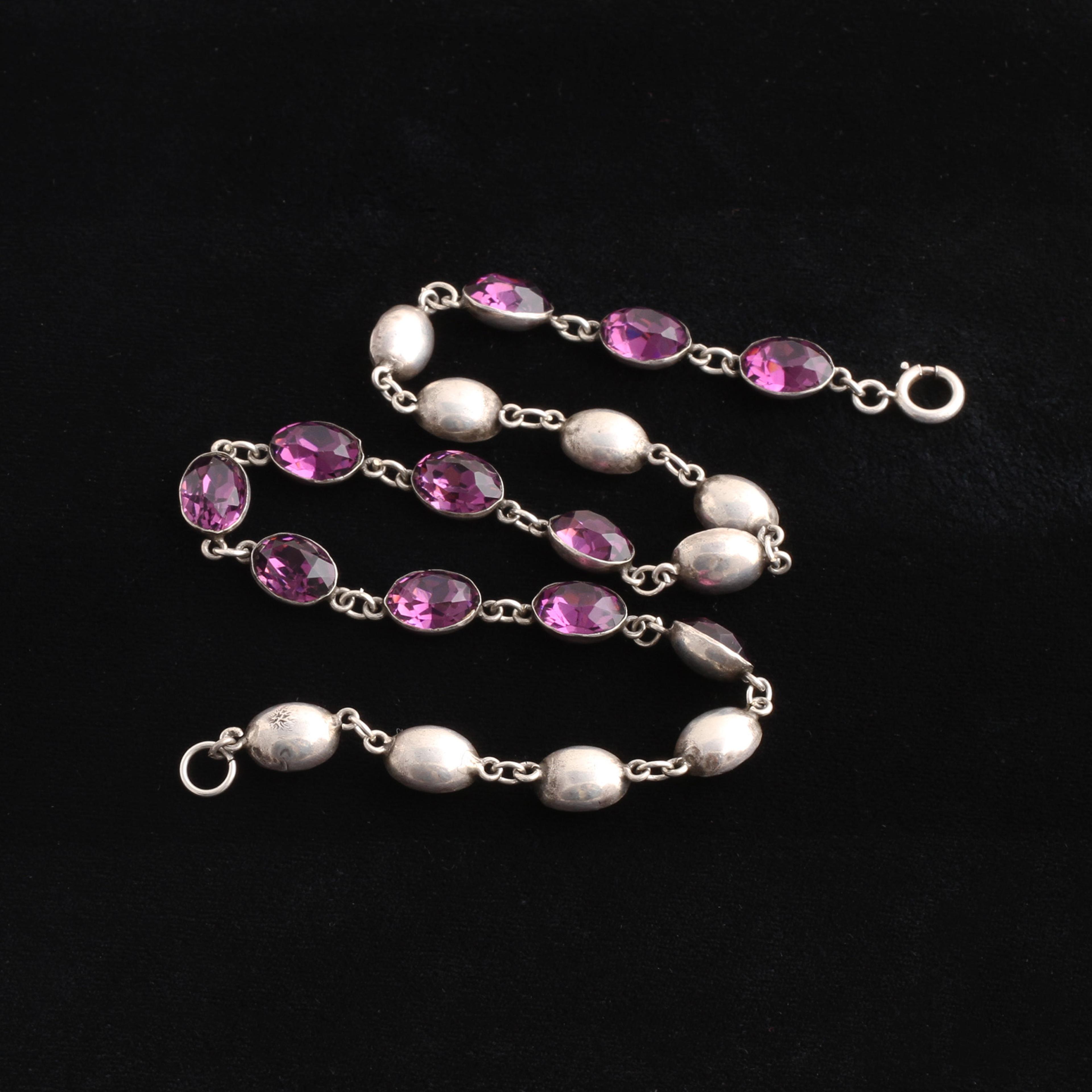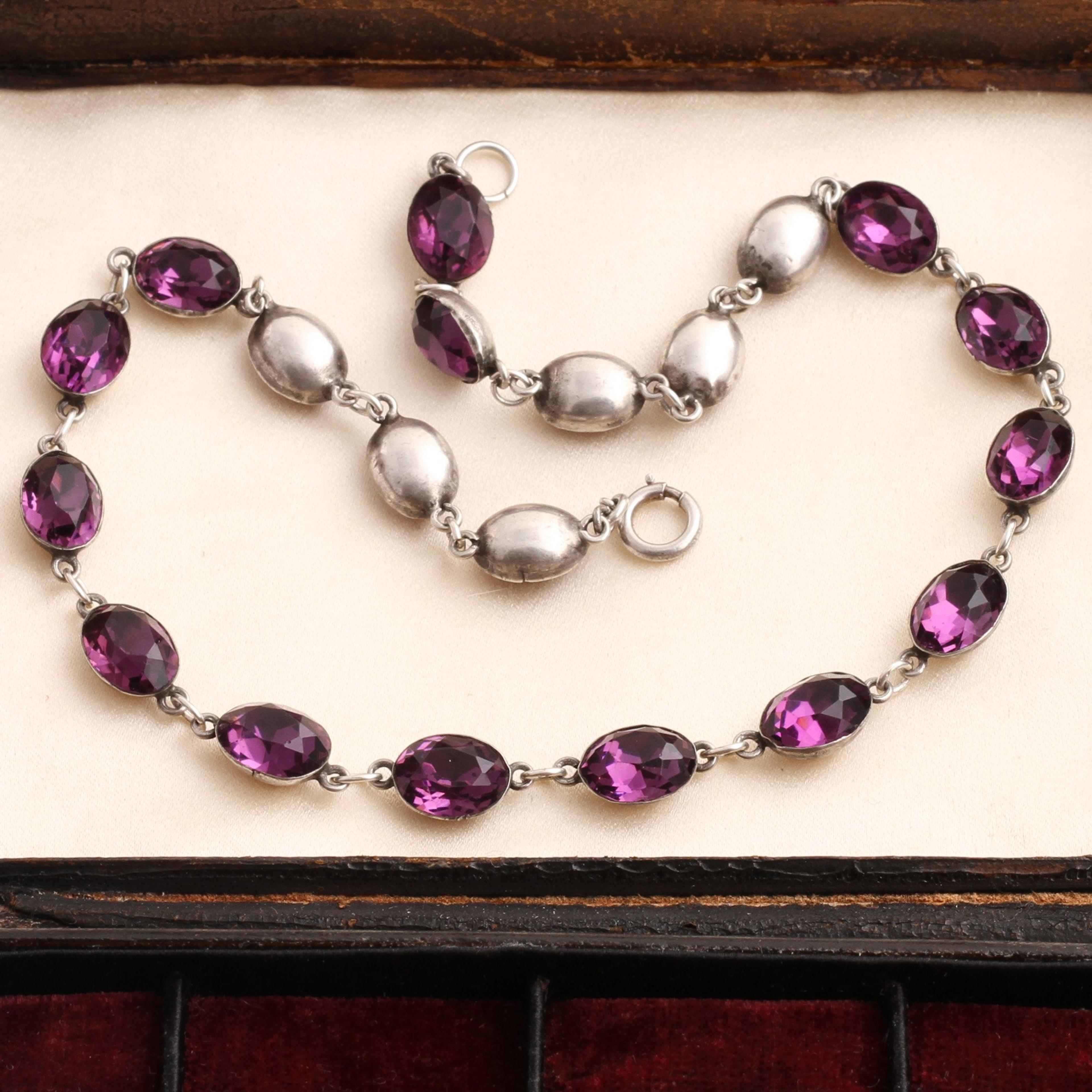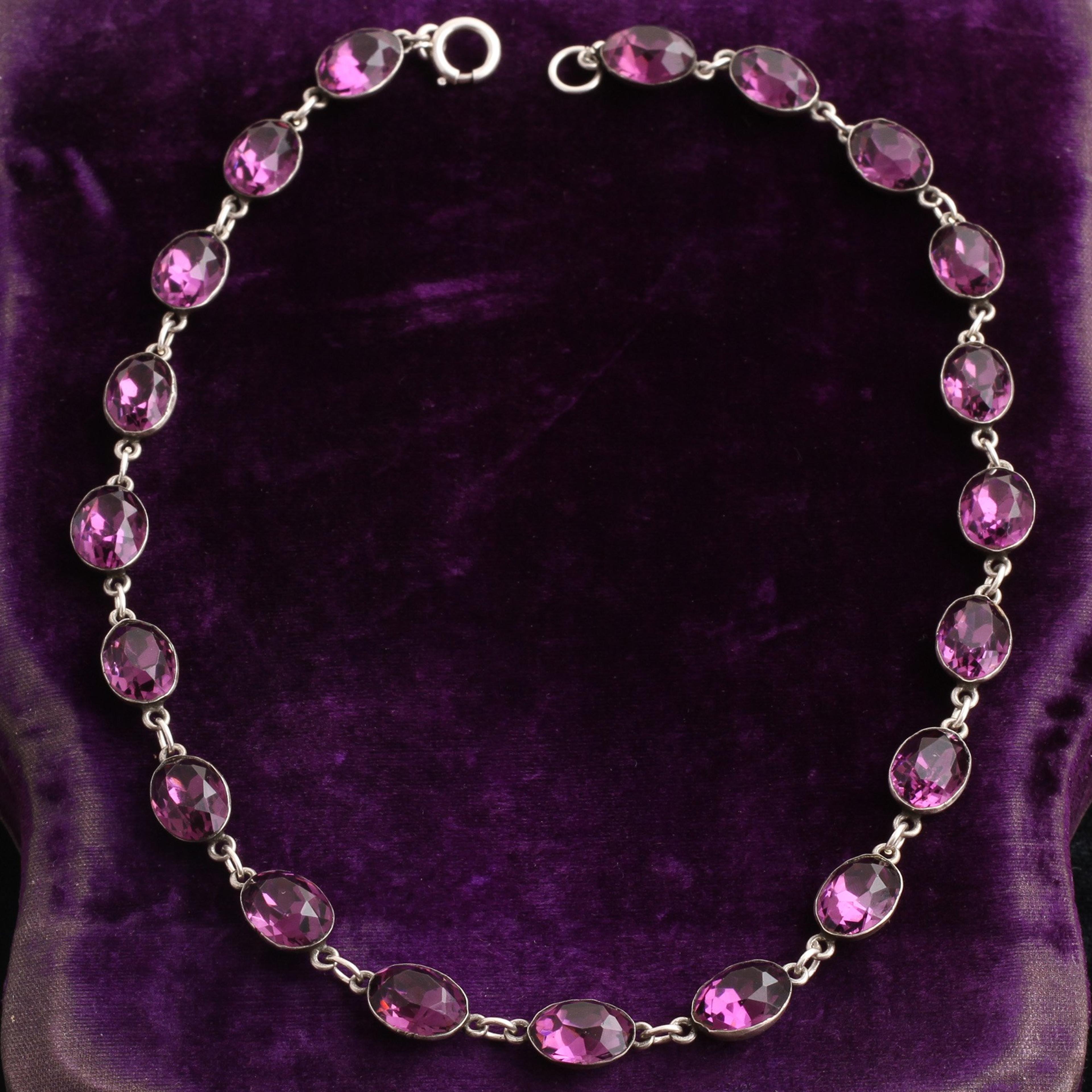 The rivière - named for the coastline of the French Riviera - is without a doubt the most popular and enduring styles of necklace born in the Georgian period. This style of necklace features an endless line of matched or subtly graduated gems set within inconspicuous collets. This Victorian variation is fashioned in silver with uniform size amethyst paste gems in Georgian-style dished settings.