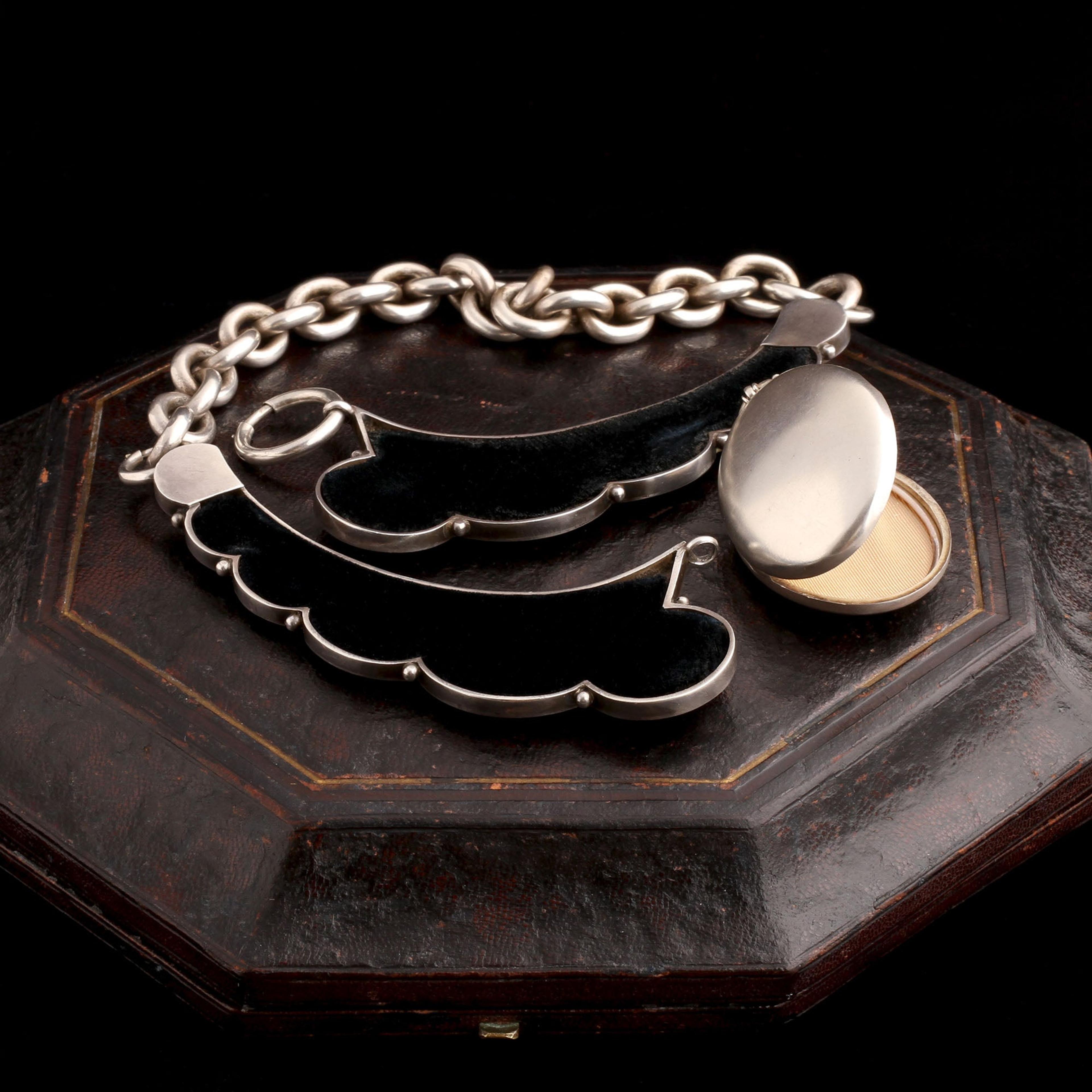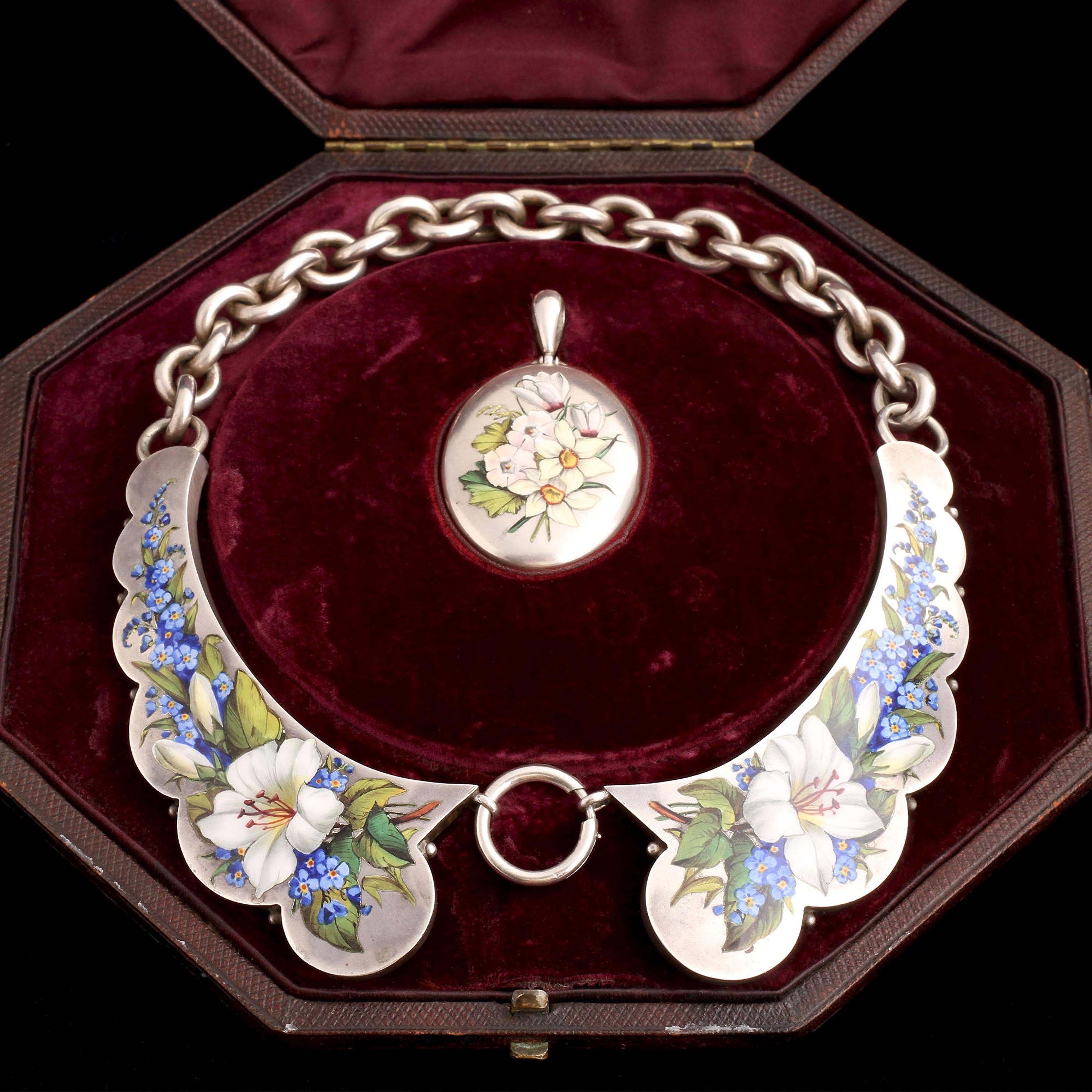 Once in a lifetime we see something like this enameled silver collar with detachable locket and original box. The more you look, the more different flowers you spot. The language of Floriography was a romantic, subtle method of communication in the Victorian era; speaking your feelings wasn't always appropriate, but feelings needed to be communicated nonetheless. The original silk velvet lining on the back is curved and ultra-soft to protect your collarbones.