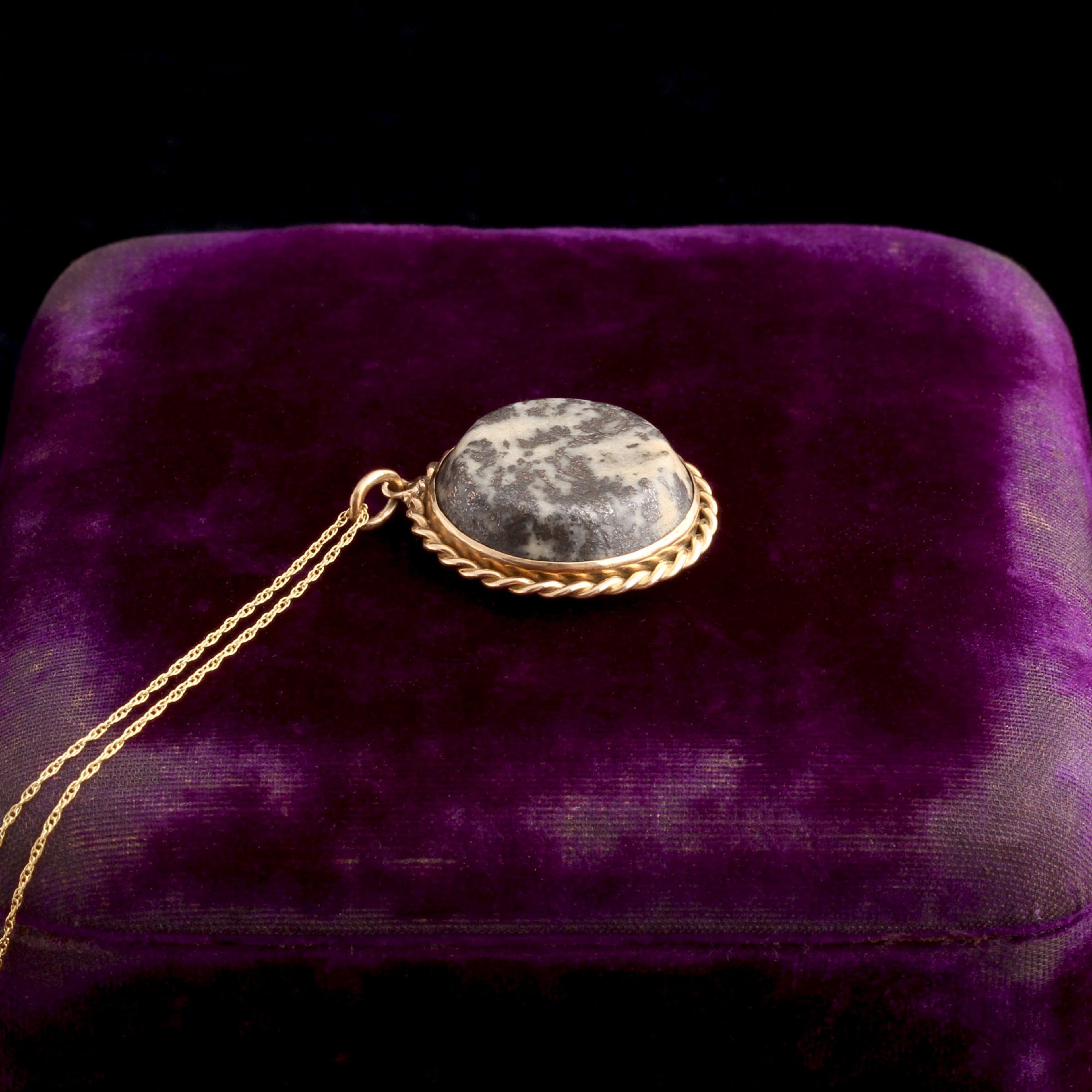 You may have heard of gold-in-quartz, a naturally ocurring material in which veins or particles of gold run through white or grey quartz. In the 19th century, jewelers turned these cool specimens into souvenirs with a gold rush flavor. Silver in quartz is just as pretty, and far less often seen. The contrast between the pale stone and the metallic veining is really striking.