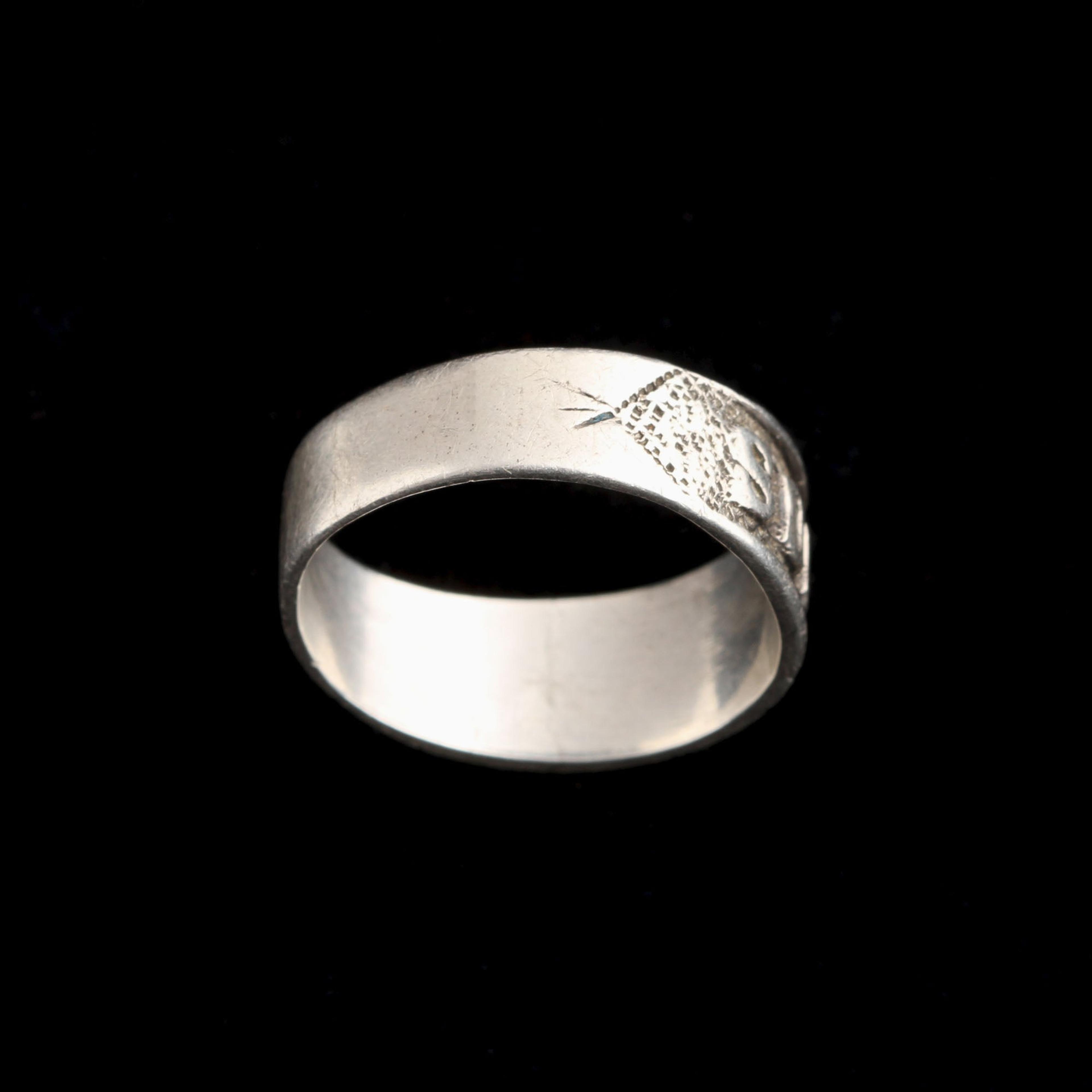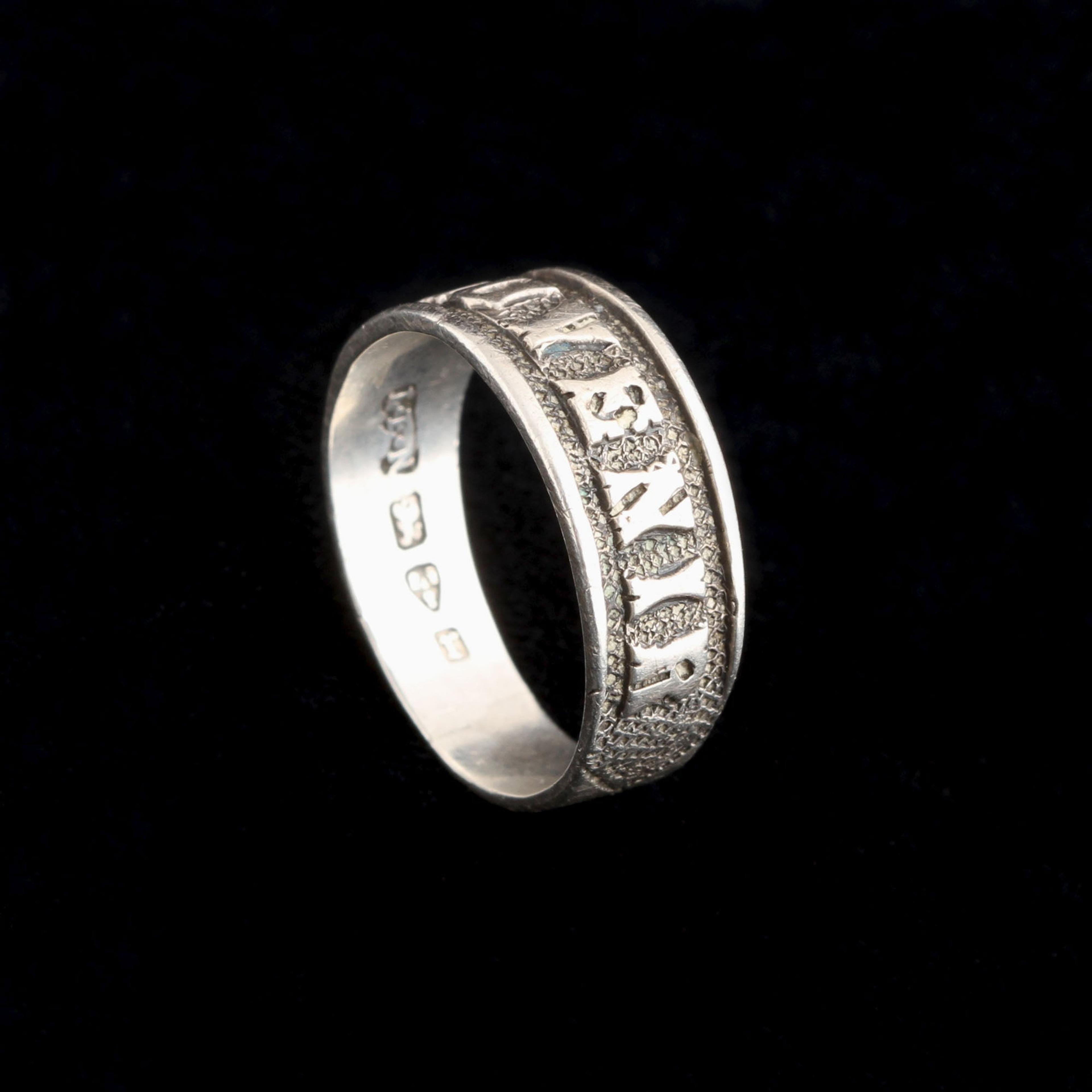 Souvenir rings like these were exchanged between friends and lovers as tokens of friendship and esteem. This one, in silver, was mass-produced at the end of the 19th century and marketed as an affordable choice for almost anyone in the UK to give as a gift. There are no hand-engraved details at all. Both the means of production and the materials (silver) were designed to be cheap and quick so they could be sold en masse at low prices. Fast fashion from 1880; the hallmarks also tell us it was made in Chester, an English city specializing in jewelry.