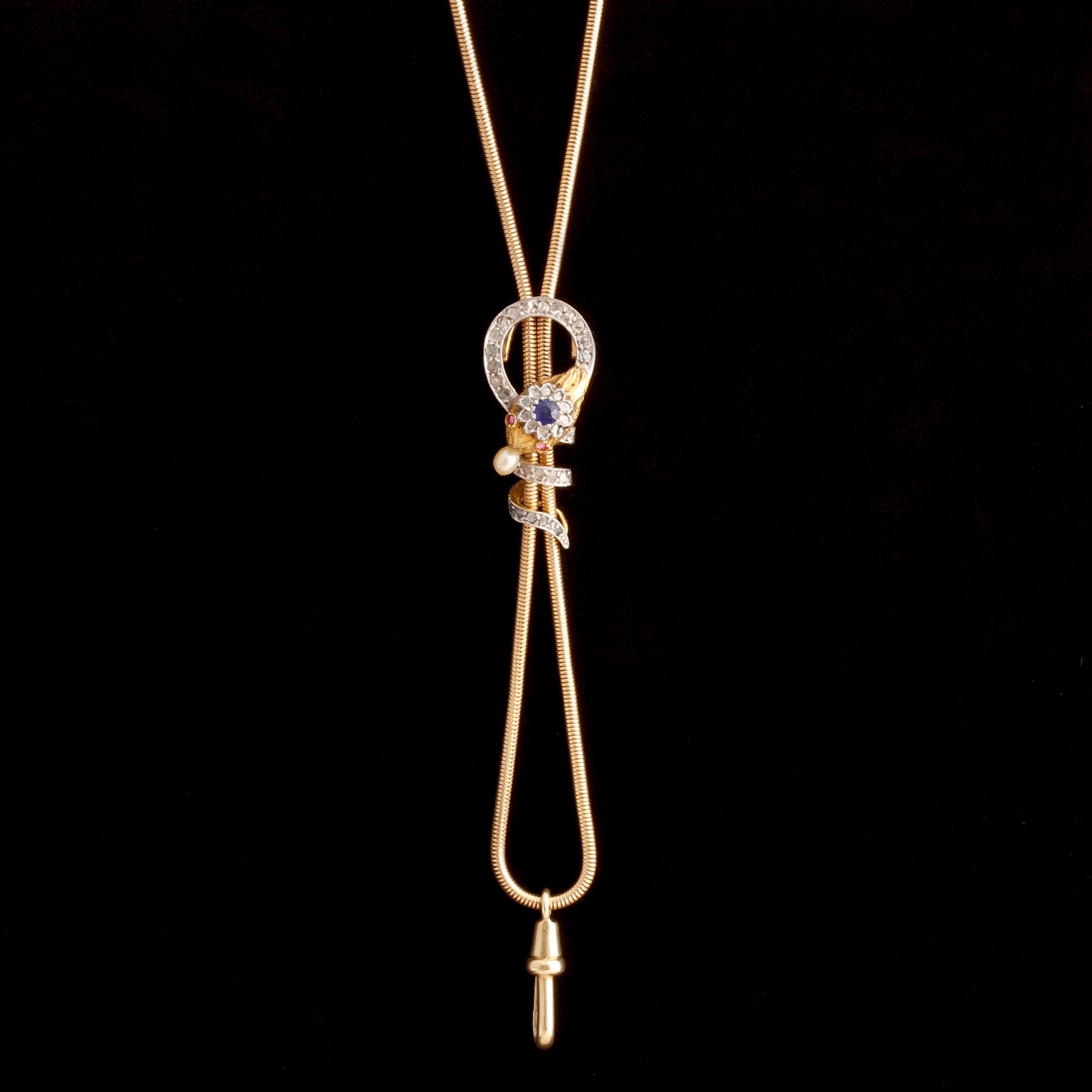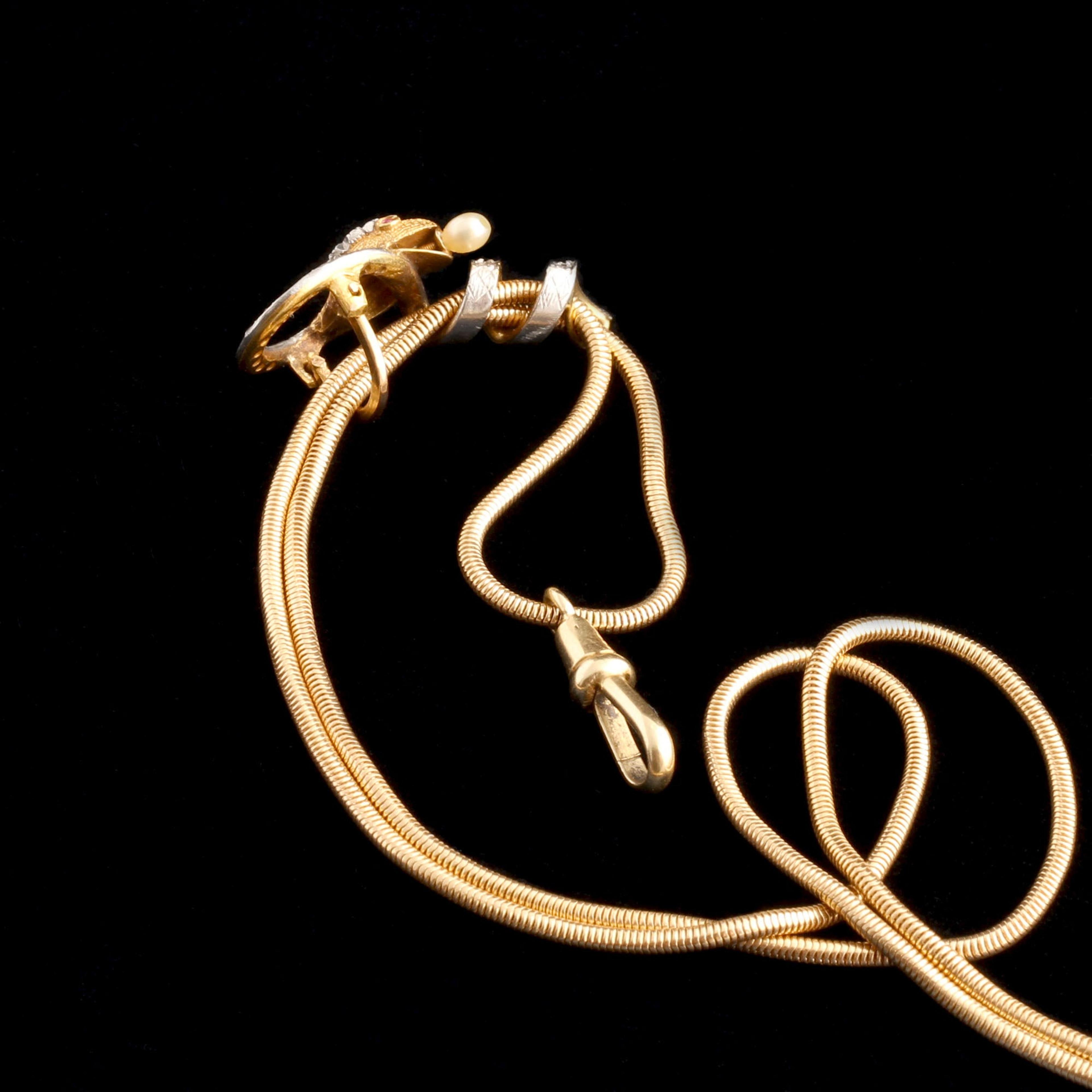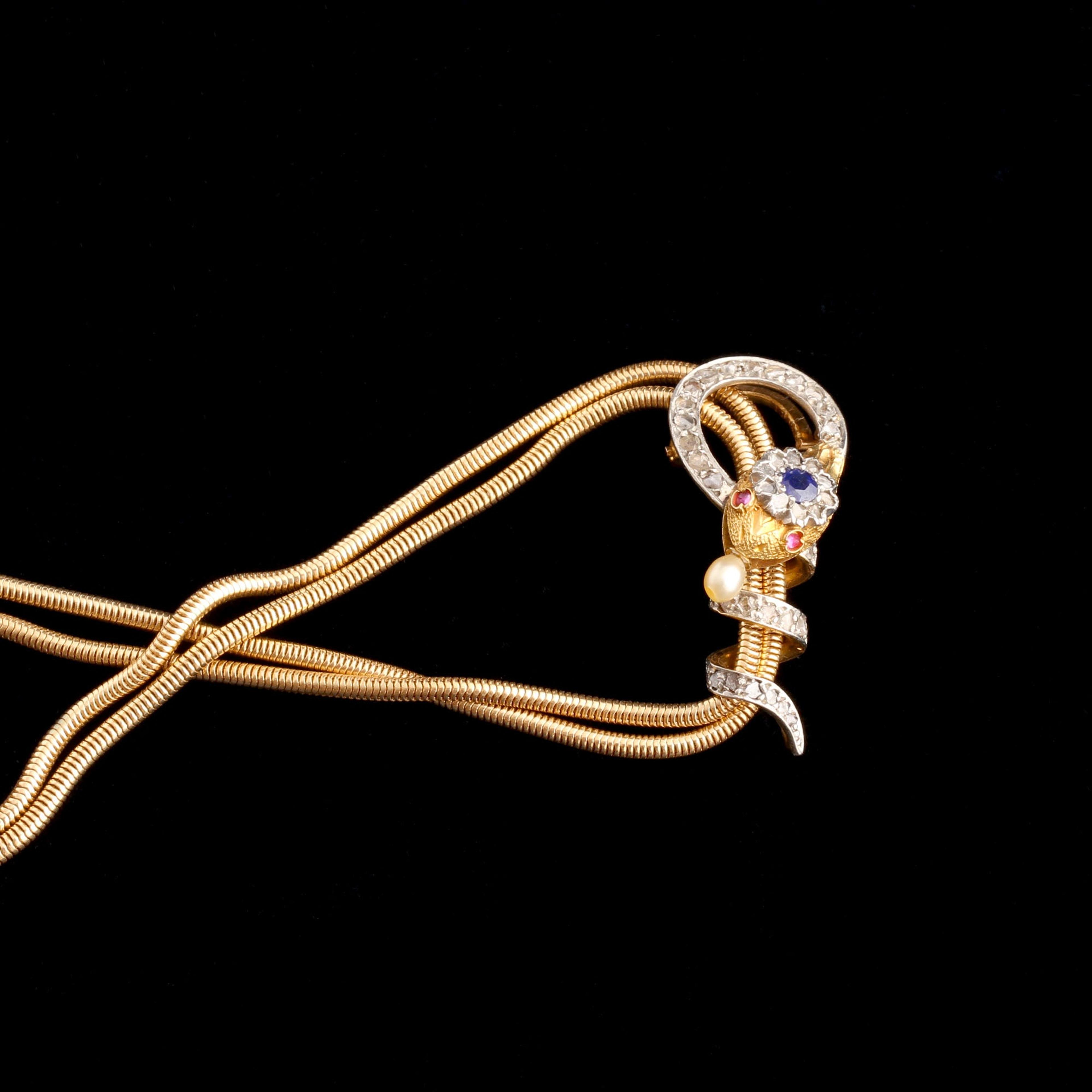 This snake, with French hallmarks, is being EXTRA. There is a hinged lever on the back which holds it in place (though it can move without opening the lever). A vintage chain is threaded through, lariat-style.
