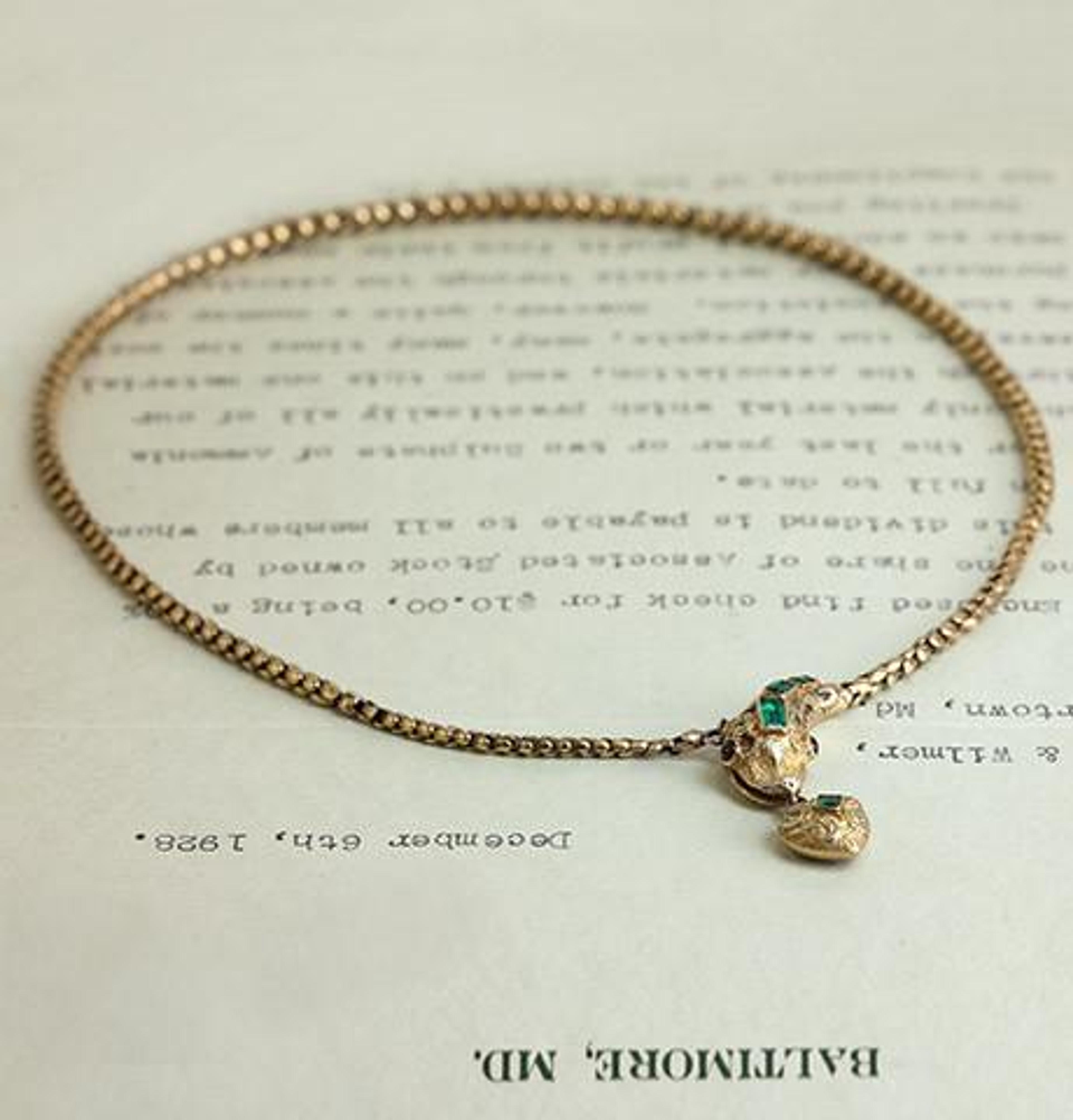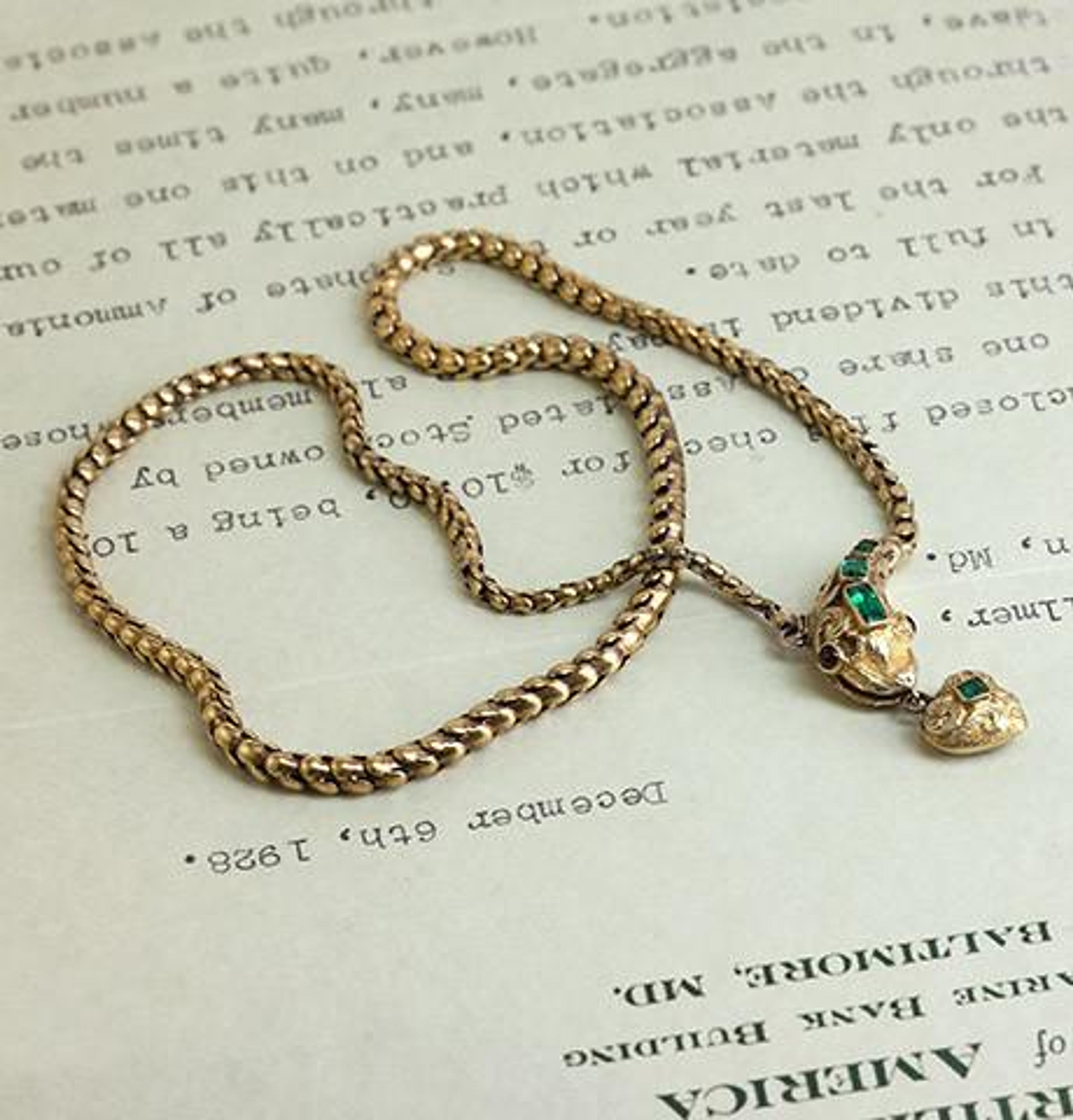 Over the past several millennia, the snake has been used to represent many things: both good and evil, fertility, passion, and rebirth. The Victorians employed the image of the snake as a symbol of everlasting love. Serpentine jewelry was at the height of it's popularity from about 1840 until the late 1860's. This stunning piece dates to that time - around 1860 - and illustrates the concept of eternal love beautifully, as he's holding a heart in his mouth. The necklace is 18k yellow gold with a 14.5" hand-forged chain which graduates up in size from the tip of the tail to the head of the snake. The repoussé head functions as the clasp and is chased with a beautiful swirling pattern. The snake's eyes are studded with almandine garnet cabochons, and the length of it's neck is set with table cut emeralds measuring approximately .05ct, .16ct, and .17ct. The heart-shaped locket is set with a single .04ct emerald.