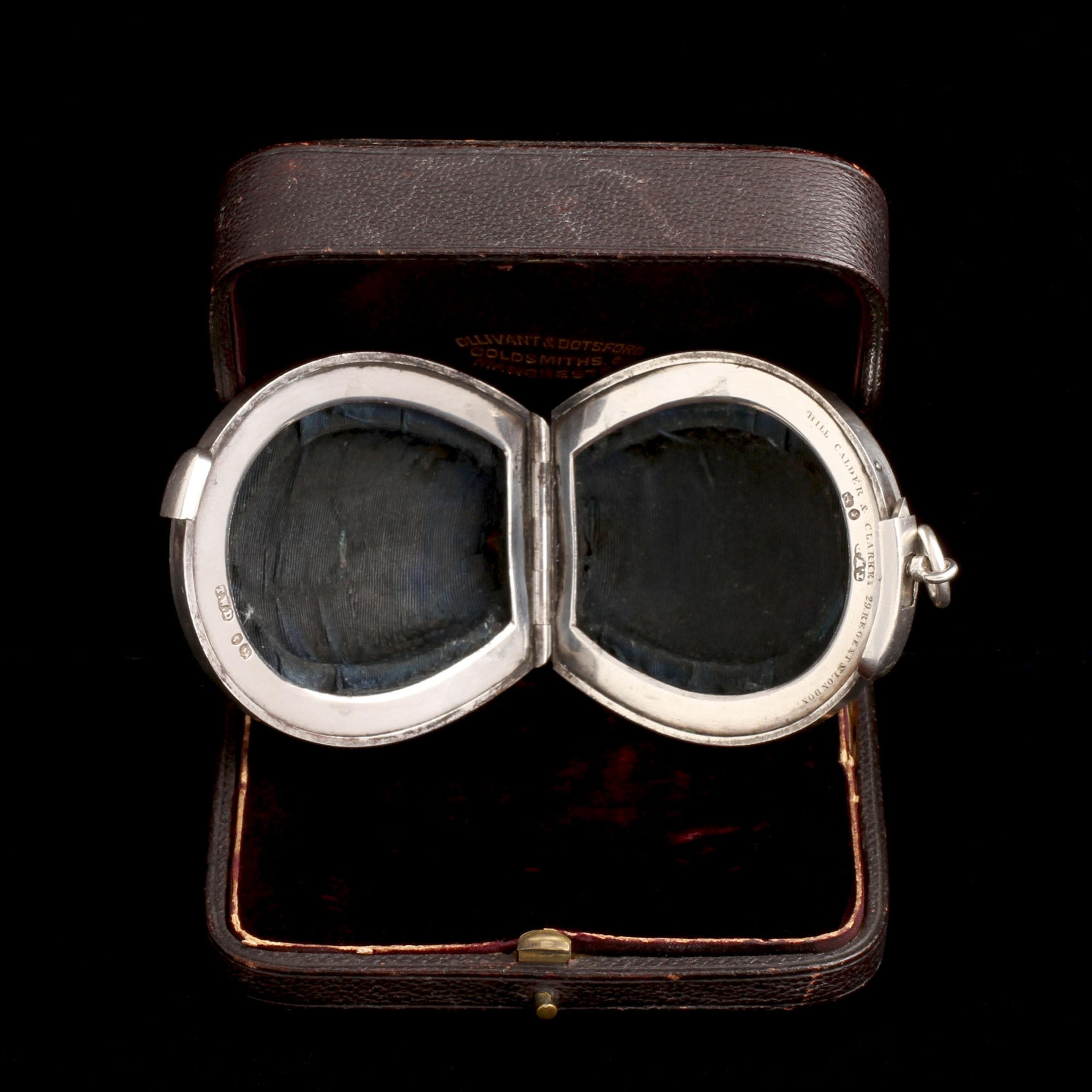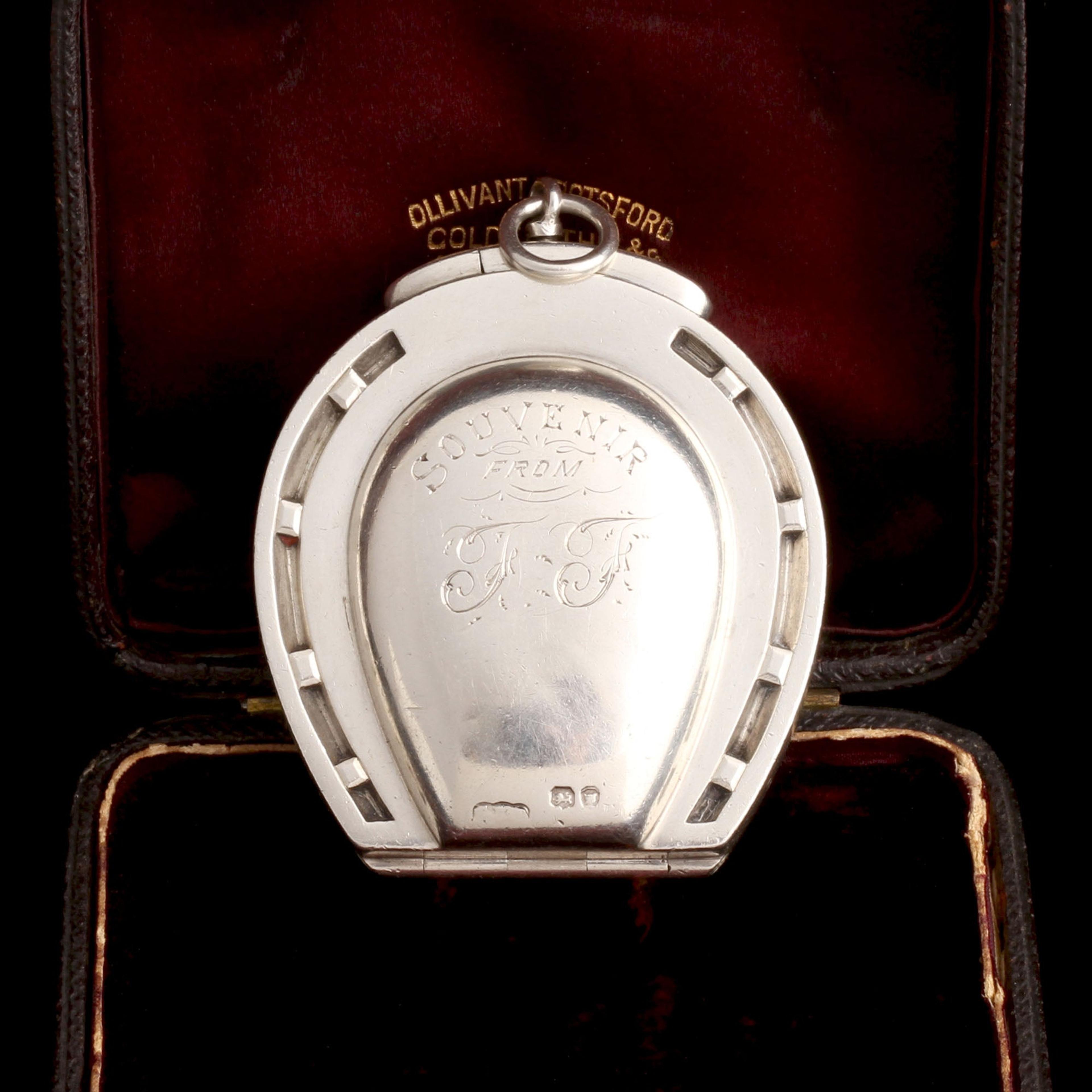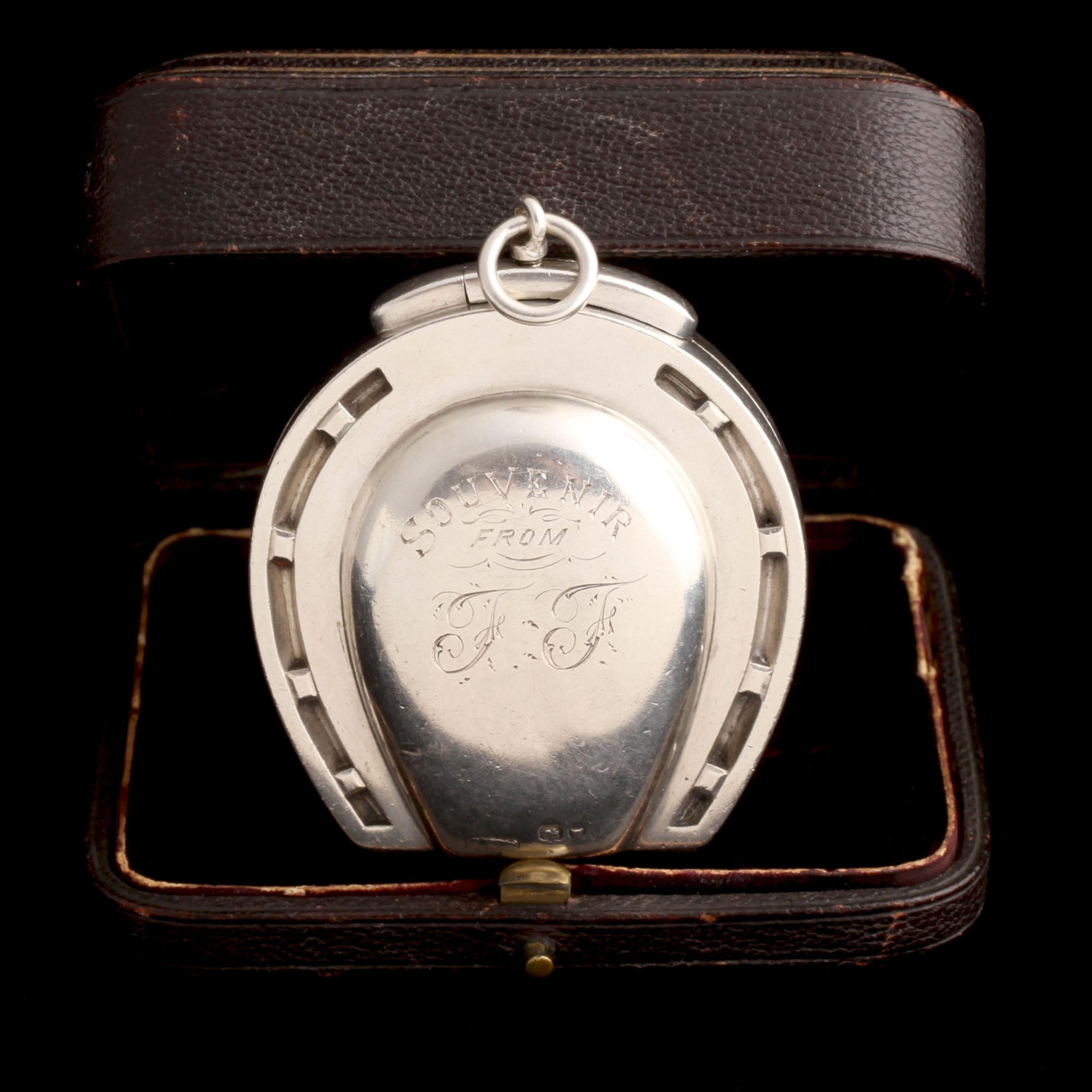 This thing is not a tiny charm, but probably was a trophy. The interior is lined with silk. It was made in London in 1865; we know this by the lion hallmark and the bust of young Queen Victoria/the letter k. Inside it's engraved "Hill Calder & Clarke 29 Regent St London". Tally-ho.