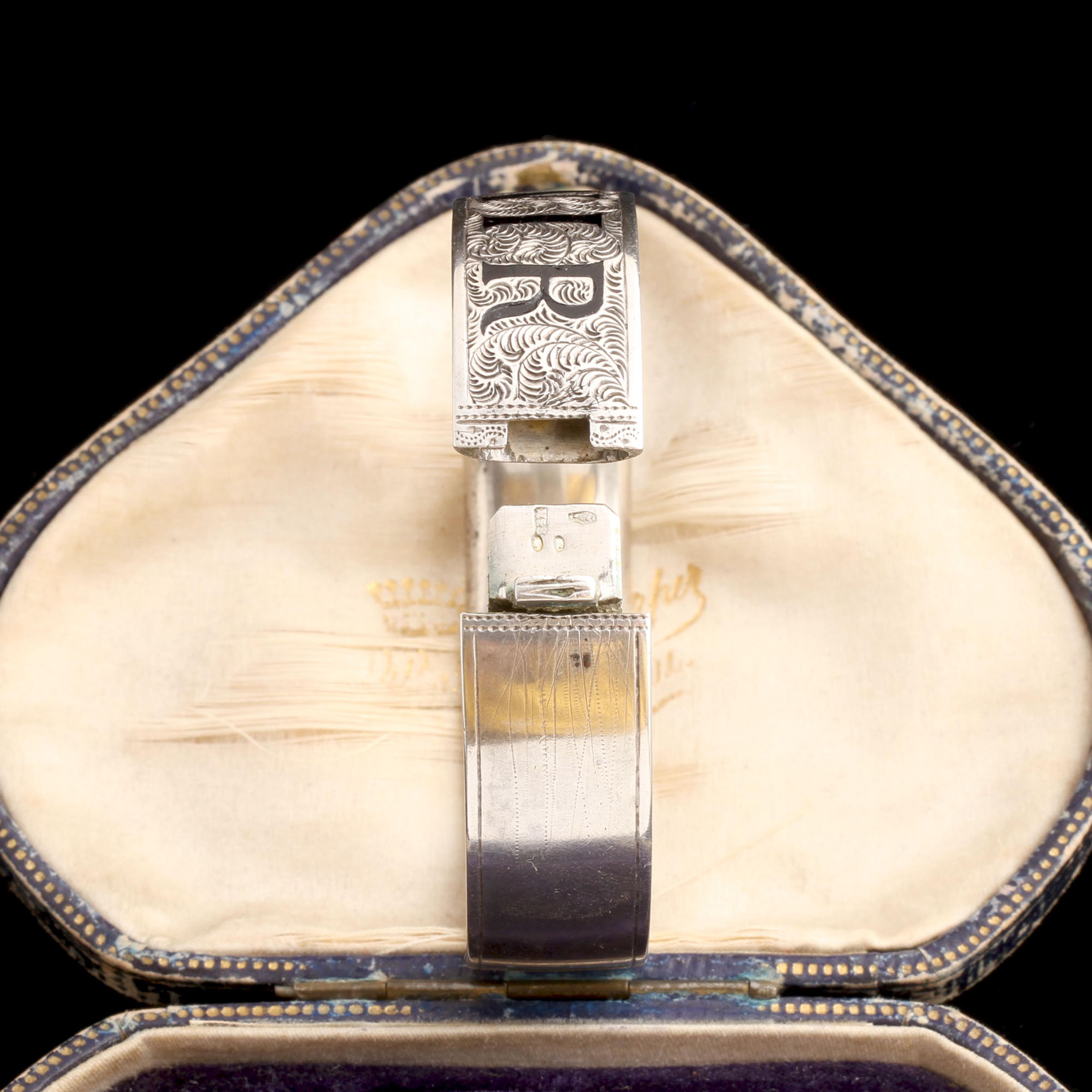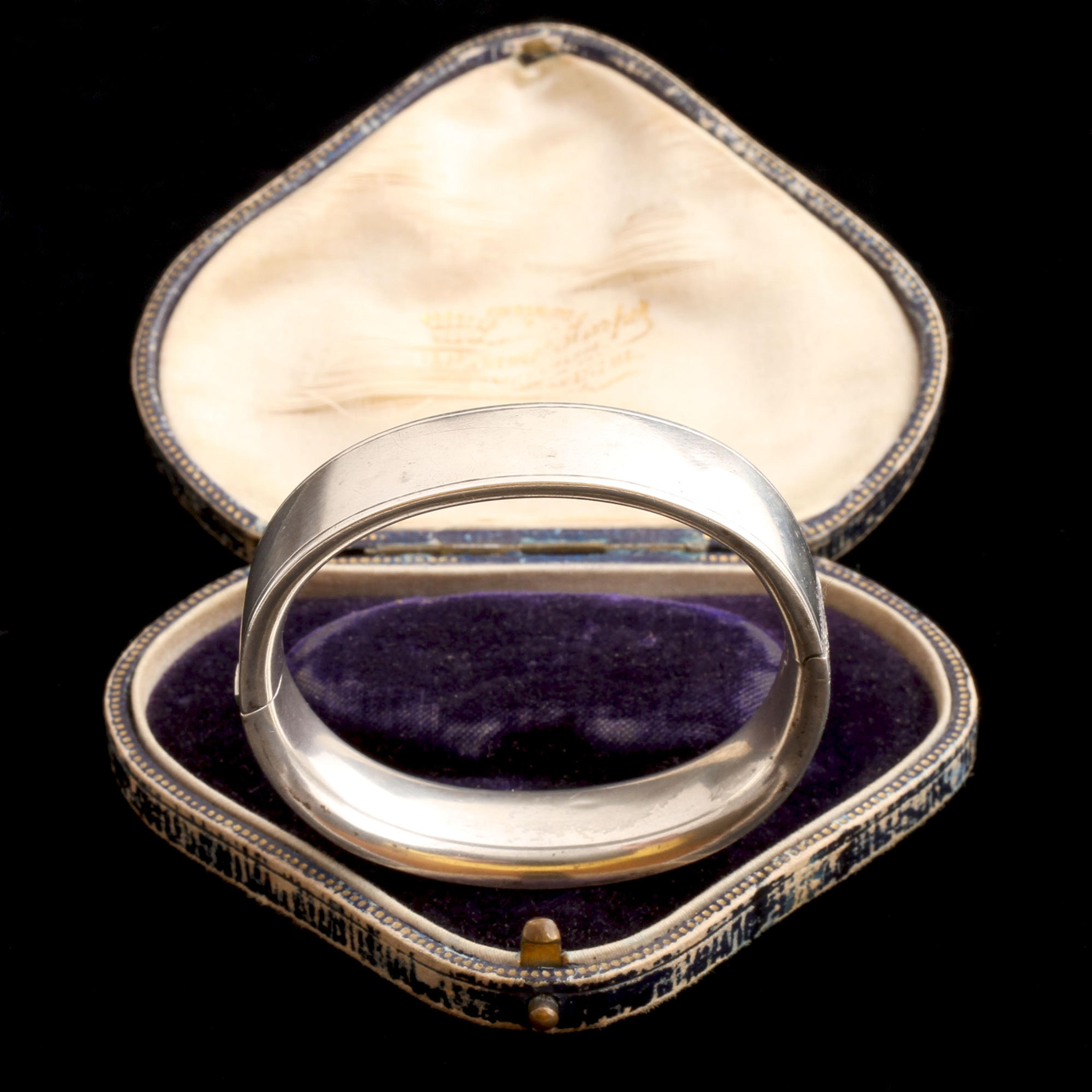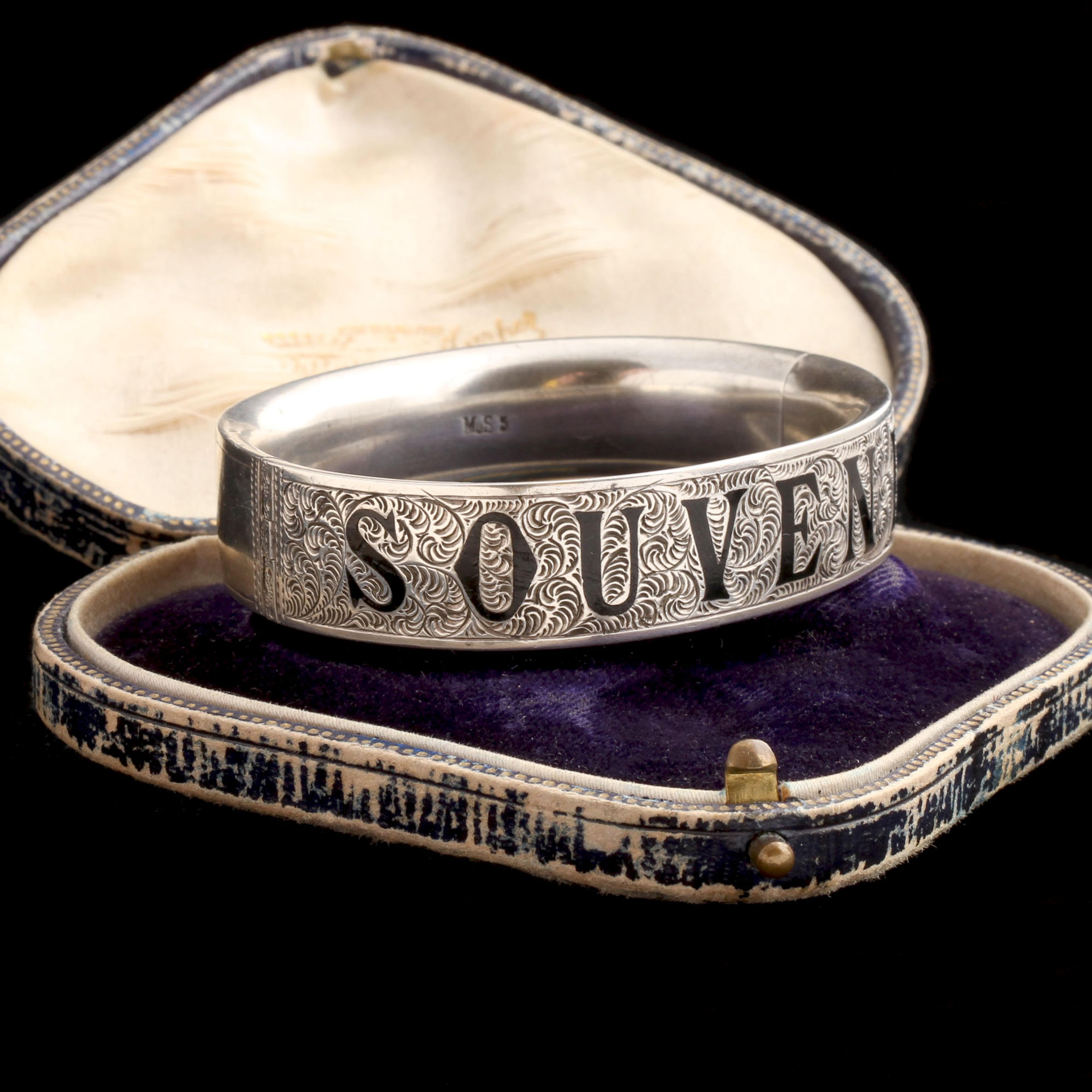 THIS TURN OF the 20th century silver bracelet makes its message loud and clear: SOUVENIR, boldly rendered in black enamel lettering across the front. Swirling, abstract engravings wrap around the band, adding movement and texture to the otherwise graphic, declarative face.