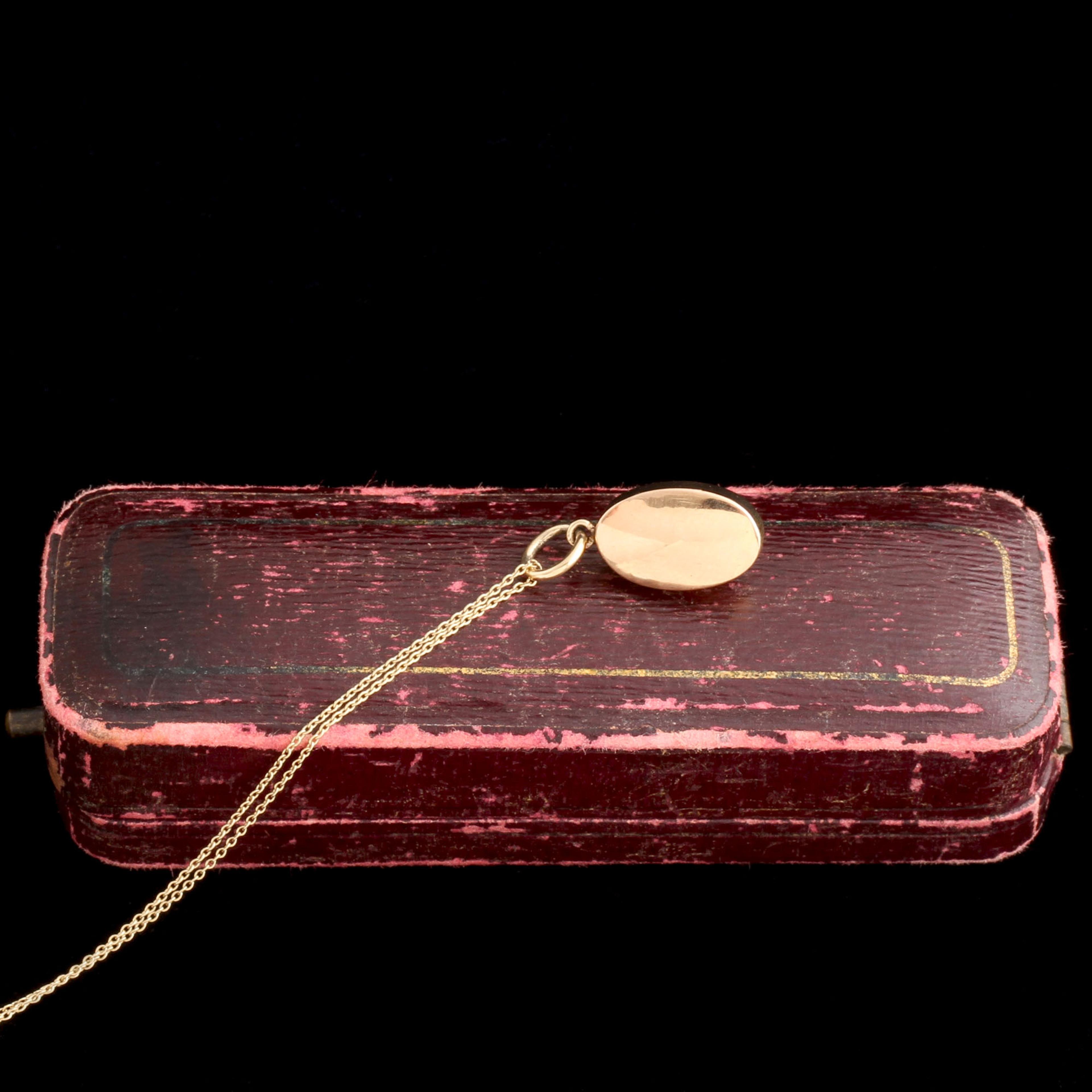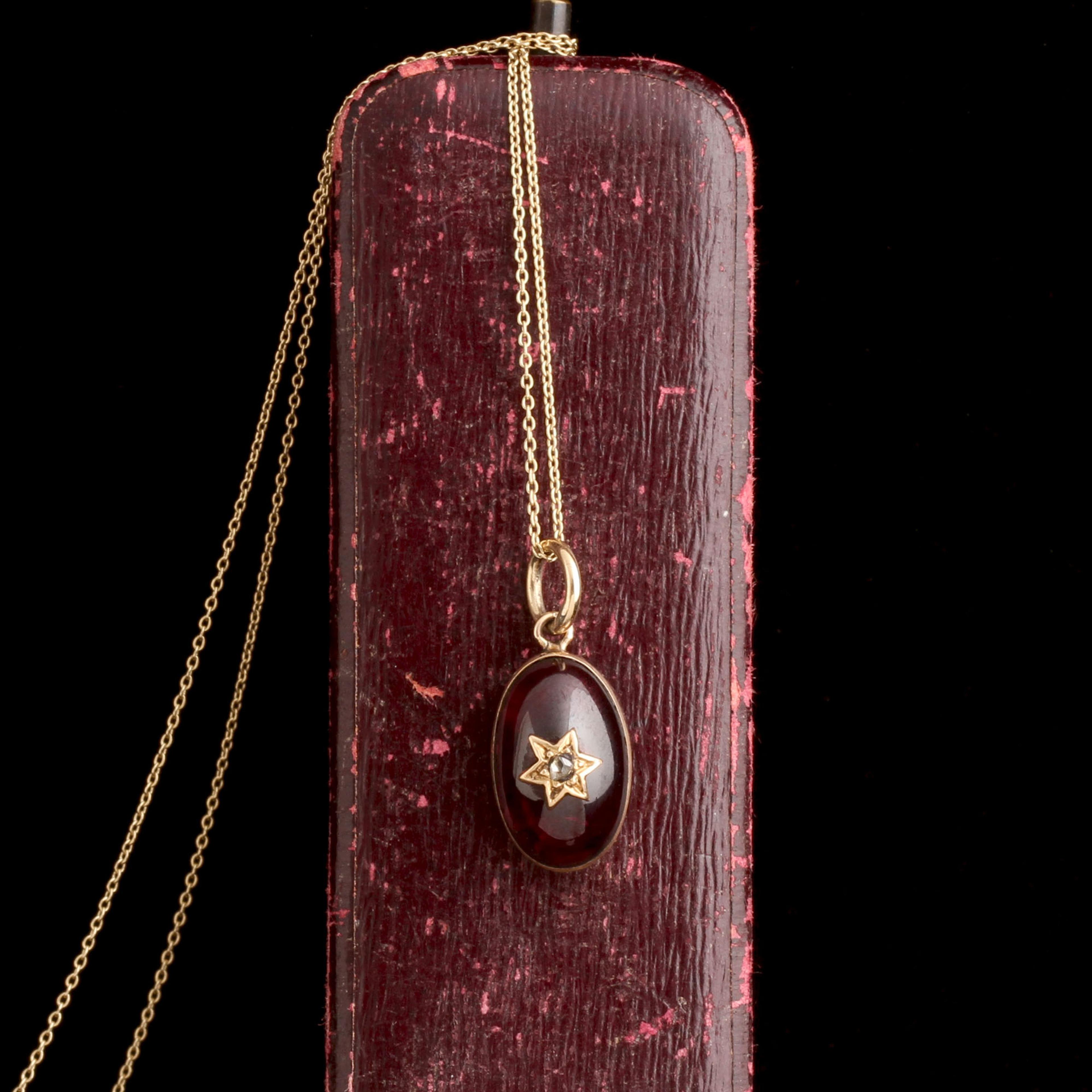 Hailing from the mid Victorian period, this petite oval pendant features a wine-colored garnet cabochon affixed star-set rose cut diamond.