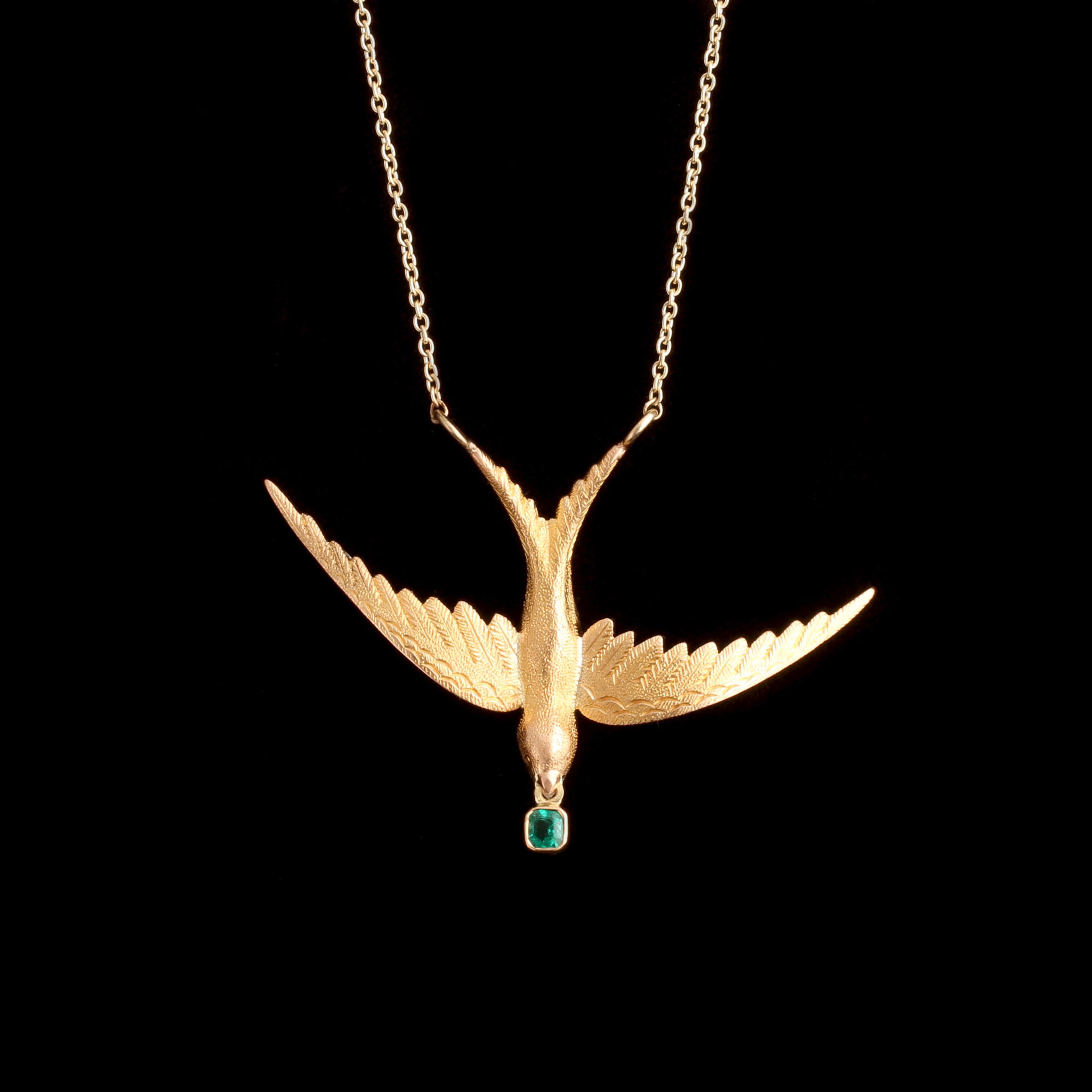 In the northern hemisphere the migration of the swallow is one of the early indications of spring and sign of the fertile period to come. According to lore, swallows were a welcome sight to voyage-weary sailors who believed the little birds prevented ships from getting lost and led them into safe harbor. Modeled in 15k gold with an emerald in its beak, this late Victorian swallow was once a brooch, we've removed the pin and added an 18" gold chain to make it into a necklace.