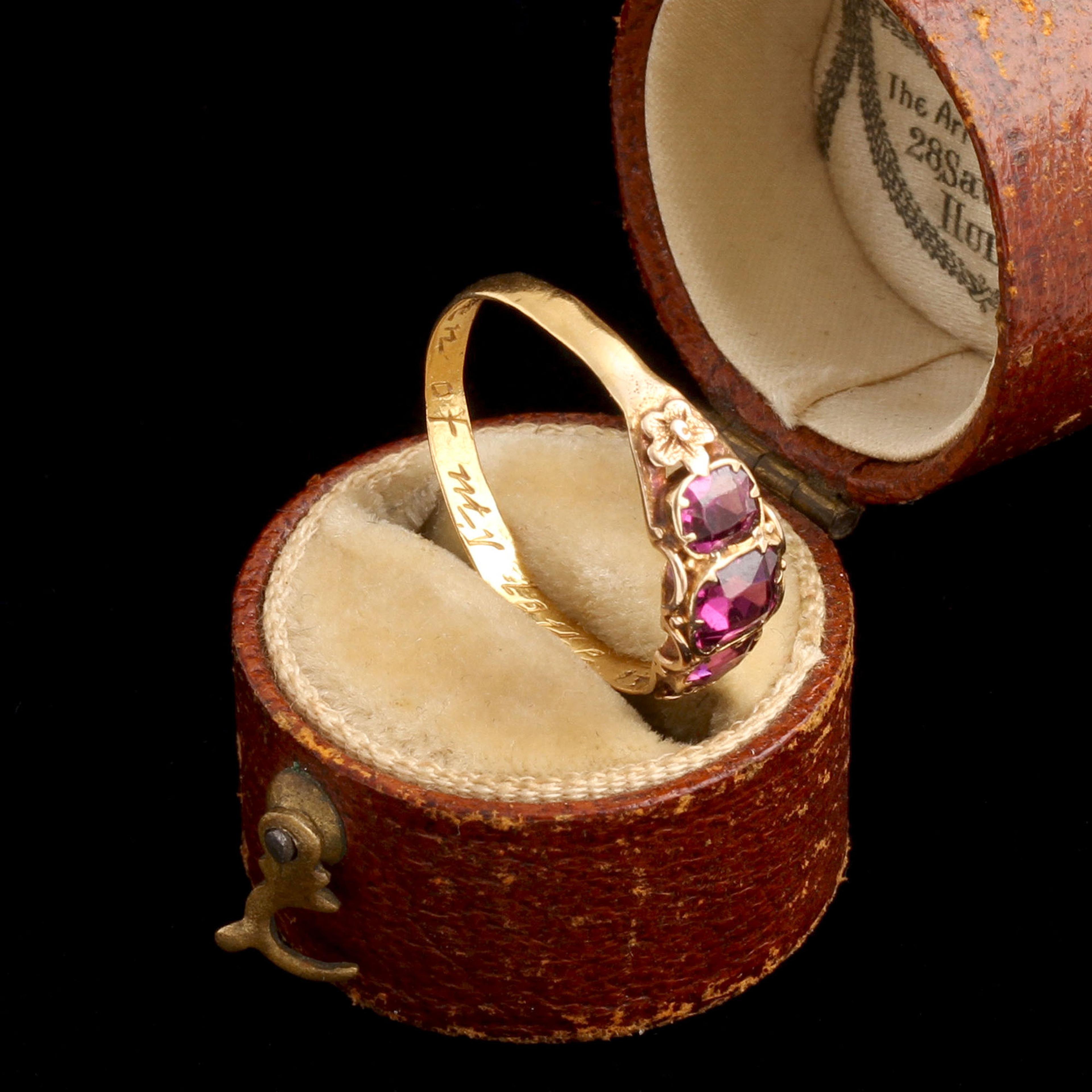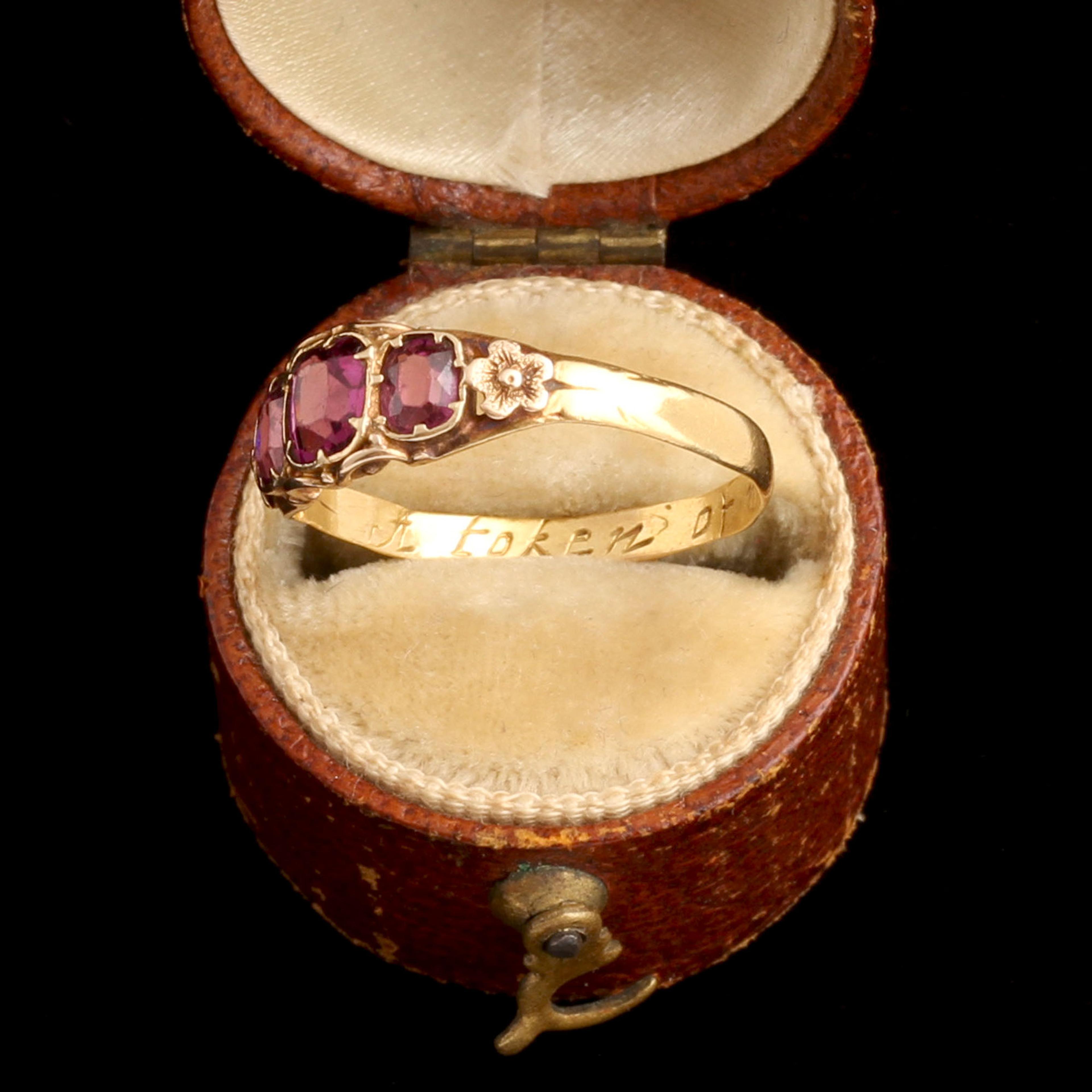 THIS RING began its life in the late 18th century as a gold posy ring, engraved inside with “A token of my love.” Rings like this were intensely personal and often marked marriages. Its survival suggests it was passed down within a family as an heirloom. Almost a century later in the mid Victorian period, the ring was thoughtfully altered. Three almandine garnets were added in a new gold face, updating the piece to suit contemporary taste while preserving the earlier shank and inscription. The modification reflected a desire to keep an inherited object relevant and wearable - we still do this today! The result is a layered piece of jewelry history, bearing the marks of two different eras.