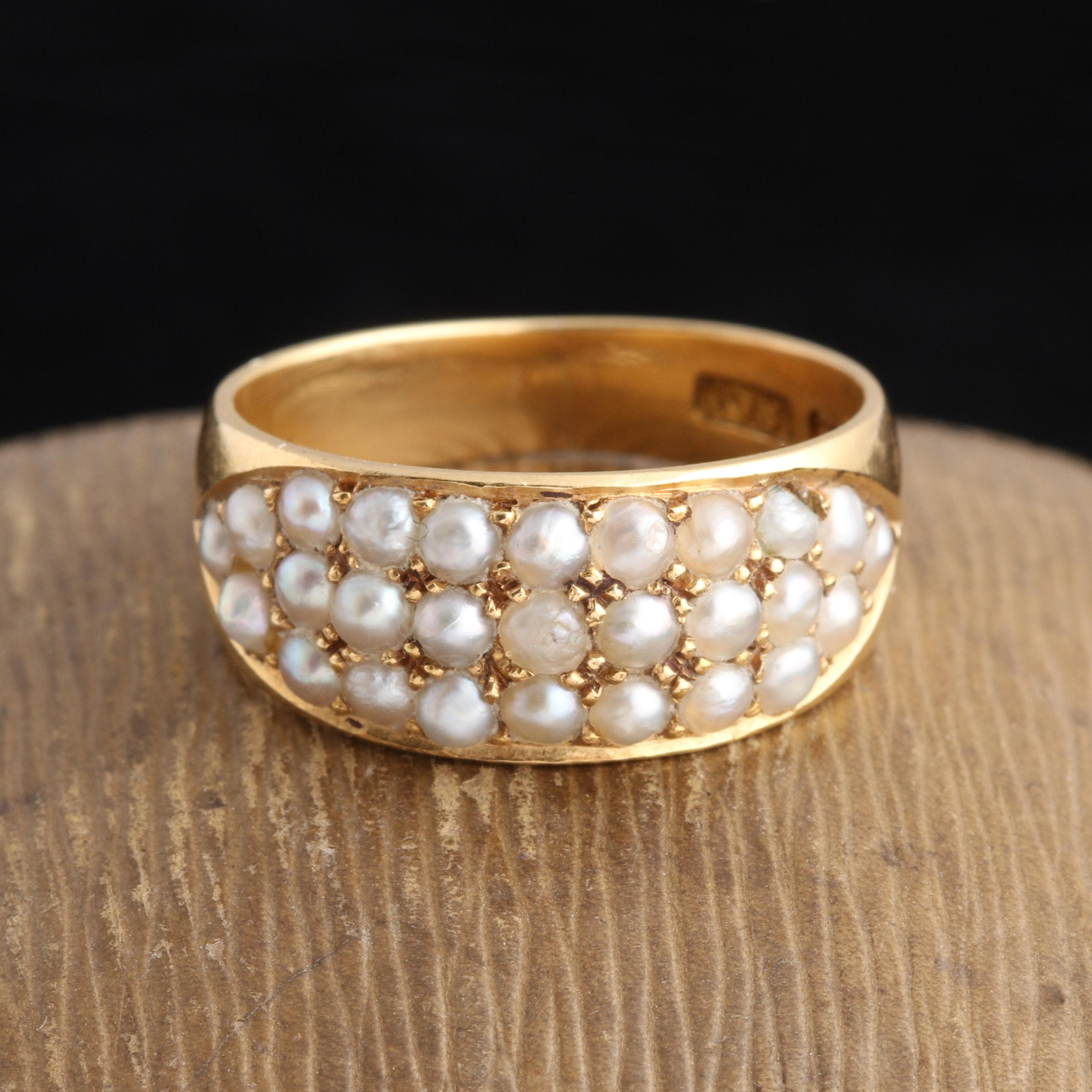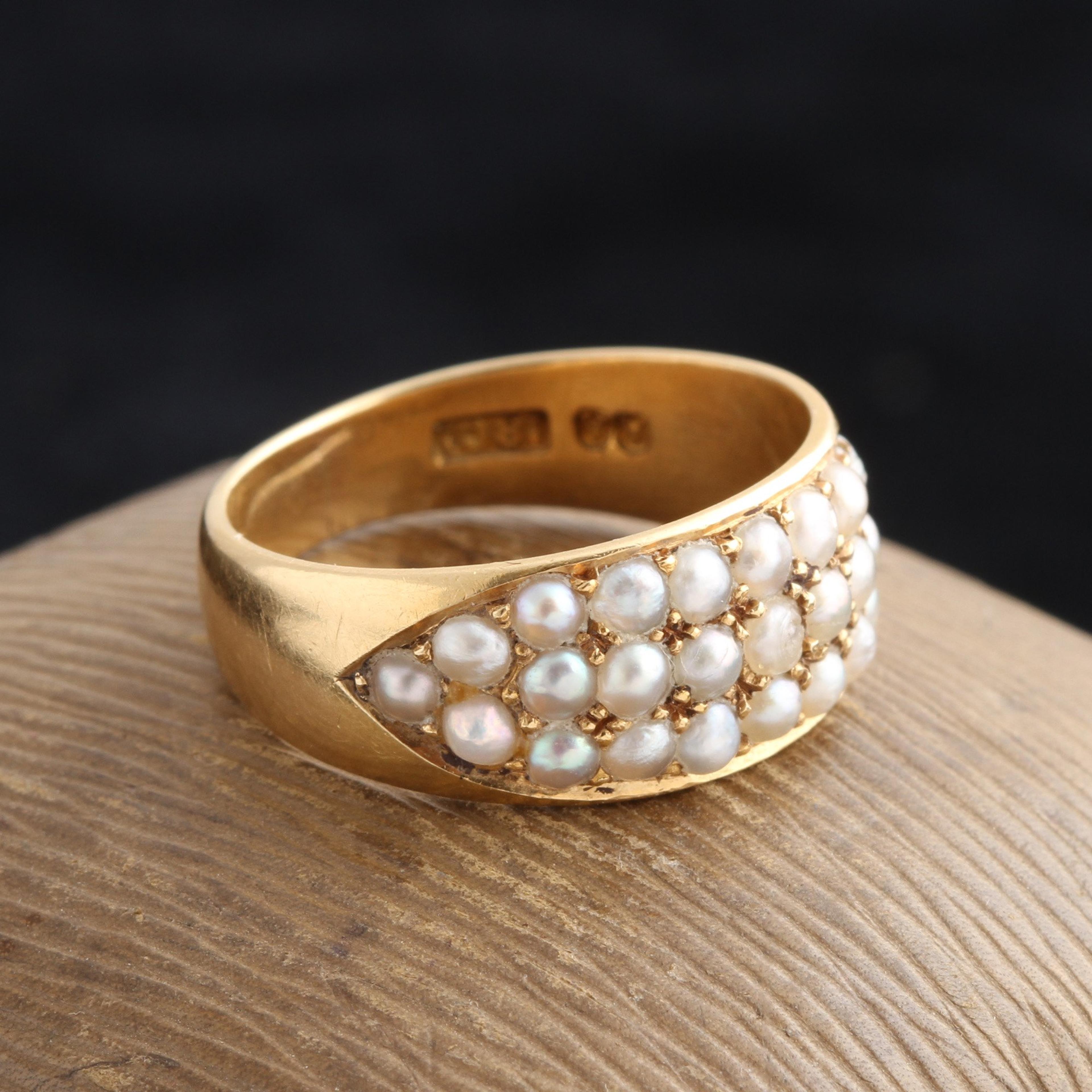 Hallmarked for the year 1890, this wide gold band is set with three rows of seed pearls which taper into crisp points at the shoulders. AA maker's mark.